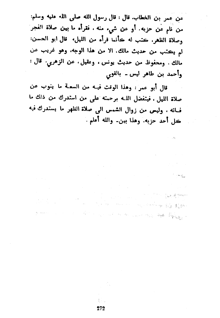 عَنْ عُمَرَ بْنِ الْخَطَّابِ قَالَ قَالَ رَسُولُ اللَّهِ صَلَّى اللَّهُ عَلَيْهِ وَسَلَّمَ مَنْ نَامَ عَنْ حِزْبِهِ أَوْ عَنْ شَيْءٍ مِنْهُ فَقَرَأَهُ مَا بَيْنَ صَلَاةِ الْفَجْرِ وَصَلَاةِ الظُّهْرِ كُتِبَ لَهُ كَأَنَّمَا قَرَأَهُ مِنَ اللَّيْلِ قَالَ أَبُو الْحَسَنِ لَمْ يُكْتَبْ مِنْ حَدِيثِ مَالِكٍ إِلَّا مِنْ هَذَا الْوَجْهِ وَهُوَ غَرِيبٌ عَنْ مَالِكٍ وَمَحْفُوظٌ مِنْ حَدِيثِ يُونُسَ وَعُقَيْلٍ عَنِ الزُّهْرِيِّ قَالَ وَأَحْمَدُ بْنُ طَاهِرٍ لَيْسَ بِالْقَوِيِّ قَالَ أَبُو عُمَرَ وَهَذَا الْوَقْتُ فِيهِ مِنَ السَّعَةِ مَا يَنُوبُ عَنْ صَلَاةِ اللَّيْلِ فَيَتَفَضَّلُ اللَّهُ بِرَحْمَتِهِ عَلَى مَنِ اسْتَدْرَكَ مِنْ ذَلِكَ مَا فَاتَهُ وَلَيْسَ مِنْ زَوَالِ الشَّمْسِ إِلَى صَلَاةِ الظُّهْرِ مَا يَسْتَدْرِكُ فِيهِ كُلُّ أَحَدٍ حِزْبَهُ وَهَذَا بَيِّنٌ وَاللَّهُ أَعْلَمُ