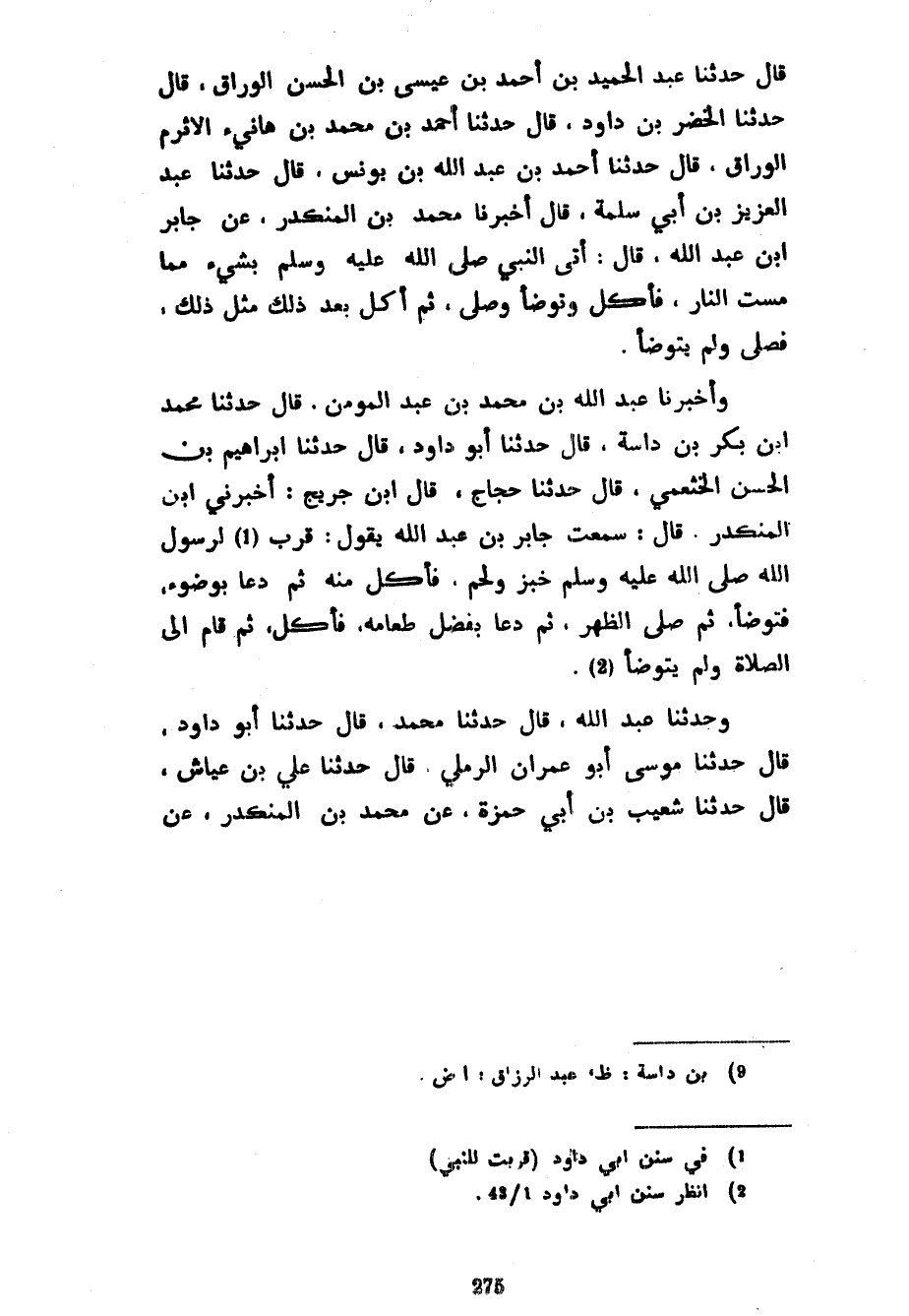 قَالَ حَدَّثَنَا عَبْدُ الْحَمِيدِ بْنُ أَحْمَدَ بْنِ عِيسَى بْنِ الْحَسَنِ الْوَرَّاقُ قَالَ حَدَّثَنَا الْخَضِرُ بْنُ دَاوُدَ قَالَ حَدَّثَنَا أَحْمَدُ بْنُ مُحَمَّدِ بْنِ هَانِئٍ الْأَثْرَمُ الْوَرَّاقُ قَالَ حَدَّثَنَا أَحْمَدُ بْنُ عَبْدِ اللَّهِ بْنِ يُونُسَ قَالَ حَدَّثَنَا عَبْدُ الْعَزِيزِ بْنُ أَبِي سَلَمَةَ قَالَ أَخْبَرَنَا مُحَمَّدِ بْنِ الْمُنْكَدِرِ عَنْ جَابِرِ بْنِ عَبْدِ اللَّهِ قَالَ أَتَى النَّبِيَّ صَلَّى اللَّهُ عَلَيْهِ وَسَلَّمَ بِشَيْءٍ مِمَّا مَسَّتِ النَّارُ فَأَكَلَ وَتَوَضَّأَ وَصَلَّى ثُمَّ أَكَلَ بَعْدَ ذَلِكَ مِثْلَ ذَلِكَ فَصَلَّى وَلَمْ يَتَوَضَّأْ وَأَخْبَرَنَا عَبْدُ اللَّهِ بْنُ مُحَمَّدِ بْنِ عَبْدِ الْمُؤْمِنِ قَالَ حَدَّثَنَا مُحَمَّدُ بْنُ بَكْرِ بْنِ دَاسَةَ قَالَ حَدَّثَنَا أَبُو دَاوُدَ قَالَ حَدَّثَنَا إِبْرَاهِيمُ بْنُ الْحَسَنِ الْخَثْعَمِيُّ قَالَ حَدَّثَنَا حَجَّاجٌ قَالَ ابْنُ جُرَيْجٍ أَخْبَرَنِي ابْنِ الْمُنْكَدِرِ قَالَ سَمِعْتُ جَابِرَ بْنَ عَبْدِ اللَّهِ يَقُولُ قُرِّبَ لِرَسُولِ اللَّهِ صَلَّى اللَّهُ عَلَيْهِ وَسَلَّمَ خُبْزٌ وَلَحْمٌ فَأَكَلَ مِنْهُ ثُمَّ دَعَا بِوَضُوءٍ فَتَوَضَّأَ ثُمَّ صَلَّى الظُّهْرَ ثُمَّ دَعَا بِفَضْلِ طَعَامِهِ فَأَكَلَ ثُمَّ قَامَ إِلَى الصَّلَاةِ وَلَمْ يَتَوَضَّأْ وَحَدَّثَنَا عَبْدُ اللَّهِ قَالَ حَدَّثَنَا مُحَمَّدٍ قَالَ حَدَّثَنَا أَبُو دَاوُدَ قَالَ حَدَّثَنَا مُوسَى أَبُو عِمْرَانَ الرَّمْلِيُّ قَالَ حَدَّثَنَا عَلَيُّ بْنُ عَيَّاشٍ قَالَ حَدَّثَنَا شُعَيْبُ بْنُ أَبِي حَمْزَةَ عَنْ مُحَمَّدِ بْنِ الْمُنْكَدِرِ عَنْ