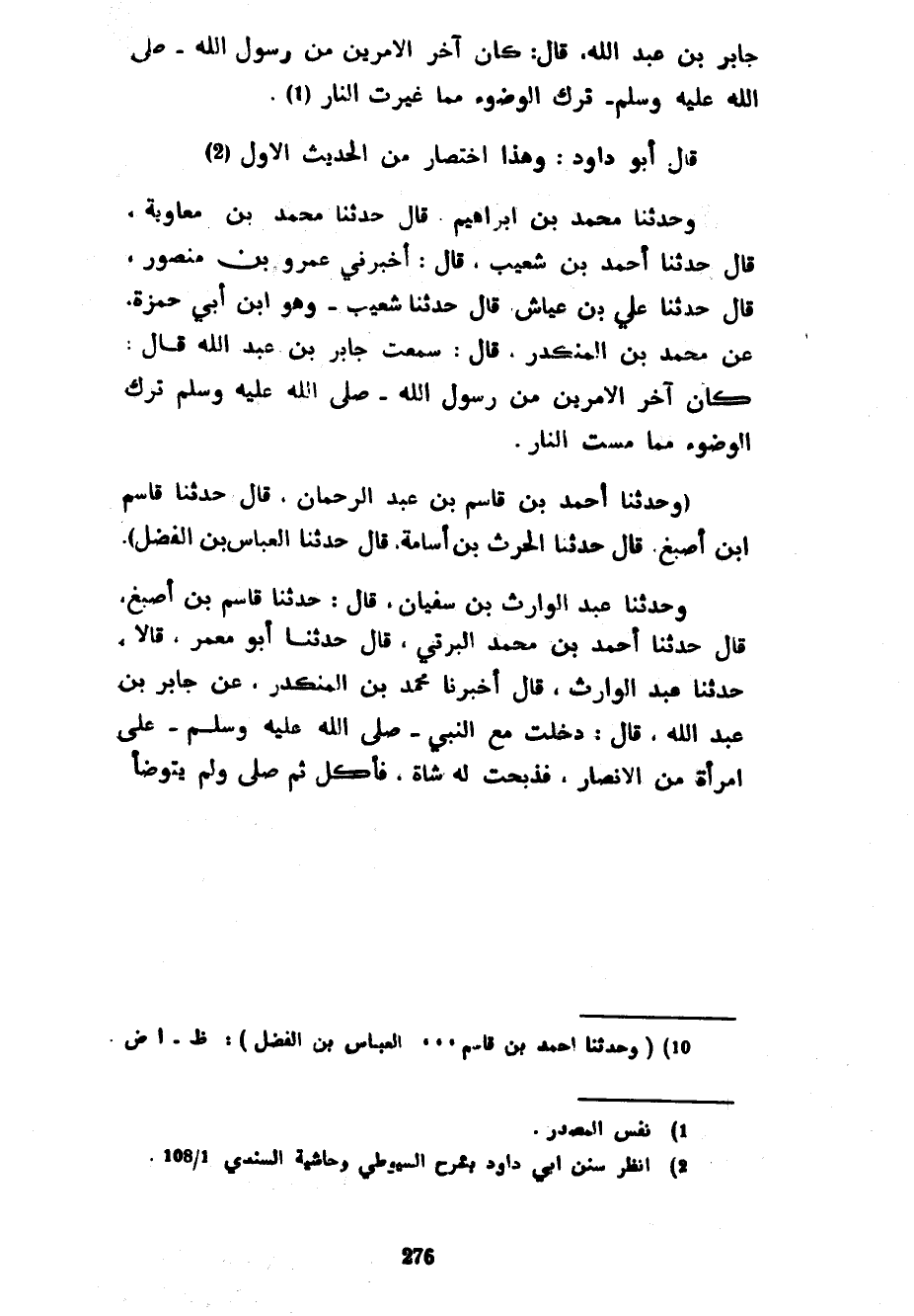 جَابِرِ بْنِ عَبْدِ اللَّهِ قَالَ كَانَ آخِرُ الْأَمْرَيْنِ مِنْ رَسُولِ اللَّهِ صَلَّى اللَّهُ عَلَيْهِ وَسَلَّمَ تَرْكَ الْوُضُوءِ مِمَّا غَيَّرَتِ النَّارُ قَالَ أَبُو دَاوُدَ وَهَذَا اخْتِصَارٌ مِنَ الْحَدِيثِ الْأَوَّلِ وَحَدَّثَنَا مُحَمَّدُ بْنُ إِبْرَاهِيمَ قَالَ حَدَّثَنَا مُحَمَّدُ بْنُ مُعَاوِيَةَ قَالَ حَدَّثَنَا أَحْمَدُ بْنُ شُعَيْبٍ قَالَ أَخْبَرَنِي عَمْرُو بْنُ مَنْصُورٍ قَالَ حَدَّثَنَا عَلَيُّ بْنُ عَيَّاشٍ قَالَ حَدَّثَنَا شُعَيْبٌ وَهُوَ ابْنُ أَبِي حَمْزَةَ عَنْ مُحَمَّدِ بْنِ الْمُنْكَدِرِ قَالَ سَمِعْتُ جَابِرَ بْنَ عَبْدِ اللَّهِ قَالَ كَانَ آخِرُ الْأَمْرَيْنِ مِنْ رَسُولِ اللَّهِ صَلَّى اللَّهُ عَلَيْهِ وَسَلَّمَ تَرْكَ الْوُضُوءِ مِمَّا مَسَّتِ النَّارُ (وَحَدَّثَنَا أَحْمَدُ بْنُ قَاسِمِ بْنِ عَبْدِ الرحمان قَالَ حَدَّثَنَا قَاسِمُ بْنُ أَصْبَغَ قَالَ حَدَّثَنَا الْحَرْثُ بْنُ أُسَامَةَ قَالَ حَدَّثَنَا الْعَبَّاسُ بْنُ الْفَضْلِ) وَحَدَّثَنَا عَبْدُ الْوَارِثِ بْنُ سُفْيَانَ قَالَ حَدَّثَنَا قَاسِمُ بْنُ أَصْبَغَ قَالَ حَدَّثَنَا أَحْمَدُ بْنُ مُحَمَّدٍ الْبِرْتِيُّ قَالَ حَدَّثَنَا أَبُو مَعْمَرٍ قَالَا حَدَّثَنَا عَبْدُ الْوَارِثِ قَالَ أَخْبَرَنَا مُحَمَّدِ بْنِ الْمُنْكَدِرِ عَنْ جَابِرِ بْنِ عَبْدِ الله قَالَ دَخَلْتُ مَعَ النَّبِيِّ صَلَّى اللَّهُ عَلَيْهِ وَسَلَّمَ عَلَى امْرَأَةٍ مِنَ الْأَنْصَارِ فَذَبَحَتْ لَهُ شَاةً فَأَكَلَ ثُمَّ صَلَّى وَلَمْ يَتَوَضَّأْ