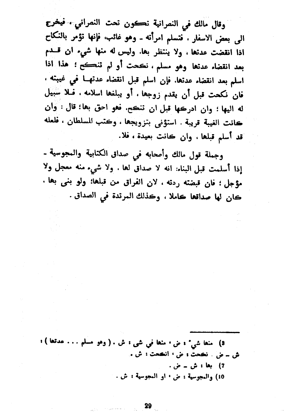 وقال مالك في النصرانية تكون تحت النصراني فَيَخْرُجُ إِلَى بَعْضِ الْأَسْفَارِ فَتُسْلِمُ امْرَأَتُهُ وَهُوَ غَائِبٌ فَإِنَّهَا تُؤْمَرُ بِالنِّكَاحِ إِذَا انْقَضَتْ عِدَّتُهَا وَلَا يَنْتَظِرُ بِهَا وَلَيْسَ لَهُ مِنْهَا شَيْءٌ إِنْ قَدِمَ بَعْدَ انْقِضَاءِ عِدَّتِهَا وَهُوَ مُسْلِمٌ نَكَحَتْ أَوْ لَمْ تَنْكِحْ هَذَا إِذَا أَسْلَمَ بَعْدَ انْقِضَاءِ عِدَّتِهَا فَإِنْ أَسْلَمَ قَبْلَ انْقِضَاءِ عِدَّتِهَا فِي غَيْبَتِهِ فَإِنْ نَكَحَتْ قَبْلَ أَنْ يَقْدَمَ زَوْجُهَا أَوْ يَبْلُغَهَا إِسْلَامُهُ فَلَا سَبِيلَ لَهُ إِلَيْهَا وَإِنْ أَدْرَكَهَا قَبْلَ أَنْ تَنْكِحَ فَهُوَ أَحَقُّ بِهَا قَالَ وَإِنْ كَانَتِ الْغَيْبَةُ قَرِيبَةً اسْتُؤْنِيَ بِتَزْوِيجِهَا وَكُتِبَ لِلسُّلْطَانِ فَلَعَلَّهُ قَدْ أَسْلَمَ قَبْلَهَا وَإِنْ كَانَتْ بَعِيدَةً فَلَا وَجُمْلَةُ قَوْلِ مَالِكٍ وَأَصْحَابِهِ فِي صَدَاقِ الْكِتَابِيَّةِ وَالْمَجُوسِيَّةِ إِذَا أَسْلَمَتْ قَبْلَ الْبِنَاءِ أَنَّهُ لَا صَدَاقَ لَهَا وَلَا شَيْءَ مِنْهُ مُعَجَّلٌ وَلَا مُؤَجَّلٌ فَإِنْ قَبَضَتْهُ رَدَّتْهُ لِأَنَّ الْفِرَاقَ مِنْ قِبَلِهَا وَلَوْ بَنَى بِهَا كَانَ لَهَا صَدَاقُهَا كَامِلًا وَكَذَلِكَ الْمُرْتَدَّةُ فِي الصَّدَاقِ