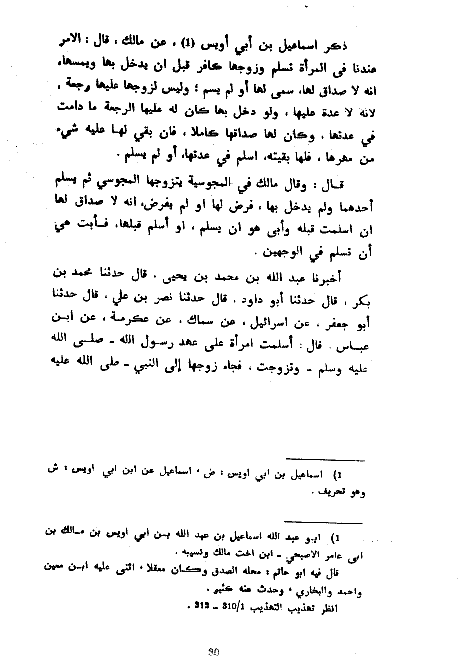 ذَكَرَ إِسْمَاعِيلُ بْنُ أَبِي أُوَيْسٍ عَنْ مَالِكٍ قَالَ الْأَمْرُ عِنْدَنَا فِي الْمَرْأَةِ تُسْلِمُ وَزَوْجُهَا كَافِرٌ قَبْلَ أَنْ يَدْخُلَ بِهَا وَيَمَسَّهَا أَنَّهُ لَا صَدَاقَ لَهَا سُمِّيَ لَهَا أَوْ لَمْ يُسَمَّ وَلَيْسَ لِزَوْجِهَا عَلَيْهَا رَجْعَةٌ لِأَنَّهُ لَا عِدَّةَ عَلَيْهَا وَلَوْ دَخَلَ بِهَا كَانَ لَهُ عَلَيْهَا الرَّجْعَةُ مَا دَامَتْ فِي عِدَّتِهَا وَكَانَ لَهَا صَدَاقُهَا كَامِلًا فَإِنْ بَقِيَ لَهَا عَلَيْهِ شَيْءٌ مِنْ مَهْرِهَا فَلَهَا بَقِيَّتُهُ أَسْلَمَ فِي عِدَّتِهَا أَوْ لَمْ يُسْلِمْ قَالَ وَقَالَ مَالِكٌ فِي الْمَجُوسِيَّةِ يَتَزَوَّجُهَا الْمَجُوسِيُّ ثُمَّ يُسْلِمُ أَحَدُهُمَا وَلَمْ يَدْخُلْ بِهَا فَرَضَ لَهَا أَوْ لَمْ يَفْرِضْ أَنَّهُ لَا صَدَاقَ لَهَا إِنْ أَسْلَمَتْ قَبْلَهُ وَأَبَى هُوَ أَنْ يُسْلِمَ أَوْ أَسْلَمَ قبلها فأبت في أَنْ تُسْلِمَ فِي الْوَجْهَيْنِ أَخْبَرَنَا عَبْدُ اللَّهِ بْنُ مُحَمَّدِ بْنِ يَحْيَى قَالَ حَدَّثَنَا مُحَمَّدُ بْنُ بَكْرٍ قَالَ حَدَّثَنَا أَبُو دَاوُدَ قَالَ حَدَّثَنَا نَصْرُ بْنُ عَلِيٍّ قَالَ حَدَّثَنَا أَبُو جَعْفَرٍ عَنْ إِسْرَائِيلَ عَنْ سِمَاكٍ عَنْ عِكْرِمَةَ عَنِ ابْنِ عَبَّاسٍ قَالَ أَسْلَمَتِ امْرَأَةٌ عَلَى عَهْدِ رَسُولِ اللَّهِ صَلَّى اللَّهُ عَلَيْهِ وَسَلَّمَ وَتَزَوَّجَتْ فَجَاءَ زَوْجُهَا إِلَى النَّبِيِّ صَلَّى اللَّهُ عَلَيْهِ وَسَلَّمَ