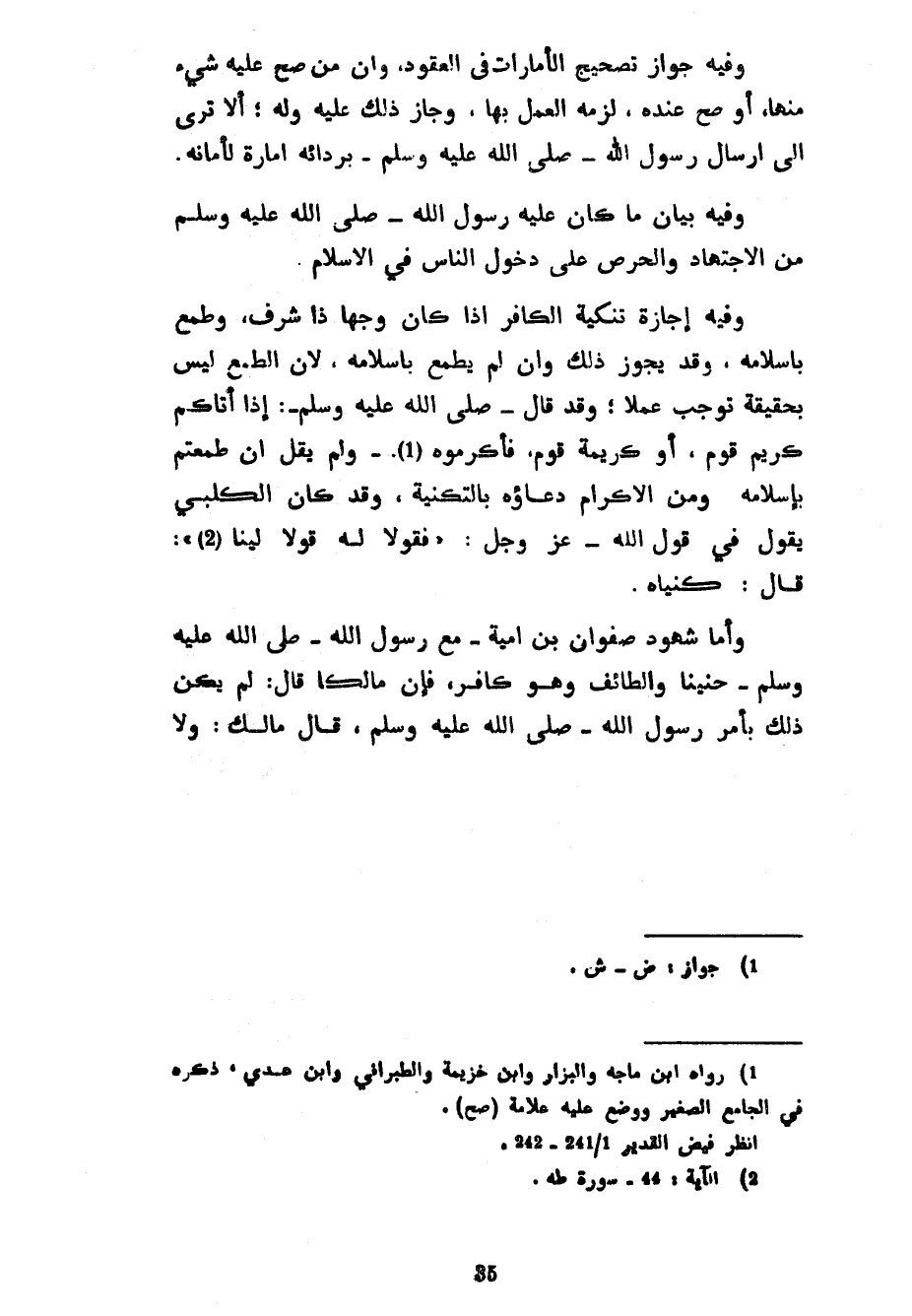 وَفِيهِ جَوَازُ تَصْحِيحِ الْأَمَارَاتِ فِي الْعُقُودِ وَأَنَّ مَنْ صَحَّ عَلَيْهِ شَيْءٌ مِنْهَا أَوْ صَحَّ عِنْدَهُ لَزِمَهُ الْعَمَلُ بِهَا وَجَازَ ذَلِكَ عَلَيْهِ وَلَهُ أَلَا تَرَى إِلَى إِرْسَالِ رَسُولِ اللَّهِ صَلَّى اللَّهُ عَلَيْهِ وَسَلَّمَ بِرِدَائِهِ أَمَارَةً لِأَمَانِهِ وَفِيهِ بَيَانُ مَا كَانَ عَلَيْهِ رَسُولُ اللَّهِ صَلَّى اللَّهُ عَلَيْهِ وَسَلَّمَ مِنَ الِاجْتِهَادِ وَالْحِرْصِ عَلَى دُخُولِ النَّاسِ فِي الْإِسْلَامِ وَفِيهِ إِجَازَةُ تنكية الْكَافِرِ إِذَا كَانَ وَجْهًا ذَا شَرَفٍ وَطَمَعٍ بِإِسْلَامِهِ وَقَدْ يَجُوزُ ذَلِكَ وَإِنْ لَمْ يُطْمَعْ بِإِسْلَامِهِ لِأَنَّ الطَّمَعَ لَيْسَ بِحَقِيقَةٍ تُوجِبُ عَمَلًا وقد قال صلى الله عليه وسلم إذ أَتَاكُمْ كَرِيمُ قَوْمٍ أَوْ كَرِيمَةُ قَوْمٍ فَأَكْرِمُوهُ وَلَمْ يَقُلْ إِنْ طَمِعْتُمْ بِإِسْلَامِهِ وَمِنِ الْإِكْرَامِ دعاؤه بالتكنية وقد كان الكلبي يَقُولُ فِي قَوْلِ اللَّهِ عَزَّ وَجَلَّ فَقُولَا لَهُ قَوْلًا لَيِّنًا قَالَ كَنِّيَاهُ وَأَمَّا شُهُودُ صَفْوَانَ بْنِ أُمَيَّةَ مَعَ رَسُولِ اللَّهِ صَلَّى اللَّهُ عَلَيْهِ وَسَلَّمَ حُنَيْنًا وَالطَّائِفَ وَهُوَ كَافِرٌ فَإِنَّ مَالِكًا قَالَ لَمْ يَكُنْ ذَلِكَ بِأَمْرِ رَسُولِ اللَّهِ صَلَّى اللَّهُ عَلَيْهِ وَسَلَّمَ قال مالك ولا