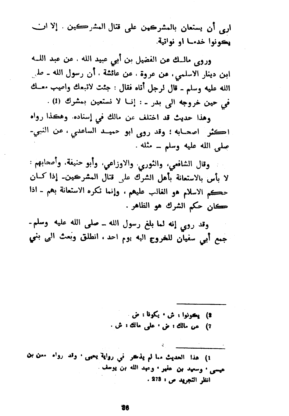 أَرَى أَنْ يُسْتَعَانَ بِالْمُشْرِكِينَ عَلَى قِتَالِ الْمُشْرِكِينَ إِلَّا أَنْ يَكُونُوا خَدَمًا أَوْ نَوَاتِيَّةً وَرَوَى مَالِكٌ عَنِ الْفُضَيْلِ بْنِ أَبِي عُبَيْدِ اللَّهِ عَنْ عَبْدِ اللَّهِ بْنِ دِينَارٍ الْأَسْلَمِيِّ عَنْ عُرْوَةَ عَنْ عَائِشَةَ أَنَّ رَسُولَ اللَّهِ صَلَّى اللَّهُ عَلَيْهِ وَسَلَّمَ قَالَ لِرَجُلٍ أَتَاهُ فَقَالَ جِئْتُ لِأَتَّبِعَكَ وَأُصِيبَ مَعَكَ فِي حِينِ خُرُوجِهِ إِلَى بَدْرٍ إِنَّا لَا نَسْتَعِينُ بِمُشْرِكٍ وَهَذَا حَدِيثٌ قَدِ اخْتُلِفَ عَنْ مَالِكٍ فِي إِسْنَادِهِ وَهَكَذَا رَوَاهُ أَكْثَرُ أَصْحَابِهِ وَقَدْ رَوَى أَبُو حُمَيْدٍ السَّاعِدِيِّ عَنِ النَّبِيِّ صَلَّى اللَّهُ عَلَيْهِ وَسَلَّمَ مِثْلَهُ وَقَالَ الشَّافِعِيُّ وَالثَّوْرِيُّ وَالْأَوْزَاعِيُّ وَأَبُو حَنِيفَةَ وَأَصْحَابُهُمْ لَا بَأْسَ بِالِاسْتِعَانَةِ بِأَهْلِ الشِّرْكِ عَلَى قِتَالِ الْمُشْرِكِينَ إِذَا كَانَ حُكْمُ الْإِسْلَامِ هُوَ الْغَالِبُ عَلَيْهِمْ وَإِنَّمَا تُكْرَهُ الِاسْتِعَانَةُ بِهِمْ إِذَا كَانَ حُكْمُ الشِّرْكِ هُوَ الظَّاهِرُ وَقَدْ رُوِيَ أَنَّهُ لَمَّا بَلَغَ رَسُولَ اللَّهِ صَلَّى اللَّهُ عَلَيْهِ وَسَلَّمَ جَمَعَ أَبِي سُفْيَانَ لِلْخُرُوجِ إِلَيْهِ يَوْمَ أُحُدٍ انْطَلَقَ وَبَعَثَ إِلَى بَنِي