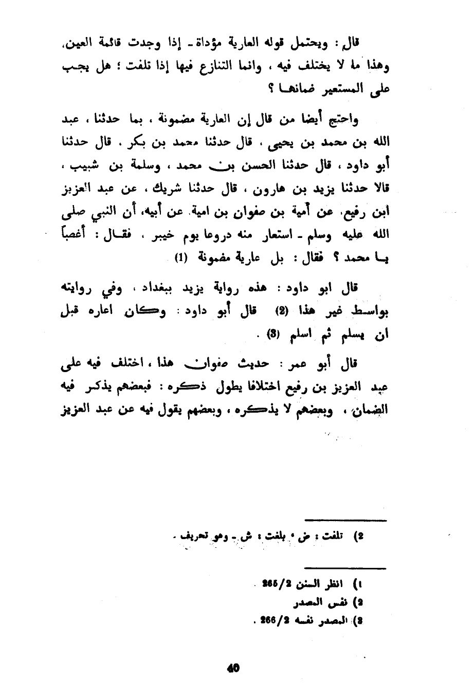 قَالَ وَيَحْتَمِلُ قَوْلُهُ الْعَارِيَةُ مُؤَدَّاةٌ إِذَا وُجِدَتْ قَائِمَةَ الْعَيْنِ وَهَذَا مَا لَا يُخْتَلَفُ فِيهِ وَإِنَّمَا التَّنَازُعُ فِيهَا إِذَا تَلِفَتْ هَلْ يَجِبُ عَلَى الْمُسْتَعِيرِ ضَمَانُهَا وَاحْتَجَّ أَيْضًا مَنْ قَالَ إِنَّ الْعَارِيَةَ مَضْمُونَةٌ بِمَا حَدَّثَنَا عَبْدُ اللَّهِ بْنُ مُحَمَّدِ بْنِ يَحْيَى قَالَ حَدَّثَنَا مُحَمَّدُ بْنُ بَكْرٍ قَالَ حَدَّثَنَا أَبُو دَاوُدَ قَالَ حَدَّثَنَا الْحَسَنُ بْنُ مُحَمَّدٍ وَسَلَمَةُ بْنُ شَبِيبٍ قَالَا حَدَّثَنَا يَزِيدُ بْنُ هَارُونَ قَالَ حَدَّثَنَا شَرِيكٌ عَنْ عَبْدِ الْعَزِيزِ بْنِ رُفَيْعٍ عَنْ أُمَيَّةَ بْنِ صَفْوَانَ بْنِ أُمَيَّةَ عَنْ أَبِيهِ أَنَّ النَّبِيَّ صَلَّى اللَّهُ عَلَيْهِ وَسَلَّمَ اسْتَعَارَ مِنْهُ دُرُوعًا يَوْمَ خَيْبَرَ فَقَالَ أَغَصْبًا يَا مُحَمَّدُ فَقَالَ بَلْ عَارِيَةٌ مَضْمُونَةٌ قَالَ أَبُو دَاوُدَ هَذِهِ رِوَايَةُ يَزِيدَ بِبَغْدَادَ وَفِي رِوَايَتِهِ بِوَاسِطٍ غَيْرُ هَذَا قَالَ أَبُو دَاوُدَ وَكَانَ أَعَارَهُ قَبْلَ أَنْ يُسْلِمَ ثُمَّ أَسْلَمَ قَالَ أَبُو عُمَرَ حَدِيثُ صَفْوَانَ هَذَا اخْتُلِفَ فِيهِ عَلَى عَبْدِ الْعَزِيزِ بْنِ رُفَيْعٍ اخْتِلَافًا يَطُولُ ذِكْرُهُ فَبَعْضُهُمْ يَذْكُرُ فِيهِ الضَّمَانَ وَبَعْضُهُمْ لَا يذكره وبعضهم يقول فيه عن عبد العزيز