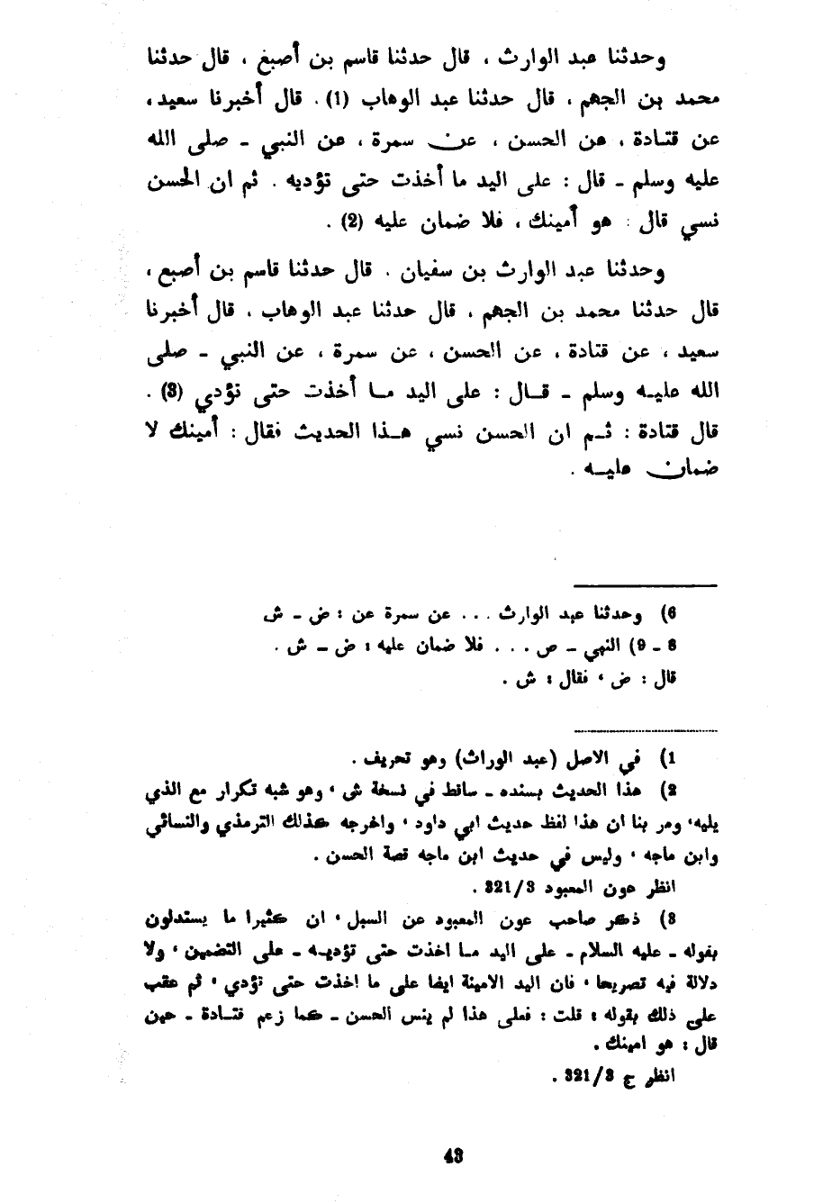 وَحَدَّثَنَا عَبْدُ الْوَارِثِ قَالَ حَدَّثَنَا قَاسِمُ بْنُ أَصْبَغَ قَالَ حَدَّثَنَا مُحَمَّدُ بْنُ الْجَهْمِ قَالَ حَدَّثَنَا عَبْدُ الْوَهَّابِ قَالَ أَخْبَرَنَا سَعِيدٌ عَنْ قَتَادَةُ عَنِ الْحَسَنِ عَنْ سَمُرَةَ عَنِ النَّبِيِّ صَلَّى اللَّهُ عَلَيْهِ وَسَلَّمَ قَالَ عَلَى الْيَدِ مَا أَخَذَتْ حَتَّى تُؤَدِّيَهُ ثُمَّ إِنَّ الْحَسَنَ نَسِيَ قَالَ هُوَ أَمِينُكَ فَلَا ضَمَانَ عَلَيْهِ وَحَدَّثَنَا عَبْدُ الْوَارِثِ بْنُ سُفْيَانَ قَالَ حَدَّثَنَا قَاسِمُ بْنُ أَصْبَغَ قَالَ حَدَّثَنَا مُحَمَّدُ بْنُ الْجَهْمِ قَالَ حَدَّثَنَا عَبْدُ الْوَهَّابِ قَالَ أَخْبَرَنَا سَعِيدٌ عَنْ قَتَادَةُ عَنِ الْحَسَنِ عَنْ سَمُرَةَ عَنِ النَّبِيِّ صَلَّى اللَّهُ عَلَيْهِ وَسَلَّمَ قَالَ عَلَى الْيَدِ مَا أَخَذَتْ حَتَّى تُؤَدِّيَ قَالَ قَتَادَةُ ثُمَّ إِنَّ الْحَسَنَ نَسِيَ هَذَا الْحَدِيثَ فَقَالَ أَمِينُكَ لَا ضَمَانَ عَلَيْهِ