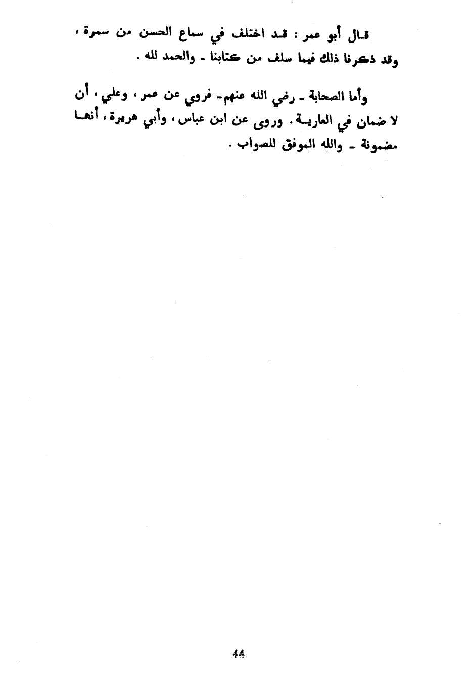 قَالَ أَبُو عُمَرَ قَدِ اخْتُلِفَ فِي سَمَاعِ الْحَسَنِ مِنْ سَمُرَةَ وَقَدْ ذَكَرْنَا ذَلِكَ فِيمَا سَلَفَ مِنْ كِتَابِنَا وَالْحَمْدُ لِلَّهِ وَأَمَّا الصَّحَابَةُ رَضِيَ اللَّهُ عَنْهُمْ فَرُوِيَ عَنْ عُمَرَ وَعَلِيٍّ أَنْ لَا ضَمَانَ فِي الْعَارِيَةِ وَرُوِيَ عَنِ ابْنِ عَبَّاسٍ وَأَبِي هُرَيْرَةَ أَنَّهَا مَضْمُونَةٌ وَاللَّهُ الموفق للصواب