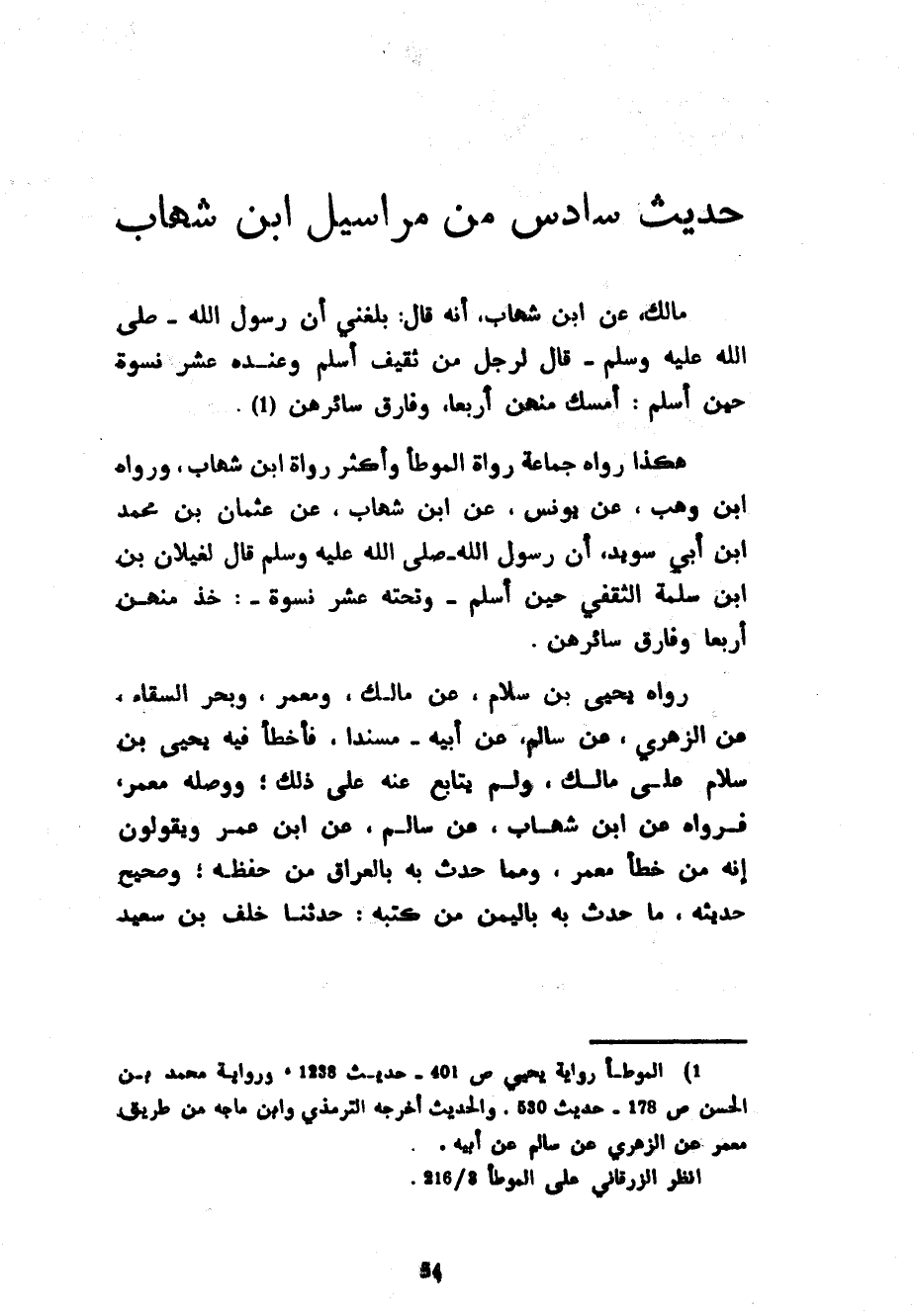 حَدِيثٌ سَادِسٌ مِنْ مَرَاسِيلِ ابْنِ شِهَابٍ مَالِكٌ عَنِ ابْنِ شِهَابٍ أَنَّهُ قَالَ بَلَغَنِي أَنَّ رَسُولَ اللَّهِ صَلَّى اللَّهُ عليه وسلم
