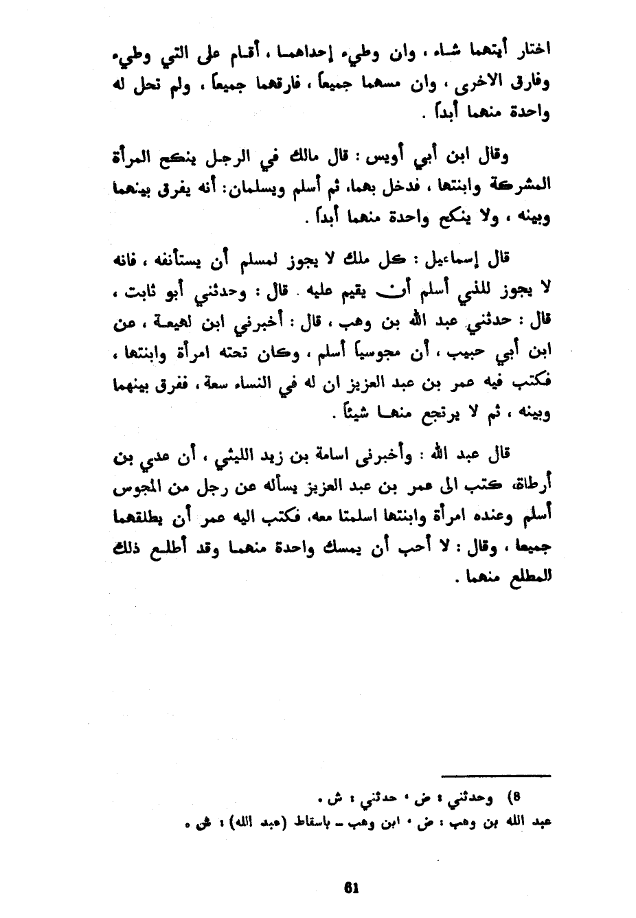 اخْتَارَ أَيَّتَهُمَا شَاءَ وَإِنْ وَطِئَ إِحْدَاهُمَا أَقَامَ عَلَى الَّتِي وَطِئَ وَفَارَقَ الْأُخْرَى وَإِنْ مَسَّهُمَا جَمِيعًا فَارَقَهُمَا جَمِيعًا وَلَمْ تَحِلَّ لَهُ وَاحِدَةٌ مِنْهُمَا أَبَدًا وَقَالَ ابْنُ أَبِي أُوَيْسٍ قَالَ مَالِكٌ فِي الرَّجُلِ يَنْكِحُ الْمَرْأَةَ الْمُشْرِكَةَ وَابْنَتَهَا فَدَخَلَ بِهِمَا ثُمَّ أَسْلَمَ وَيُسْلِمَانِ أَنَّهُ يُفَرَّقُ بَيْنَهُمَا وَبَيْنَهُ وَلَا يَنْكِحُ وَاحِدَةً مِنْهُمَا أَبَدًا قَالَ إِسْمَاعِيلُ كُلُّ مِلْكٍ لَا يَجُوزُ لِمُسْلِمٍ أَنْ يَسْتَأْنِفَهُ فَإِنَّهُ لَا يَجُوزُ لِلَّذِي أَسْلَمَ أَنْ يُقِيمَ عَلَيْهِ قَالَ وَحَدَّثَنِي أَبُو ثَابِتٍ قَالَ حَدَّثَنِي عَبْدُ اللَّهِ بْنُ وَهْبٍ قَالَ أَخْبَرَنِي ابْنُ لَهِيعَةَ عَنِ ابْنِ أَبِي حَبِيبٍ أَنَّ مَجُوسِيًّا أَسْلَمَ وَكَانَ تَحْتَهُ امْرَأَةٌ وَابْنَتُهَا فَكَتَبَ فِيهِ عُمَرُ بْنُ عَبْدِ الْعَزِيزِ أَنَّ لَهُ فِي النِّسَاءِ سَعَةً فَفَرَّقَ بَيْنَهُمَا وَبَيْنَهُ ثُمَّ لَا يَرْتَجِعُ مِنْهَا شَيْئًا قَالَ عَبْدُ اللَّهِ وَأَخْبَرَنِي أُسَامَةُ بْنُ زَيْدٍ اللَّيْثِيُّ أَنَّ عَدِيَّ بْنَ أَرْطَاةَ كَتَبَ إِلَى عُمَرَ بْنِ عبد العزيز يسأله عَنْ رَجُلٍ مِنَ الْمَجُوسِ أَسْلَمَ وَعِنْدَهُ امْرَأَةٌ وَابْنَتُهَا أَسْلَمَتَا مَعَهُ فَكَتَبَ إِلَيْهِ عُمَرُ أَنْ يُطَلِّقَهُمَا جَمِيعًا وَقَالَ لَا أُحِبُّ أَنْ يُمْسِكَ وَاحِدَةً مِنْهُمَا وَقَدِ اطَّلَعَ ذَلِكَ الْمُطَّلَعَ مِنْهُمَا