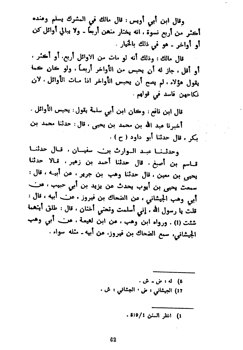 وَقَالَ ابْنُ أَبِي أُوَيْسٍ قَالَ مَالِكٌ فِي الْمُشْرِكِ يُسْلِمُ وَعِنْدَهُ أَكْثَرُ مِنْ أَرْبَعِ نِسْوَةٍ أَنَّهُ يَخْتَارُ مِنْهُنَّ أَرْبَعًا وَلَا يُبَالِي أَوَائِلَ كُنَّ أَوْ أَوَاخِرَ هُوَ فِي ذَلِكَ بِالْخِيَارِ قَالَ مَالِكٌ وَذَلِكَ أَنَّهُ لَوْ مَاتَ مِنَ الْأَوَائِلِ أَرْبَعٌ أَوْ أَكْثَرُ أَوْ أَقَلُّ جَازَ لَهُ أَنْ يَحْبِسَ مِنَ الْأَوَاخِرِ أَرْبَعًا وَلَوْ كَانَ كَمَا يَقُولُ هَؤُلَاءِ لَمْ يَصِحَّ أَنْ يَحْبِسَ الْأَوَاخِرَ إِذَا مَاتَ الْأَوَائِلُ لِأَنَّ نِكَاحَهُنَّ فَاسِدٌ فِي قَوْلِهِمْ قَالَ ابْنُ نَافِعٍ وَكَانَ ابْنُ أَبِي سَلَمَةَ يَقُولُ يَحْبِسُ الْأَوَائِلَ أَخْبَرَنَا عَبْدُ اللَّهِ بْنُ مُحَمَّدِ بْنِ يَحْيَى قَالَ حَدَّثَنَا مُحَمَّدُ بْنُ بَكْرٍ قَالَ حَدَّثَنَا أبو داود وَعَبْدُ الْوَارِثِ بْنُ سُفْيَانَ قَالَ حَدَّثَنَا قَاسِمُ بْنُ أَصْبَغَ قَالَ حَدَّثَنَا أَحْمَدُ بْنُ زُهَيْرٍ قَالَا حَدَّثَنَا يَحْيَى بْنُ مَعِينٍ قَالَ حَدَّثَنَا وَهْبُ بْنُ جَرِيرٍ عَنْ أَبِيهِ قَالَ سَمِعْتُ يَحْيَى بْنَ أَيُّوبَ يُحَدِّثُ عَنْ يَزِيدَ بْنِ أَبِي حَبِيبٍ عَنْ أَبِي وَهْبٍ الْجَيْشَانِيِّ عَنِ الضَّحَّاكِ بْنِ فَيْرُوزٍ عَنْ أَبِيهِ قَالَ قُلْتُ يَا رَسُولَ اللَّهِ إِنِّي أَسْلَمْتُ وَتَحْتِي أُخْتَانِ قال طلق أيتهما شئت ورواه وَهْبٍ عَنِ ابْنِ لَهِيعَةَ عَنْ أَبِي وَهْبٍ الْجَيْشَانِيِّ سَمِعَ الضَّحَّاكَ بْنَ فَيْرُوزٍ عَنْ أَبِيهِ مثله سواء