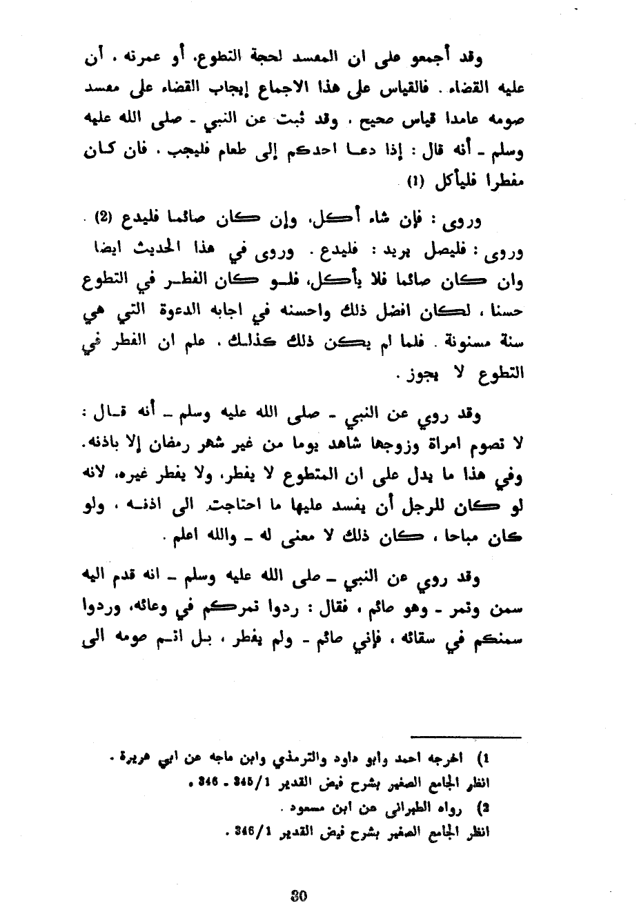وَقَدْ أَجْمَعُوا عَلَى أَنَّ الْمُفْسِدَ لِحَجَّةِ التَّطَوُّعِ أَوْ عُمْرَتِهِ أَنَّ عَلَيْهِ الْقَضَاءَ فَالْقِيَاسُ عَلَى هَذَا الْإِجْمَاعِ إِيجَابُ الْقَضَاءِ عَلَى مُفْسِدِ صَوْمِهِ عَامِدًا قِيَاسٌ صَحِيحٌ وَقَدْ ثَبَتَ عَنِ النَّبِيِّ صَلَّى اللَّهُ عَلَيْهِ وَسَلَّمَ أَنَّهُ قَالَ إِذَا دُعِيَ أَحَدُكُمْ إِلَى طَعَامٍ فَلْيُجِبْ فَإِنْ كَانَ مُفْطِرًا فَلْيَأْكُلْ وَرُوِيَ فَإِنْ شَاءَ أَكَلَ وَإِنْ كَانَ صَائِمًا فَلْيَدْعُ وَرُوِيَ فَلْيُصَلِّ يُرِيدُ فَلْيَدْعُ وَرُوِيَ فِي هَذَا الْحَدِيثِ أَيْضًا وَإِنْ كَانَ صَائِمًا فَلَا يَأْكُلْ فَلَوْ كَانَ الْفِطْرُ فِي التَّطَوُّعِ حَسَنًا لَكَانَ أَفْضَلُ ذَلِكَ وَأَحْسَنُهُ فِي إِجَابَةِ الدَّعْوَةِ الَّتِي هِيَ سُنَّةٌ مَسْنُونَةٌ فَلَمَّا لَمْ يَكُنْ ذَلِكَ كَذَلِكَ عُلِمَ أَنَّ الْفِطْرَ فِي التَّطَوُّعِ لَا يَجُوزُ وَقَدْ رُوِيَ عَنِ النَّبِيِّ صَلَّى اللَّهُ عَلَيْهِ وَسَلَّمَ أَنَّهُ قَالَ لا تصوم امرأة زوجها شَاهِدٌ يَوْمًا مِنْ غَيْرِ شَهْرِ رَمَضَانَ إِلَّا بِإِذْنِهِ وَفِي هَذَا مَا يَدُلُّ عَلَى أَنَّ الْمُتَطَوِّعَ لَا يُفْطِرُ وَلَا يُفَطِّرُ غَيْرَهُ لِأَنَّهُ لَوْ كَانَ لِلرَّجُلِ أَنْ يُفْسِدَ عَلَيْهَا مَا احْتَاجَتْ إِلَى إِذْنِهِ وَلَوْ كَانَ مُبَاحًا كَانَ ذَلِكَ لَا مَعْنَى لَهُ وَاللَّهُ أَعْلَمُ وَقَدْ رُوِيَ عَنِ النَّبِيِّ صَلَّى اللَّهُ عَلَيْهِ وسلم أَنَّهُ قَدِمَ إِلَيْهِ سَمْنٌ وَتَمْرٌ وَهُوَ صَائِمٌ فَقَالَ رُدُّوا تَمْرَكُمْ فِي وِعَائِهِ وَرُدُّوا سَمْنَكُمْ فِي سِقَائِهِ فَإِنِّي صَائِمٌ وَلَمْ يُفْطِرْ بَلْ أَتَمَّ صَوْمَهُ إِلَى