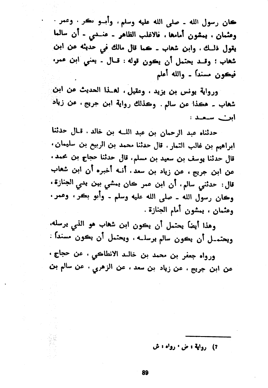 كَانَ رَسُولُ اللَّهِ صَلَّى اللَّهُ عَلَيْهِ وَسَلَّمَ وَأَبُو بَكْرٍ وَعُمَرُ وَعُثْمَانُ يَمْشُونَ أَمَامَهَا فَالْأَغْلَبُ الظَّاهِرُ عِنْدِي أَنَّ سَالِمًا يَقُولُ ذَلِكَ وَابْنُ شِهَابٍ كَمَا قَالَ مَالِكٌ فِي حَدِيثِهِ عَنِ ابْنِ شِهَابٍ وَقَدْ يَحْتَمِلُ أَنْ يَكُونَ قَوْلُهُ قَالَ يَعْنِي ابْنَ عُمَرَ فَيَكُونُ مُسْنَدًا وَاللَّهُ أَعْلَمُ وَرِوَايَةُ يُونُسَ بْنِ يَزِيدَ وَعُقَيْلٍ لِهَذَا الْحَدِيثِ عَنِ ابْنِ شِهَابٍ هَكَذَا عَنْ سَالِمٍ وَكَذَلِكَ رِوَايَةُ ابْنِ جُرَيْجٍ عَنْ زِيَادِ بْنِ سعد حدثناه عبد الرحمان بْنُ عَبْدِ اللَّهِ بْنِ خَالِدٍ قَالَ حَدَّثَنَا إِبْرَاهِيمُ بْنِ غَالِبٍ التَّمَّارُ قَالَ حَدَّثَنَا مُحَمَّدُ بْنُ الرَّبِيعِ بْنِ سُلَيْمَانَ قَالَ حَدَّثَنَا يُوسُفُ بْنُ سَعِيدِ بْنِ مُسْلِمٍ قَالَ حَدَّثَنَا حَجَّاجُ بْنُ مُحَمَّدٍ عَنِ ابْنِ جُرَيْجٍ عَنْ زِيَادِ بْنِ سَعْدٍ أَنَّهُ أَخْبَرَهُ أَنَّ ابْنَ شِهَابٍ قَالَ حَدَّثَنِي سَالِمٌ أَنَّ ابْنَ عُمَرَ كَانَ يَمْشِي بَيْنَ يَدَيِ الْجِنَازَةِ وَكَانَ رَسُولُ اللَّهِ صَلَّى اللَّهُ عَلَيْهِ وَسَلَّمَ وَأَبُو بَكْرٍ وَعُمَرُ وَعُثْمَانُ يَمْشُونَ أَمَامَ الْجِنَازَةِ وَهَذَا أَيْضًا يَحْتَمِلُ أَنْ يَكُونَ ابْنُ شِهَابٍ هُوَ الَّذِي يُرْسِلُهُ وَيَحْتَمِلُ أَنْ يَكُونَ سَالِمٌ يُرْسِلُهُ وَيَحْتَمِلُ أَنْ يَكُونَ مُسْنَدًا وَرَوَاهُ جَعْفَرُ بْنُ مُحَمَّدِ بْنِ خَالِدٍ الْأَنْطَاكِيُّ عَنْ حَجَّاجٍ عَنِ ابْنِ جُرَيْجٍ عَنْ زِيَادِ بْنِ سَعْدٍ عَنِ الزُّهْرِيِّ عَنْ سَالِمِ بْنِ