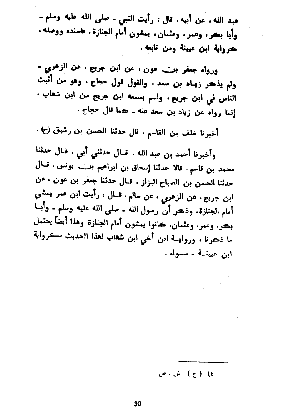 عَبْدِ اللَّهِ عَنْ أَبِيهِ قَالَ رَأَيْتُ النَّبِيَّ صَلَّى اللَّهُ عَلَيْهِ وَسَلَّمَ وَأَبَا بَكْرٍ وَعُمَرَ وَعُثْمَانَ يَمْشُونَ أَمَامَ الْجِنَازَةِ فَأَسْنَدَهُ وَوَصَلَهُ كَرِوَايَةِ ابْنِ عُيَيْنَةَ وَمَنْ تَابَعَهُ وَرَوَاهُ جَعْفَرُ بْنُ عَوْنٍ عَنِ ابْنِ جُرَيْجٍ عَنِ الزُّهْرِيِّ وَلَمْ يَذْكُرْ زِيَادَ بْنَ سَعْدٍ وَالْقَوْلُ قَوْلُ حَجَّاجٍ وَهُوَ مِنْ أَثْبَتِ النَّاسِ فِي ابْنِ جُرَيْجٍ وَلَمْ يَسْمَعْهُ ابْنُ جُرَيْجٍ مِنَ ابْنِ شِهَابٍ إِنَّمَا رَوَاهُ عَنْ زِيَادِ بْنِ سَعْدٍ عَنْهُ كَمَا قَالَ حَجَّاجٌ أَخْبَرَنَا خَلَفُ بْنُ الْقَاسِمِ قَالَ حَدَّثَنَا الْحَسَنُ بْنُ رشيق وَأَخْبَرَنَا أَحْمَدُ بْنُ عَبْدِ اللَّهِ قَالَ حَدَّثَنِي أَبِي قَالَ حَدَّثَنَا مُحَمَّدُ بْنُ قَاسِمٍ قَالَا حَدَّثَنَا إِسْحَاقُ بْنُ إِبْرَاهِيمَ بْنِ يُونُسَ قَالَ حدثنا الحسن بن الصباح الْبَزَّازُ قَالَ حَدَّثَنَا جَعْفَرُ بْنُ عَوْنٍ عَنِ ابْنِ جُرَيْجٍ عَنِ الزُّهْرِيِّ عَنْ سَالِمٍ قَالَ رَأَيْتُ ابْنَ عُمَرَ يَمْشِي أَمَامَ الْجِنَازَةِ وَذَكَرَ أن رسول الله صلى الله عليه وسلم وَأَبَا بَكْرٍ وَعُمَرَ وَعُثْمَانَ كَانُوا يَمْشُونَ أَمَامَ الجنازة وهذاأيضا يَحْتَمِلُ مَا ذَكَرْنَا وَرِوَايَةُ ابْنِ أَخِي ابْنِ شِهَابٍ لِهَذَا الْحَدِيثِ كَرِوَايَةِ ابْنِ عُيَيْنَةَ سَوَاءٌ