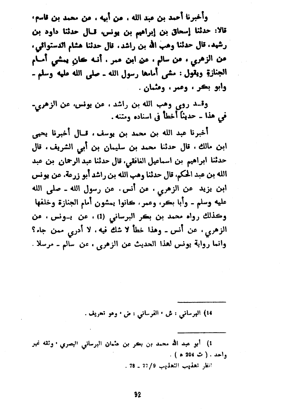 وَأَخْبَرَنَا أَحْمَدُ بْنُ عَبْدِ اللَّهِ عَنْ أَبِيهِ عَنْ مُحَمَّدِ بْنِ قَاسِمٍ قَالَا حَدَّثَنَا إِسْحَاقُ بْنُ إِبْرَاهِيمَ بْنِ يُونُسَ قَالَ حَدَّثَنَا دَاوُدُ بْنُ رَشِيدٍ قَالَ حَدَّثَنَا وَهْبُ اللَّهِ بْنُ رَاشِدٍ قَالَ حَدَّثَنَا هِشَامٌ الدَّسْتَوَائِيُّ عَنِ الزُّهْرِيِّ عَنْ سَالِمٍ عَنِ ابْنِ عُمَرَ أَنَّهُ كَانَ يَمْشِي أَمَامَ الْجِنَازَةِ وَيَقُولُ مَشَى أَمَامَهَا رَسُولُ اللَّهِ صَلَّى اللَّهُ عَلَيْهِ وَسَلَّمَ وَأَبُو بَكْرٍ وَعُمَرُ وَعُثْمَانُ وَقَدْ رَوَى وَهْبُ اللَّهِ بْنُ رَاشِدٍ عَنْ يُونُسَ عَنِ الزُّهْرِيِّ فِي هَذَا حَدِيثًا أَخْطَأَ فِي إِسْنَادِهِ وَمَتْنِهِ أَخْبَرَنَا عَبْدُ اللَّهِ بْنُ مُحَمَّدِ بْنِ يُوسُفَ قَالَ أَخْبَرَنَا يَحْيَى بْنُ مَالِكٍ قَالَ حَدَّثَنَا مُحَمَّدُ بْنُ سُلَيْمَانَ بْنِ أَبِي الشَّرِيفِ قَالَ حَدَّثَنَا إِبْرَاهِيمُ بن إسماعيل الغافقي قال حدثنا عبد الرحمان بْنُ عَبْدِ اللَّهِ بْنِ عَبْدِ الْحَكَمِ قَالَ حَدَّثَنَا وَهْبُ اللَّهِ بْنُ رَاشِدٍ أَبُو زُرْعَةَ عَنْ يُونُسَ بْنِ يَزِيدَ عَنِ الزُّهْرِيِّ عَنْ أنس عَنْ رَسُولِ اللَّهِ صَلَّى اللَّهُ عَلَيْهِ وَسَلَّمَ وَأَبَا بَكْرٍ وَعُمَرَ كَانُوا يَمْشُونَ أَمَامَ الْجِنَازَةِ وَخَلْفَهَا وَكَذَلِكَ رَوَاهُ مُحَمَّدُ بْنُ بَكْرٍ الْبُرْسَانِيُّ عَنْ يُونُسَ عَنِ الزُّهْرِيِّ عَنْ أَنَسٍ وَهَذَا خَطَأٌ لَا شَكَّ فِيهِ لَا أَدْرِي مِمَّنْ جَاءَ وَإِنَّمَا رِوَايَةُ يُونُسَ لِهَذَا الْحَدِيثِ عَنِ الزُّهْرِيِّ عَنْ سَالِمٍ مُرْسَلًا