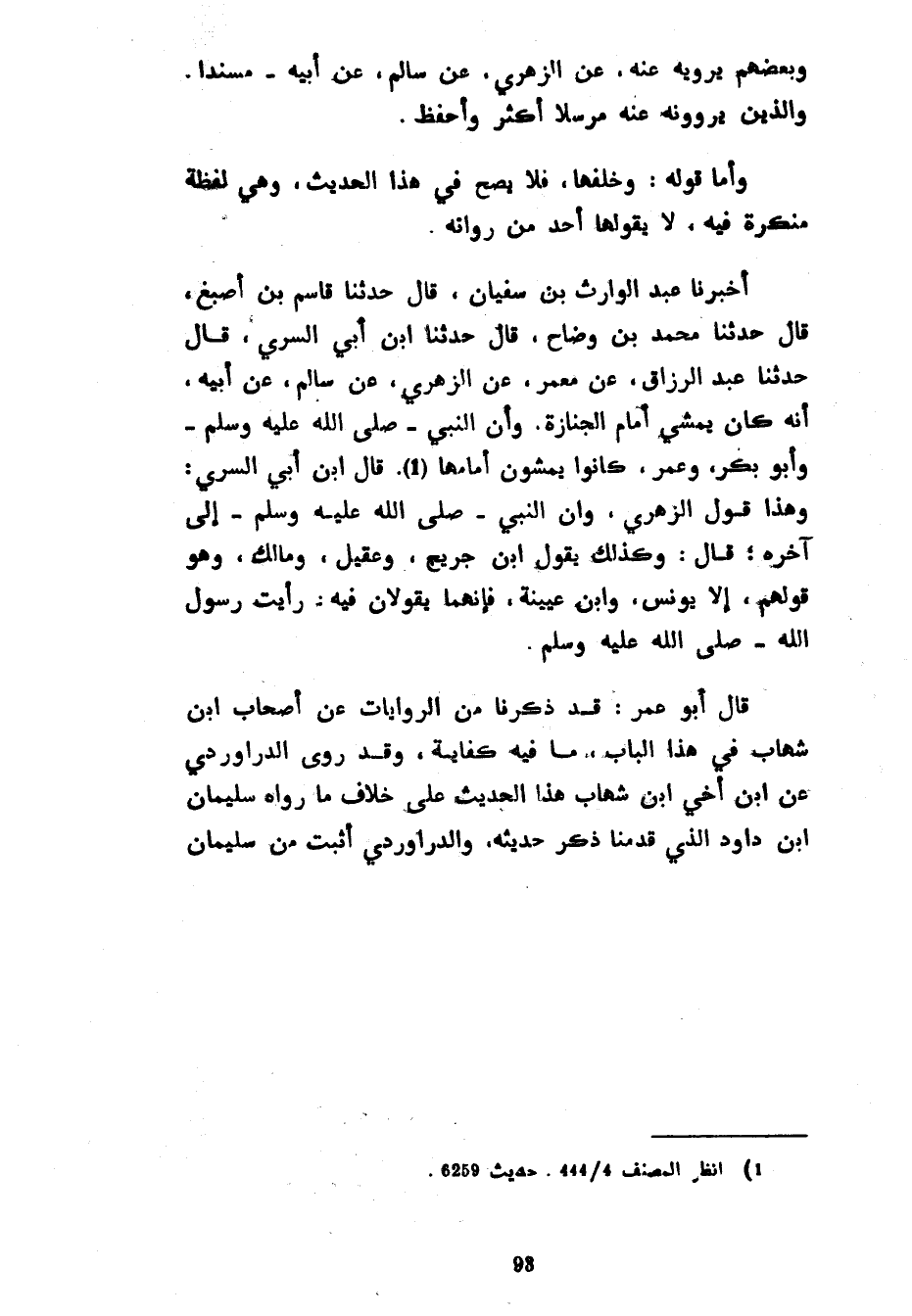 وَبَعْضُهُمْ يَرْوِيهِ عَنْهُ عَنِ الزُّهْرِيِّ عَنْ سَالِمٍ عَنْ أَبِيهِ مُسْنَدًا وَالَّذِينَ يَرْوُونَهُ عَنْهُ مُرْسَلًا أَكْثَرُ وَأَحْفَظُ وَأَمَّا قَوْلُهُ وَخَلْفَهَا فَلَا يَصِحُّ فِي هَذَا الْحَدِيثِ وَهِيَ لَفْظَةٌ مُنْكَرَةٌ فِيهِ لَا يَقُولُهَا أَحَدٌ مِنْ رُوَاتِهِ أَخْبَرَنَا عَبْدُ الْوَارِثِ بْنُ سُفْيَانَ قَالَ حَدَّثَنَا قَاسِمُ بْنُ أَصْبَغَ قَالَ حَدَّثَنَا مُحَمَّدُ بْنُ وَضَّاحٍ قَالَ حَدَّثَنَا ابْنُ أَبِي السَّرِيِّ قَالَ حَدَّثَنَا عَبْدُ الرَّزَّاقِ عَنْ مَعْمَرٍ عَنِ الزُّهْرِيِّ عَنْ سَالِمٍ عَنْ أَبِيهِ أَنَّهُ كَانَ يَمْشِي أَمَامَ الْجِنَازَةِ وأن النَّبِيُّ صَلَّى اللَّهُ عَلَيْهِ وَسَلَّمَ وَأَبُو بَكْرٍ وَعُمَرُ كَانُوا يَمْشُونَ أَمَامَهَا قَالَ ابْنُ أَبِي السَّرِيِّ وَهَذَا قَوْلُ الزُّهْرِيِّ وَأَنَّ النَّبِيَّ صَلَّى اللَّهُ عَلَيْهِ وَسَلَّمَ إِلَى آخِرِهِ قَالَ وَكَذَلِكَ يَقُولُ ابْنُ جُرَيْجٍ وَعُقَيْلٌ وَمَالِكٌ وَهُوَ قَوْلُهُمْ إِلَّا يُونُسَ وَابْنَ عُيَيْنَةَ فَإِنَّهُمَا يَقُولَانِ فِيهِ رَأَيْتُ رَسُولَ اللَّهِ صَلَّى اللَّهُ عَلَيْهِ وَسَلَّمَ قال أَبُو عُمَرَ قَدْ ذَكَرْنَا مِنَ الرِّوَايَاتِ عَنْ أَصْحَابِ ابْنِ شِهَابٍ فِي هَذَا الْبَابِ مَا فِيهِ كِفَايَةٌ وَقَدْ رَوَى الدَّرَاوَرْدِيُّ عَنِ ابْنِ أَخِي ابْنِ شِهَابٍ هَذَا الْحَدِيثَ عَلَى خِلَافِ مَا رَوَاهُ سُلَيْمَانُ بْنُ دَاوُدَ الَّذِي قَدَّمْنَا ذِكْرَ حَدِيثِهِ وَالدَّرَاوَرْدِيُّ أَثْبَتُ مِنْ سُلَيْمَانَ