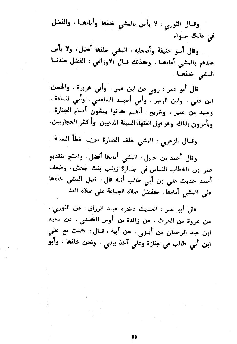 وَقَالَ الثَّوْرِيُّ لَا بَأْسَ بِالْمَشْيِ خَلْفَهَا وَأَمَامَهَا وَالْفَضْلُ فِي ذَلِكَ سَوَاءٌ وَقَالَ أَبُو حَنِيفَةَ وَأَصْحَابُهُ الْمَشْيُ خَلْفَهَا أَفْضَلُ وَلَا بَأْسَ عِنْدَهُمْ بِالْمَشْيِ أَمَامَهَا وَكَذَلِكَ قَالَ الْأَوْزَاعِيُّ الْفَضْلُ عِنْدَنَا الْمَشْيُ خَلْفَهَا قَالَ أَبُو عُمَرَ رُوِيَ عَنِ ابْنِ عُمَرَ وَأَبِي هُرَيْرَةَ وَالْحَسَنِ بْنِ عَلِيٍّ وَابْنِ الزُّبَيْرِ وَأَبِي أُسَيْدٍ السَّاعِدِيِّ وَأَبِي قَتَادَةَ وَعُبَيْدِ بْنِ عُمَيْرٍ وَشُرَيْحٍ أَنَّهُمْ كَانُوا يَمْشُونَ أَمَامَ الْجِنَازَةِ وَيَأْمُرُونَ بِذَلِكَ وَهُوَ قَوْلُ الْفُقَهَاءِ السَّبْعَةِ الْمَدَنِيِّينَ وَأَكْثَرِ الْحِجَازِيِّينَ وَقَالَ الزُّهْرِيُّ الْمَشْيُ خَلْفَ الْجِنَازَةِ مِنْ خَطَأِ السُّنَّةِ وَقَالَ أَحْمَدُ بْنُ حَنْبَلٍ الْمَشْيُ أَمَامَهَا أَفْضَلُ وَاحْتَجَّ بِتَقْدِيمِ عُمَرَ بْنِ الْخَطَّابِ النَّاسَ فِي جِنَازَةِ زَيْنَبَ بِنْتِ جَحْشٍ وَضَعَّفَ أَحْمَدُ حَدِيثَ عَلِيِّ بْنِ أَبِي طَالِبٍ أَنَّهُ قَالَ فَضْلُ الْمَشْيِ خَلْفَهَا عَلَى الْمَشْيِ أَمَامَهَا كَفَضْلِ صَلَاةِ الْجَمَاعَةِ عَلَى صَلَاةِ الْفَذِّ قَالَ أَبُو عُمَرَ الْحَدِيثُ ذَكَرَهُ عَبْدُ الرَّزَّاقِ عَنِ الثَّوْرِيِّ عَنْ عُرْوَةَ بْنِ الحرث عن زائدة بن أوس الكندي عن سعيد بن عبد الرحمان بْنِ أَبْزَى عَنْ أَبِيهِ قَالَ كُنْتُ مَعَ عَلِيِّ بْنِ أَبِي طَالِبٍ فِي جِنَازَةٍ وَعَلِيٌّ آخِذٌ بِيَدِي وَنَحْنُ خَلْفَهَا وَأَبُو