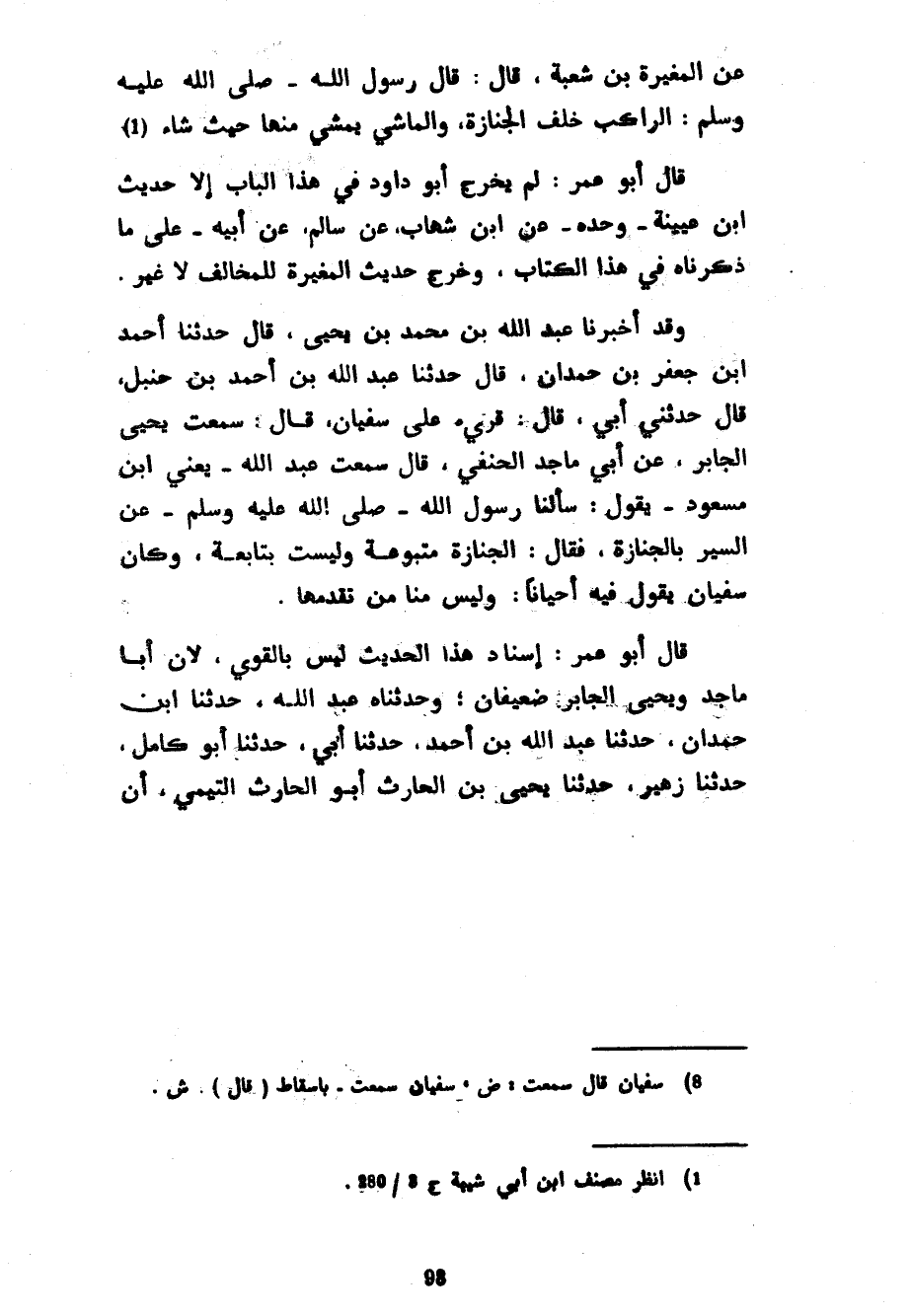 عَنِ الْمُغِيرَةِ بْنِ شُعْبَةَ قَالَ قَالَ رَسُولُ اللَّهِ صَلَّى اللَّهُ عَلَيْهِ وَسَلَّمَ الرَّاكِبُ خَلْفَ الْجِنَازَةِ وَالْمَاشِي يَمْشِي مِنْهَا حَيْثُ شَاءَ قَالَ أَبُو عُمَرَ لَمْ يُخَرِّجْ أَبُو دَاوُدَ فِي هَذَا الْبَابِ إِلَّا حَدِيثَ ابْنِ عُيَيْنَةَ وَحْدَهُ عَنِ ابْنِ شِهَابٍ عَنْ سَالِمٍ عَنْ أَبِيهِ عَلَى مَا ذَكَرْنَاهُ فِي هَذَا الْكِتَابِ وَخَرَّجَ حَدِيثَ الْمُغِيرَةِ لِلْمُخَالِفِ لَا غَيْرَ وَقَدْ أَخْبَرَنَا عَبْدُ اللَّهِ بْنُ مُحَمَّدِ بْنِ يَحْيَى قَالَ حَدَّثَنَا أَحْمَدُ بْنُ جَعْفَرِ بْنِ حَمْدَانَ قَالَ حَدَّثَنَا عَبْدُ اللَّهِ بْنُ أَحْمَدَ بْنِ حَنْبَلٍ قَالَ حَدَّثَنِي أَبِي قَالَ قُرِئَ عَلَى سُفْيَانَ قَالَ سَمِعْتُ يَحْيَى الْجَابِرَ عَنْ أَبِي مَاجِدٍ الْحَنَفِيِّ قَالَ سَمِعْتُ عَبْدَ اللَّهِ يَعْنِي ابْنَ مَسْعُودٍ يَقُولُ سَأَلْنَا رَسُولَ اللَّهِ صَلَّى اللَّهُ عَلَيْهِ وَسَلَّمَ عَنِ السَّيْرِ بِالْجِنَازَةِ فَقَالَ الْجِنَازَةُ مَتْبُوعَةٌ وَلَيْسَتْ بِتَابِعَةٍ وَكَانَ سُفْيَانُ يَقُولُ فِيهِ أَحْيَانًا وَلَيْسَ مِنَّا مَنْ تَقَدَّمَهَا قَالَ أَبُو عُمَرَ إِسْنَادُ هَذَا الْحَدِيثِ لَيْسَ بِالْقَوِيِّ لِأَنَّ أَبَا مَاجِدٍ وَيَحْيَى الْجَابِرَ ضَعِيفَانِ وَحَدَّثَنَاهُ عَبْدُ اللَّهِ حَدَّثَنَا ابْنُ حَمْدَانَ حَدَّثَنَا عَبْدُ اللَّهِ بْنُ أَحْمَدَ حَدَّثَنَا أَبِي حَدَّثَنَا أَبُو كَامِلٍ حَدَّثَنَا زُهَيْرٌ حَدَّثَنَا يَحْيَى بْنُ الْحَارِثِ أَبُو الْحَارِثِ التَّيْمِيُّ أَنَّ