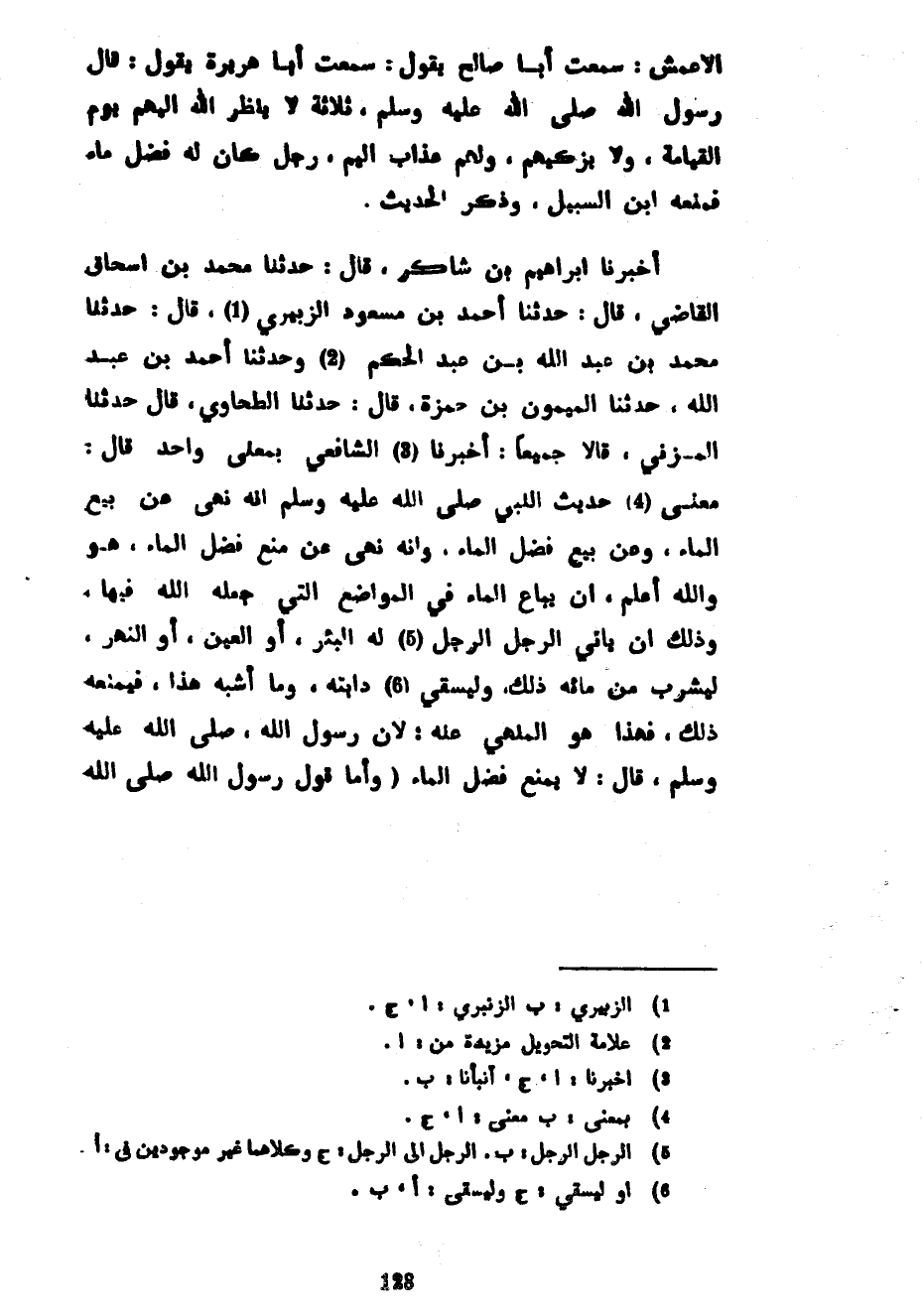الْأَعْمَشِ سَمِعْتُ أَبَا صَالِحٍ يَقُولُ سَمِعْتُ أَبَا هُرَيْرَةَ يَقُولُ قَالَ رَسُولُ اللَّهِ صَلَّى اللَّهُ عَلَيْهِ وَسَلَّمَ ثَلَاثَةٌ لَا يَنْظُرُ اللَّهُ إِلَيْهِمْ يَوْمَ الْقِيَامَةِ وَلَا يُزَكِّيهِمْ وَلَهُمْ عَذَابٌ أَلِيمٌ رَجُلٌ كَانَ لَهُ فَضْلُ مَاءٍ فَمَنَعَهُ ابْنَ السَّبِيلِ وَذَكَرَ الْحَدِيثَ أَخْبَرَنَا إِبْرَاهِيمُ بْنُ شَاكِرٍ قَالَ حَدَّثَنَا مُحَمَّدُ بْنُ إِسْحَاقَ الْقَاضِي قَالَ حَدَّثَنَا أَحْمَدُ بْنُ مَسْعُودٍ الزُّبَيْرِيُّ قَالَ حَدَّثَنَا مُحَمَّدُ بْنُ عَبْدِ اللَّهِ بْنِ عَبْدِ الْحَكَمِ وَحَدَّثَنَا أَحْمَدُ بْنُ عَبْدِ اللَّهِ حَدَّثَنَا الْمَيْمُونُ بْنُ حَمْزَةَ قَالَ حَدَّثَنَا الطَّحَاوِيُّ قَالَ حَدَّثَنَا الْمُزَنِيُّ قَالَا جَمِيعًا أَخْبَرَنَا الشَّافِعِيُّ بِمَعْنًى وَاحِدٍ قَالَ مَعْنَى حَدِيثِ النَّبِيِّ صَلَّى اللَّهُ عَلَيْهِ وَسَلَّمَ أَنَّهُ نَهَى عَنْ بَيْعِ الْمَاءِ وَعَنْ بَيْعِ فَضْلِ الْمَاءِ وَأَنَّهُ نَهَى عَنْ مَنْعِ فَضْلِ الْمَاءِ هُوَ وَاللَّهُ أَعْلَمُ أَنْ يُبَاعَ الْمَاءُ فِي الْمَوَاضِعِ الَّتِي جَعَلَهُ اللَّهُ فِيهَا وَذَلِكَ أَنْ يَأْتِيَ الرَّجُلُ الرَّجُلَ لَهُ الْبِئْرُ أَوِ الْعَيْنُ أَوِ النَّهْرُ لِيَشْرَبَ مِنْ مَائِهِ ذَلِكَ وَلِيَسْقِيَ دَابَّتَهُ وَمَا أَشْبَهَ هَذَا فَيَمْنَعُهُ ذَلِكَ فَهَذَا هُوَ الْمَنْهِيُّ عَنْهُ لِأَنَّ رَسُولَ اللَّهِ صَلَّى اللَّهُ عَلَيْهِ وَسَلَّمَ قَالَ لَا يُمْنَعُ فَضْلُ الْمَاءِ (وَأَمَّا قَوْلُ رَسُولِ اللَّهِ صَلَّى اللَّهُ