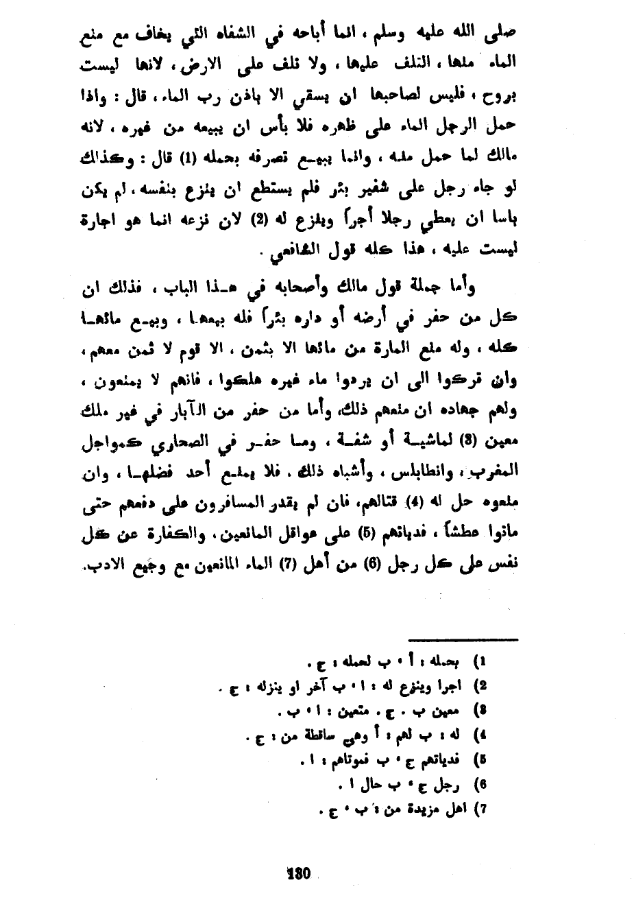 صَلَّى اللَّهُ عَلَيْهِ وَسَلَّمَ إِنَّمَا أَبَاحَهُ فِي الشِّفَاهِ الَّتِي يُخَافُ مَعَ مَنْعِ الْمَاءِ مِنْهَا التَّلَفُ عَلَيْهَا وَلَا تَلَفَ عَلَى الْأَرْضِ لِأَنَّهَا لَيْسَتْ بِرُوحٍ فَلَيْسَ لِصَاحِبِهَا أَنْ يَسْقِيَ إِلَّا بِإِذْنِ رَبِّ الْمَاءِ قَالَ وَإِذَا حَمَلَ الرَّجُلُ الْمَاءَ عَلَى ظَهْرِهِ فَلَا بَأْسَ أَنْ يَبِيعَهُ مِنْ غَيْرِهِ لِأَنَّهُ مَالِكٌ لِمَا حَمَلَ مِنْهُ وَإِنَّمَا يَبِيعُ تَصَرُّفَهُ بِحَمْلِهِ قَالَ وَكَذَلِكَ لَوْ جَاءَ رَجُلٌ عَلَى شَفِيرِ بِئْرٍ فَلَمْ يَسْتَطِعْ أن ينزع بنفسه لم يكن بأسا أَنْ يُعْطِيَ رَجُلًا أَجْرًا وَيَنْزِعَ لَهُ لِأَنَّ نَزْعَهُ إِنَّمَا هُوَ إِجَارَةٌ لَيْسَتْ عَلَيْهِ هَذَا كُلُّهُ قَوْلُ الشَّافِعِيِّ وَأَمَّا جُمْلَةُ قَوْلُ مَالِكٍ وَأَصْحَابِهِ فِي هَذَا الْبَابِ فَذَلِكَ أَنَّ كُلَّ مَنْ حَفَرَ فِي أَرْضِهِ أَوْ دَارِهِ بِئْرًا فَلَهُ بَيْعُهَا وَبَيْعُ مَائِهَا كُلِّهِ وَلَهُ مَنْعُ المارة من مائها إلا بثمن إلا قوم لَا ثَمَنَ مَعَهُمْ وَإِنْ تُرِكُوا إِلَى أَنْ يَرِدُوا مَاءَ غَيْرِهِ هَلَكُوا فَإِنَّهُمْ لَا يُمْنَعُونَ وَلَهُمْ جِهَادُهُ إِنْ مَنْعَهُمْ ذَلِكَ وَأَمَّا مَنْ حَفَرَ مِنَ الْآبَارِ فِي غَيْرِ مِلْكٍ مُعَيَّنٍ لِمَاشِيَةٍ أَوْ شَفَةٍ وَمَا حُفِرَ فِي الصَّحَارِي كَمَوَاجِلِ الْمَغْرِبِ وأَنْطَابُلُسَ وَأَشْبَاهِ ذَلِكَ فَلَا يُمْنَعُ أَحَدٌ فَضْلَهَا وَإِنْ مَنَعُوهُ حَلَّ لَهُ قِتَالُهُمْ فَإِنْ لَمْ يَقْدِرِ الْمُسَافِرُونَ عَلَى دَفْعِهِمْ حَتَّى مَاتُوا عَطَشًا فَدِيَاتُهُمْ عَلَى عَوَاقِلِ الْمَانِعِينَ وَالْكَفَّارَةُ مِنْ كُلِّ نَفْسٍ عَلَى كُلِّ رَجُلٍ مِنْ أَهْلِ الْمَاءِ الْمَانِعِينَ مَعَ وَجِيعِ الْأَدَبِ