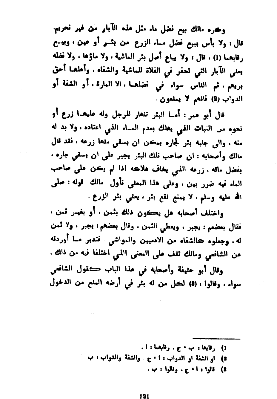 وَكَرِهَ مَالِكٌ بَيْعَ فَضْلِ مَاءِ مِثْلِ هَذِهِ الْآبَارِ مِنْ غَيْرِ تَحْرِيمٍ قَالَ وَلَا بَأْسَ بِبَيْعِ فَضْلِ مَاءِ الزَّرْعِ مِنْ بِئْرٍ أَوْ عَيْنٍ وَبَيْعِ رِقَابِهِمَا قَالَ وَلَا يُبَاعُ أَصْلُ بِئْرِ الْمَاشِيَةِ وَلَا مَاؤُهَا وَلَا فَضْلُهُ يَعْنِي الْآبَارَ الَّتِي تُحْفَرُ فِي الْفَلَاةِ لِلْمَاشِيَةِ وَالشِّفَاهِ وَأَهْلُهَا أَحَقُّ بِرَيِّهِمْ ثُمَّ النَّاسُ سَوَاءٌ فِي فَضْلِهَا إِلَّا الْمَارَّةَ أَوِ الشَّفَةَ أَوِ الدَّوَابَّ فَإِنَّهُمْ لَا يُمْنَعُونَ قَالَ أَبُو عُمَرَ أَمَّا الْبِئْرُ تَنْهَارُ لِلرَّجُلِ وَلَهُ عَلَيْهَا زَرْعٌ أَوْ نَحْوُهُ مِنَ النَّبَاتِ الَّذِي يَهْلِكُ بِعَدَمِ الْمَاءِ الَّذِي اعْتَادَهُ وَلَا بُدَّ لَهُ مِنْهُ وَإِلَى جَنْبِهِ بِئْرٌ لِجَارِهِ يُمْكِنُ أَنْ يَسْقِيَ مِنْهَا زَرْعَهُ فَقَدْ قَالَ مَالِكٌ وَأَصْحَابُهُ إِنَّ صَاحِبَ تِلْكَ الْبِئْرِ يُجْبَرُ عَلَى أَنْ يَسْقِيَ جَارُهُ بِفَضْلِ مَائِهِ زَرْعَهُ الَّذِي يَخَافُ هَلَاكَهُ إِذَا لَمْ يَكُنْ عَلَى صَاحِبِ الْمَاءِ فِيهِ ضَرَرٌ بَيِّنٌ وَعَلَى هَذَا الْمَعْنَى تَأَوَّلَ مَالِكٌ قَوْلِهِ صَلَّى اللَّهُ عَلَيْهِ وَسَلَّمَ لَا يَمْنَعُ نَقْعُ بِئْرٍ يَعْنِي بِئْرَ الزَّرْعِ وَاخْتَلَفَ أَصْحَابُهُ هَلْ يَكُونُ ذَلِكَ بِثَمَنٍ أَوْ بِغَيْرِ ثَمَنٍ فَقَالَ بضعهم يُجْبَرُ وَيُعْطَى الثَّمَنَ وَقَالَ بَعْضُهُمْ يُجْبَرُ وَلَا ثَمَنَ لَهُ وَجَعَلُوهُ كَالشِّفَاهِ مِنَ الْآدَمِيِّينَ وَالْمَوَاشِي فَتَدَبَّرْ مَا أَوْرَدْتُهُ عَنِ الشَّافِعِيِّ وَمَالِكٍ تَقِفْ عَلَى الْمَعْنَى الَّذِي اخْتَلَفَا فِيهِ مِنْ ذَلِكَ وَقَالَ أَبُو حَنِيفَةَ وَأَصْحَابُهُ فِي هَذَا الْبَابِ كَقَوْلِ الشَّافِعِيِّ سَوَاءً وَقَالُوا لِكُلِّ مَنْ لَهُ بِئْرٌ فِي أَرْضِهِ الْمَنْعُ مِنَ الدُّخُولِ