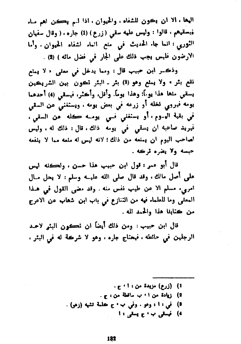 إِلَيْهَا إِلَّا أَنْ يَكُونَ لِلشِّفَاهِ وَالْحَيَوَانِ إِذَا لَمْ يَكُنْ لَهُمْ مَاءٌ فَيَسْقِيهِمْ قَالُوا وَلَيْسَ عَلَيْهِ سَقْيُ (زَرْعِ) جَارِهِ (وَقَالَ سُفْيَانُ الثَّوْرِيُّ إِنَّمَا جَاءَ الْحَدِيثُ فِي مَنْعِ الْمَاءِ لِشِفَاهِ الْحَيَوَانِ وَأَمَّا الْأَرْضُونَ فَلَيْسَ يَجِبُ ذَلِكَ عَلَى الْجَارِ فِي فَضْلِ مَائِهِ) وَذَكَرَ ابْنُ حَبِيبٍ قَالَ وَمِمَّا يَدْخُلُ فِي مَعْنَى لَا يُمْنَعُ نَقْعُ بِئْرٍ وَلَا يُمْنَعُ وَهُوَ بِئْرٌ الْبِئْرُ تَكُونُ بَيْنَ الشَّرِيكَيْنِ يَسْقِي مِنْهَا هَذَا يَوْمًا وَهَذَا يَوْمًا وَأَقَلَّ وَأَكْثَرَ فَيَسْقِي أَحَدُهُمَا يَوْمَهُ فَيَرْوِي نَخْلَهُ أَوْ زَرْعَهُ فِي بَعْضِ يَوْمِهِ وَيَسْتَغْنِي عَنِ السَّقْيِ فِي بَقِيَّةِ الْيَوْمِ أَوْ يَسْتَغْنِي فِي يَوْمِهِ كُلِّهِ عَنِ السَّقْيِ فَيُرِيدُ صَاحِبُهُ أَنْ يَسْقِيَ فِي يَوْمِهِ ذَلِكَ قَالَ ذَلِكَ لَهُ وَلَيْسَ لِصَاحِبِ الْيَوْمِ أَنْ يَمْنَعَهُ مِنْ ذَلِكَ لِأَنَّهُ لَيْسَ لَهُ مَنْعُهُ مِمَّا لَا يَنْفَعُهُ حَبْسُهُ وَلَا يَضُرُّهُ تَرْكُهُ قَالَ أَبُو عُمَرَ قَوْلُ ابْنُ حَبِيبٍ هَذَا حَسَنٌ وَلَكِنَّهُ لَيْسَ عَلَى أَصْلِ مَالِكٍ وَقَدْ قَالَ صَلَّى اللَّهُ عَلَيْهِ وَسَلَّمَ لَا يَحِلُّ مَالُ امْرِئٍ مُسْلِمٍ إِلَّا عَنْ طِيبِ نَفْسٍ مِنْهُ وَقَدْ مَضَى الْقَوْلُ فِي هَذَا الْمَعْنَى وَمَا لِلْعُلَمَاءِ فِيهِ مِنَ التَّنَازُعِ فِي بَابِ ابْنِ شِهَابٍ عَنِ الْأَعْرَجِ مِنْ كِتَابِنَا هَذَا وَالْحَمْدُ لِلَّهِ قَالَ ابْنُ حَبِيبٍ وَمِنْ ذَلِكَ أَيْضًا أَنْ تَكُونَ الْبِئْرُ لِأَحَدِ الرَّجُلَيْنِ فِي حَائِطِهِ فَيَحْتَاجُ جَارُهُ وَهُوَ لَا شَرِكَةَ لَهُ فِي البئر