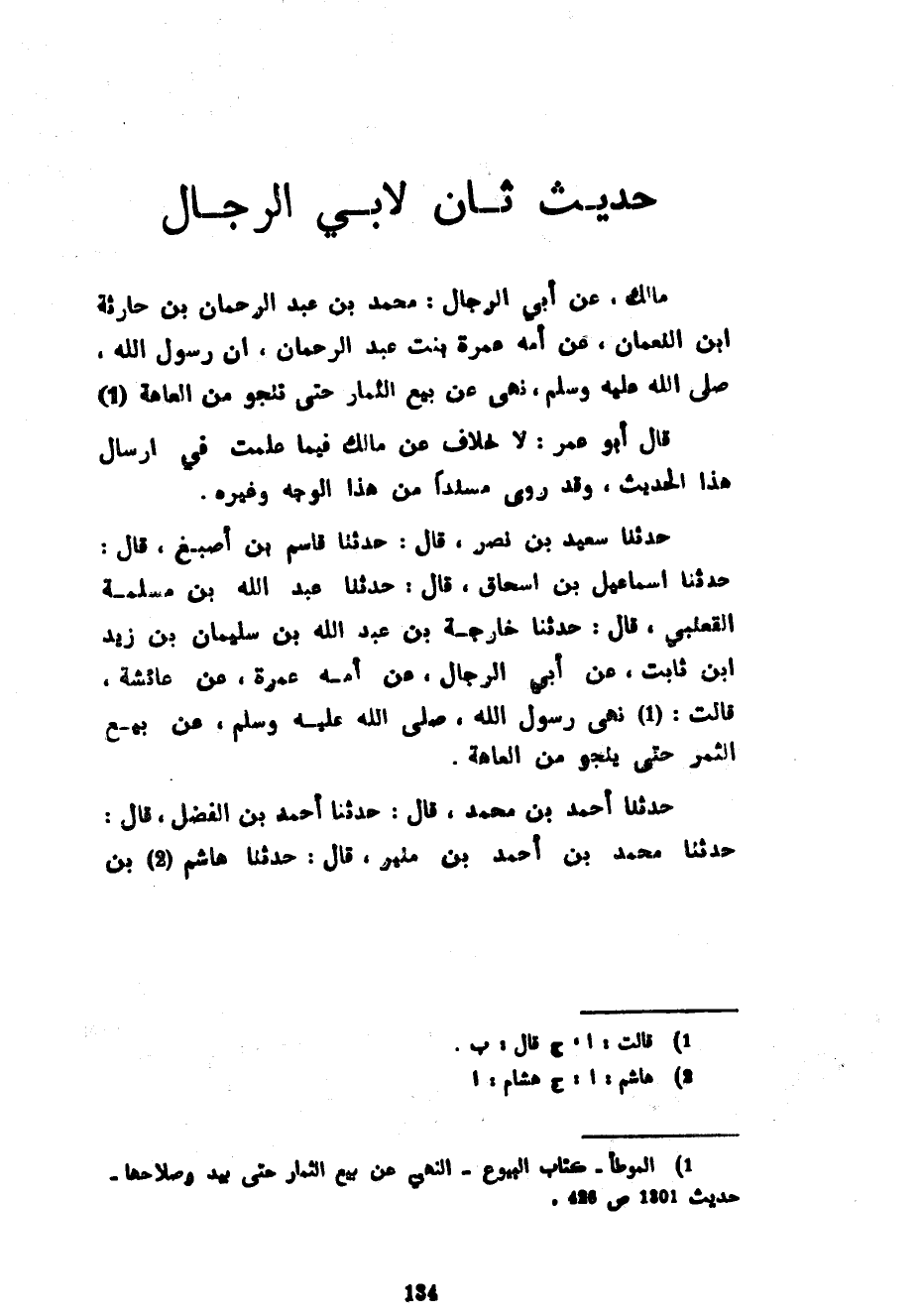 حَدِيثٌ ثَانٍ لِأَبِي الرِّجَالِ مَالِكٌ عَنْ أَبِي الرجال محمد بن عبد الرحمان بْنِ حَارِثَةَ بْنِ النُّعْمَانِ عَنْ أُمِّهِ عَمْرَةَ بنت عبد الرحمان أن رسول الله صلى الله عليه وسلم نَهَى عَنْ بَيْعِ الثِّمَارِ حَتَّى تَنْجُوَ مِنَ الْعَاهَةِ قَالَ أَبُو عُمَرَ لَا خِلَافَ عَنْ مَالِكٍ فِيمَا عَلِمْتُ فِي إِرْسَالِ هَذَا الْحَدِيثِ وَقَدْ رُوِيَ مُسْنَدًا مِنْ هَذَا الْوَجْهِ وَغَيْرِهِ حَدَّثَنَا سَعِيدُ بْنُ نَصْرٍ قَالَ حَدَّثَنَا قَاسِمُ بْنُ أَصْبَغَ قَالَ حَدَّثَنَا إِسْمَاعِيلُ بْنُ إِسْحَاقَ قَالَ حَدَّثَنَا عَبْدُ اللَّهِ بْنُ مَسْلَمَةَ الْقَعْنَبِيُّ قَالَ حَدَّثَنَا خَارِجَةُ بْنُ عَبْدِ اللَّهِ بْنِ سُلَيْمَانَ بْنِ زَيْدِ بْنِ ثَابِتٍ عَنْ أَبِي الرِّجَالِ عَنْ أُمِّهِ عَمْرَةَ عَنْ عَائِشَةَ قَالَتْ نَهَى رَسُولُ اللَّهِ صَلَّى اللَّهُ عَلَيْهِ وَسَلَّمَ عَنْ بَيْعِ الثَّمَرِ حَتَّى يَنْجُوَ مِنَ الْعَاهَةِ حَدَّثَنَا أَحْمَدُ بْنُ مُحَمَّدٍ قَالَ حَدَّثَنَا أَحْمَدُ بْنُ الْفَضْلِ قَالَ حَدَّثَنَا مُحَمَّدُ بْنُ أَحْمَدَ بْنِ مُنِيرٍ قَالَ حَدَّثَنَا هَاشِمُ بْنُ