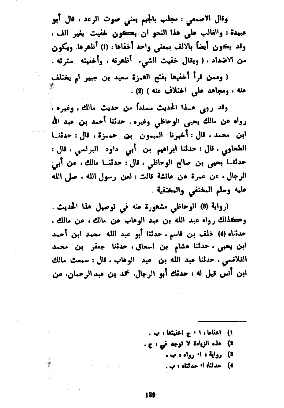 وقال الأصمعي مجلب بالجيم يعني صوت الرَّعْدُ قَالَ أَبُو عُبَيْدةَ وَالْغَالِبُ عَلَى هَذَا النَّحْوِ أَنْ يَكُونَ خَفَيْتُ بِغَيْرِ أَلْفٍ وَقَدْ يَكُونُ أَيْضًا بِالْأَلْفِ بِمَعْنًى وَاحِدٍ أَخْفَاهَا أَظْهَرَهَا وَيَكُونُ مِنَ الْأَضْدَادِ (وَيُقَالُ خَفَيْتُ الشَّيْءَ أَظْهَرْتُهُ وَأَخْفَيْتُهُ سَتَرْتُهُ (وَمِمَّنْ قَرَأَ أَخْفِيهَا بِفَتْحِ الْهَمْزَةِ سَعِيدُ بْنُ جُبَيْرٍ لَمْ يُخْتَلَفْ عَنْهُ وَمُجَاهِدٌ عَلَى اخْتِلَافٍ عَنْهُ) وَقَدْ رَوَى هَذَا الْحَدِيثَ مُسْنَدًا مِنْ حَدِيثِ مَالِكٍ وَغَيْرِهِ رَوَاهُ عَنْ مَالِكٍ يَحْيَى الْوُحَاظِيُّ وَغَيْرُهُ حَدَّثَنَا أَحْمَدُ بْنُ عبد الله ابن مُحَمَّدٍ قَالَ أَخْبَرَنَا الْمَيْمُونُ بْنُ حَمْزَةَ قَالَ حَدَّثَنَا الطَّحَاوِيُّ قَالَ حَدَّثَنَا إِبْرَاهِيمُ بْنُ أَبِي دَاوُدَ الْبُرُلُّسِيُّ قَالَ حَدَّثَنَا يَحْيَى بْنُ صَالِحٍ الْوُحَاظِيُّ قَالَ حَدَّثَنَا مَالِكٌ عَنْ أَبِي الرِّجَالِ عَنْ عَمْرَةَ عَنْ عَائِشَةَ قَالَتْ لَعَنَ رَسُولُ اللَّهِ صَلَّى اللَّهُ عَلَيْهِ وَسَلَّمَ الْمُخْتَفِيَ وَالْمُخْتَفِيَةَ (رِوَايَةُ (3) الْوُحَاظِيِّ مَشْهُورَةٌ عَنْهُ فِي تَوْصِيلِ هَذَا الْحَدِيثِ وَكَذَلِكَ رَوَاهُ عَبْدُ اللَّهِ بْنُ عَبْدِ الْوَهَّابِ عَنْ مَالِكٍ عَنْ مَالِكٍ حَدَّثَنَاهُ خَلَفُ بْنُ قَاسِمٍ حَدَّثَنَا أَبُو عَبْدِ اللَّهِ مُحَمَّدُ بْنُ أَحْمَدَ بْنِ يَحْيَى حَدَّثَنَا هِشَامُ بْنُ إِسْحَاقَ حَدَّثَنَا جَعْفَرُ بْنُ مُحَمَّدٍ الْقَلَانِسِيُّ حَدَّثَنَا عَبْدُ اللَّهِ بْنُ عَبْدِ الْوَهَّابِ قَالَ سَمِعْتُ مَالِكَ بْنَ أَنَسٍ قِيلَ لَهُ حَدَّثَكَ أَبُو الرجال محمد بن عبد الرحمان عن