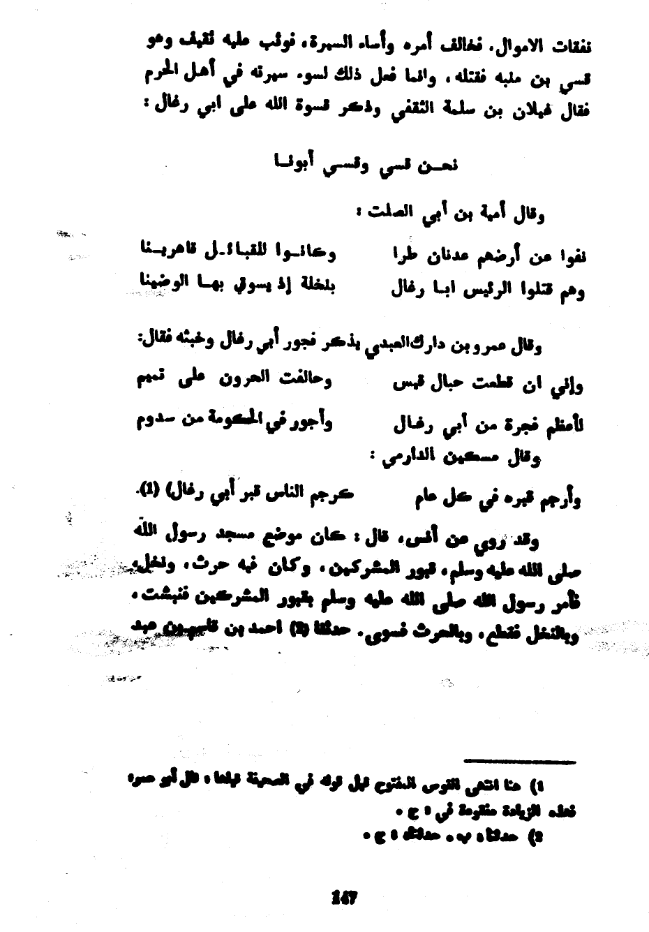 نَفَقَاتِ الْأَمْوَالِ فَخَالَفَ أَمْرَهُ وَأَسَاءَ السِّيرَةَ فَوَثَبَ عَلَيْهِ ثَقِيفٌ وَهُوَ قَسِيُّ بْنُ مُنَبِّهٍ فَقَتَلَهُ وَإِنَّمَا فَعَلَ ذَلِكَ لِسُوءِ سِيرَتِهِ فِي أَهْلِ الْحَرَمِ فَقَالَ غَيْلَانُ بْنُ سَلَمَةَ الثَّقَفِيُّ وَذَكَرَ قَسْوَةَ اللَّهِ عَلَى أَبِي رِغَالٍ ... نَحْنُ قَسِيٌّ وَقَسِيٌّ أَبُونَا ... وَقَالَ أُمَيَّةُ بْنُ أَبِي الصَّلْتِ ... نَفَوْا عَنْ أَرْضِهِمْ عَدْنَانَ طُرًّا ... وَكَانُوا لِلْقَبَائِلِ قَاهِرِينَا ... ... وَهُمْ قَتَلُوا الرَّئِيسَ أَبَا رِغَالٍ ... بِنَخْلَةَ إِذْ يَسُوقُ بِهَا الْوَضِينَا ... وَقَالَ عَمْرُو بْنُ دَارِكٍ الْعَبْدِيُّ يَذْكُرُ فُجُورَ أَبِي رِغَالٍ وَخُبْثَهُ فَقَالَ ... وَإِنِّي إِنْ قَطَعْتُ حِبَالَ قَيْسٍ ... وَحَالَفْتُ الْحَرُونَ عَلَى تَمِيمِ ... ... لَأَعْظَمُ فَجَرَةً مِنْ أَبِي رِغَالٍ ... وَأَجْوَرُ فِي الْحُكُومَةِ مِنْ سَدُومِ ... وَقَالَ مِسْكِينٌ الدَّارِمِيُّ ... وَأَرْجُمُ قَبْرَهُ فِي كُلِّ عَامٍ ... كَرَجْمِ النَّاسِ قَبْرَ أَبِي رِغَالِ) ... وَقَدْ رُوِيَ عَنْ أَنَسٍ قَالَ كَانَ مَوْضِعُ مَسْجِدِ رَسُولِ اللَّهِ صَلَّى اللَّهُ عَلَيْهِ وَسَلَّمَ قُبُورَ الْمُشْرِكِينَ وَكَانَ فِيهِ حَرْثٌ وَنَخْلٌ فَأَمَرَ رَسُولُ اللَّهِ صَلَّى اللَّهُ عَلَيْهِ وَسَلَّمَ بِقُبُورِ الْمُشْرِكِينَ فَنُبِشَتْ وَبِالنَّخْلِ فَقُطِعَ وَبِالْحَرْثِ فَسُوِّيَ حَدَّثَنَا أَحْمَدُ بْنُ قاسم بن عبد