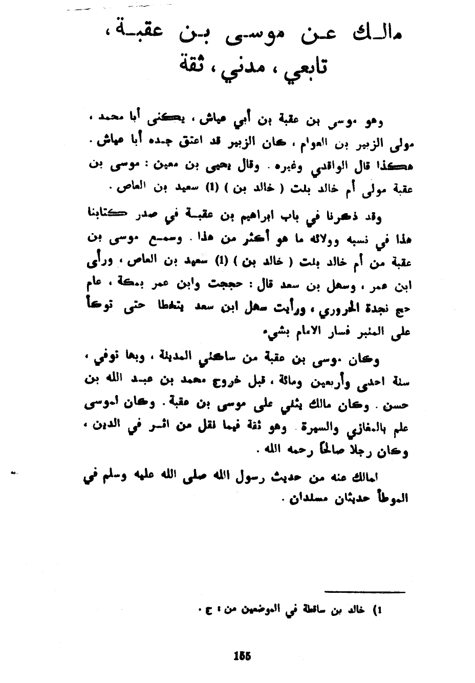 مَالِكٌ عَنْ مُوسَى بْنِ عُقْبَةَ تَابِعِيٌّ مَدَنِيٌّ ثِقَةٌ وَهُوَ مُوسَى بْنُ عُقْبَةَ بْنِ أَبِي عَيَّاشٍ يُكَنَّى أَبَا مُحَمَّدٍ مَوْلَى الزُّبَيْرِ بْنِ الْعَوَّامِ كَانَ الزُّبَيْرُ قَدْ أَعْتَقَ جَدَّهُ أَبَا عَيَّاشٍ هَكَذَا قَالَ الْوَاقِدِيُّ وَغَيْرُهُ وَقَالَ يَحْيَى بْنُ مَعِينٍ مُوسَى بْنُ عُقْبَةَ مَوْلَى أُمِّ خَالِدٍ بِنْتِ (خَالِدِ بْنِ) سَعِيدِ بْنِ الْعَاصِ وَقَدْ ذَكَرْنَا فِي بَابِ إِبْرَاهِيمَ بْنِ عُقْبَةَ فِي صَدْرِ كِتَابِنَا هَذَا فِي نَسَبِهِ وَوَلَائِهِ مَا هُوَ أَكْثَرُ مِنْ هَذَا وَسَمِعَ مُوسَى بْنُ عُقْبَةَ مِنْ أُمِّ خَالِدٍ بِنْتِ (خَالِدِ بْنِ) سَعِيدِ بْنِ الْعَاصِ وَرَأَى ابْنَ عُمَرَ وَسَهْلَ بْنَ سَعْدٍ قَالَ حَجَجْتُ وَابْنُ عُمَرَ بِمَكَّةَ عَامَ حَجَّ نَجْدَةُ الْحَرُورِيُّ وَرَأَيْتُ سَهْلَ بن سعد يتخطا حَتَّى تَوَكَّأَ عَلَى الْمِنْبَرِ فَسَارَّ الْإِمَامَ بِشَيْءٍ وَكَانَ مُوسَى بْنُ عُقْبَةَ مِنْ سَاكِنِي الْمَدِينَةِ وَبِهَا تُوُفِّيَ سَنَةَ إِحْدَى وَأَرْبَعِينَ وَمِائَةٍ قَبْلَ خُرُوجِ مُحَمَّدِ بْنِ عَبْدِ اللَّهِ بْنِ حَسَنٍ وَكَانَ مَالِكٌ يُثْنِي عَلَى مُوسَى بْنِ عُقْبَةَ وَكَانَ لِمُوسَى عِلْمٌ بِالْمَغَازِي وَالسِّيرَةِ وَهُوَ ثِقَةٌ فِيمَا نَقَلَ عَنْ أَثَرٍ فِي الدِّينِ وَكَانَ رَجُلًا صَالِحًا رَحِمَهُ اللَّهُ لِمَالِكٍ عَنْهُ مِنْ حَدِيثِ رَسُولِ اللَّهِ صَلَّى اللَّهُ عَلَيْهِ وَسَلَّمَ فِي الْمُوَطَّأِ حَدِيثَانِ مُسْنَدَانِ