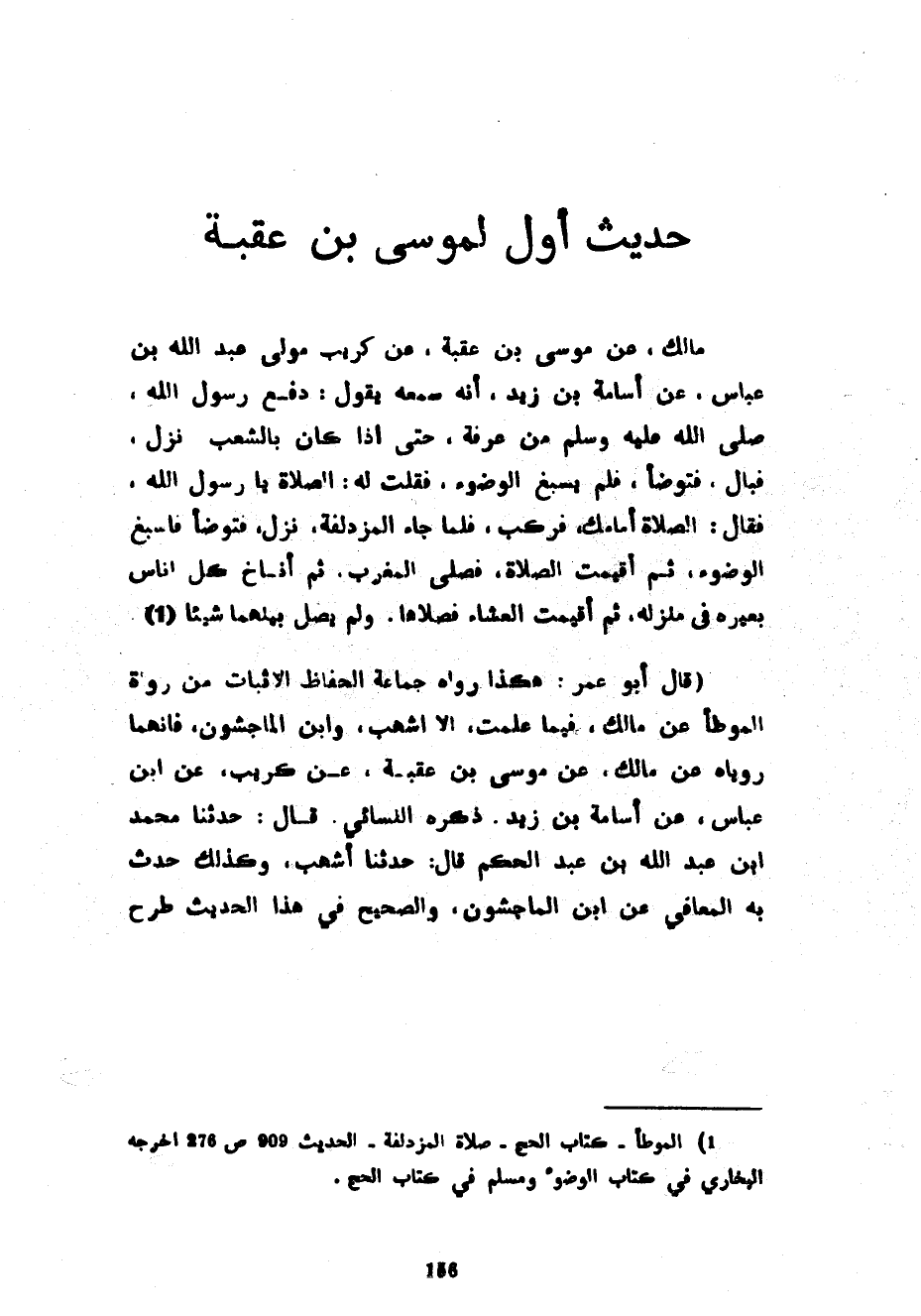 حَدِيثٌ أَوَّلُ لِمُوسَى بْنِ عُقْبَةَ مَالِكٍ عَنْ مُوسَى بْنِ عُقْبَةَ عَنْ كُرَيْبٍ مَوْلَى عَبْدِ الله بن عَبَّاسٍ عَنْ أُسَامَةَ بْنِ زَيْدٍ أَنَّهُ سَمِعَهُ يَقُولُ دَفَعَ رَسُولُ اللَّهِ صَلَّى اللَّهُ عَلَيْهِ وَسَلَّمَ مِنْ عَرَفَةَ حَتَّى إِذَا كَانَ بِالشِّعَبِ نَزَلَ فَبَالَ فَتَوَضَّأَ فَلَمْ يُسْبِغِ الْوُضُوءَ فَقُلْتُ لَهُ الصَّلَاةُ يَا رَسُولَ اللَّهِ فَقَالَ الصَّلَاةُ أَمَامَكَ فَرَكِبَ فَلَمَّا جَاءَ الْمُزْدَلِفَةَ نَزَلَ فَتَوَضَّأَ فَأَسْبَغَ الْوُضُوءَ ثُمَّ أُقِيمَتِ الصَّلَاةُ فَصَلَّى الْمَغْرِبَ ثُمَّ أَنَاخَ كُلُّ أُنَاسٍ بِعِيرَهُ فِي مَنْزِلِهِ ثُمَّ أُقِيمَتِ الْعِشَاءُ فَصَلَّاهَا وَلَمْ يُصَلِّ بَيْنَهُمَا شَيْئًا (قَالَ أَبُو عُمَرَ هَكَذَا رَوَاهُ جَمَاعَةُ الْحُفَّاظِ الْأَثْبَاتِ مِنْ رُوَاةِ الْمُوَطَّأِ عَنْ مَالِكٍ فِيمَا عَلِمْتُ إِلَّا أَشْهَبَ وَابْنَ الْمَاجِشُونِ فَإِنَّهُمَا رَوَيَاهُ عَنْ مَالِكٍ عَنْ مُوسَى بْنِ عُقْبَةَ عَنْ كُرَيْبٍ عَنِ ابْنِ عَبَّاسٍ عَنْ أُسَامَةَ بْنِ زَيْدٍ ذَكَرَهُ النَّسَائِيُّ قَالَ حَدَّثَنَا مُحَمَّدُ بْنُ عَبْدِ اللَّهِ بْنِ عَبْدِ الْحَكَمِ قَالَ حَدَّثَنَا أَشْهَبُ وَكَذَلِكَ حَدَّثَ بِهِ الْمُعَافَى عَنِ ابْنِ الْمَاجِشُونِ وَالصَّحِيحُ فِي هَذَا الحديث طرح