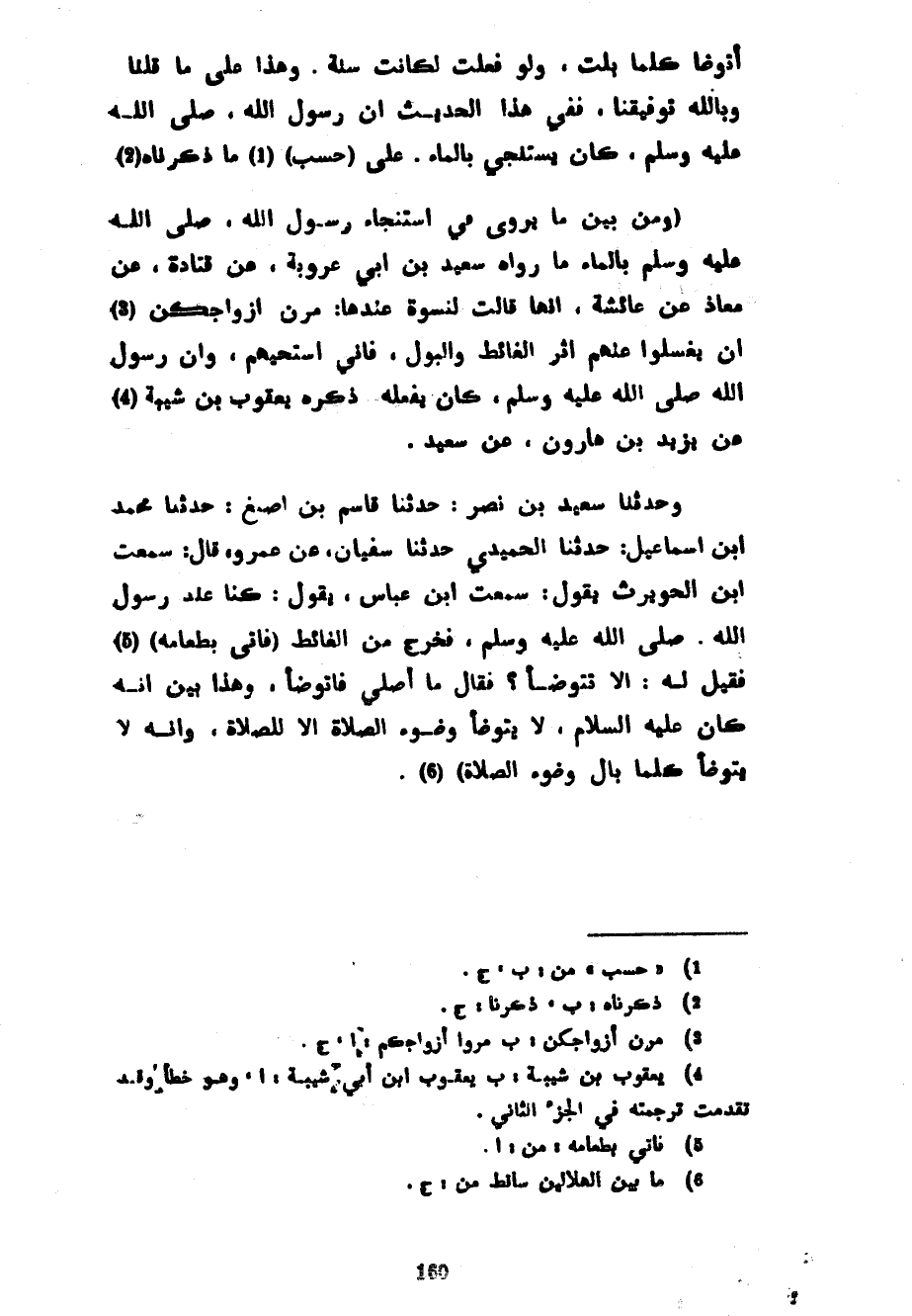أَتَوَضَّأَ كُلَّمَا بُلْتُ وَلَوْ فَعَلْتُ لَكَانَتْ سُنَّةً وَهَذَا عَلَى مَا قُلْنَا وَبِاللَّهِ تَوْفِيقُنَا فَفِي هَذَا الْحَدِيثِ أَنَّ رَسُولَ اللَّهِ صَلَّى اللَّهُ عَلَيْهِ وَسَلَّمَ كَانَ يَسْتَنْجِي بِالْمَاءِ عَلَى (حَسَبِ) مَا ذَكَرْنَاهُ (وَمِنْ بَيْنِ مَا يُرْوَى فِي اسْتِنْجَاءِ رَسُولِ اللَّهِ صَلَّى اللَّهُ عَلَيْهِ وَسَلَّمَ بِالْمَاءِ مَا رَوَاهُ سَعِيدُ بْنُ أَبِي عَرُوبَةَ عَنْ قَتَادَةَ عَنْ مُعَاذٍ عَنْ عَائِشَةَ أَنَّهَا قَالَتْ لِنِسْوَةٍ عِنْدَهَا مُرْنَ أَزْوَاجَكُنَّ أَنْ يَغْسِلُوا عَنْهُمْ أَثَرَ الْغَائِطِ وَالْبَوْلِ فَإِنِّي أَسْتَحِيهُمْ وَأَنَّ رَسُولَ اللَّهِ صَلَّى اللَّهُ عَلَيْهِ وَسَلَّمَ كَانَ يَفْعَلُهُ ذَكَرَهُ يَعْقُوبُ بْنُ شَيْبَةَ عَنْ يَزِيدَ بْنِ هَارُونَ عَنْ سَعِيدٍ وَحَدَّثَنَا سَعِيدُ بْنُ نَصْرٍ حَدَّثَنَا قَاسِمُ بْنُ أَصْبَغَ حَدَّثَنَا مُحَمَّدُ بْنُ إِسْمَاعِيلَ حَدَّثَنَا الْحُمَيْدِيُّ حَدَّثَنَا سُفْيَانُ عَنْ عَمْرٍو قَالَ سَمِعْتُ ابْنَ الْحُوَيْرِثِ يَقُولُ سَمِعْتُ ابْنُ عَبَّاسٍ يَقُولُ كُنَّا عِنْدَ رَسُولِ اللَّهِ صَلَّى اللَّهُ عَلَيْهِ وَسَلَّمَ فَخَرَجَ مِنَ الْغَائِطِ (فَأَتَى بِطَعَامِهِ) فَقِيلَ لَهُ أَلَا تَتَوَضَّأُ فَقَالَ مَا أُصَلِّي فَأَتَوَضَّأُ وَهَذَا بَيَّنَ أَنَّهُ كَانَ عَلَيْهِ السَّلَامُ لَا يَتَوَضَّأُ وُضُوءَ الصَّلَاةِ إِلَّا لِلصَّلَاةِ وَأَنَّهُ لَا يَتَوَضَّأُ كُلَّمَا بَالَ وُضُوءَ الصلاة)