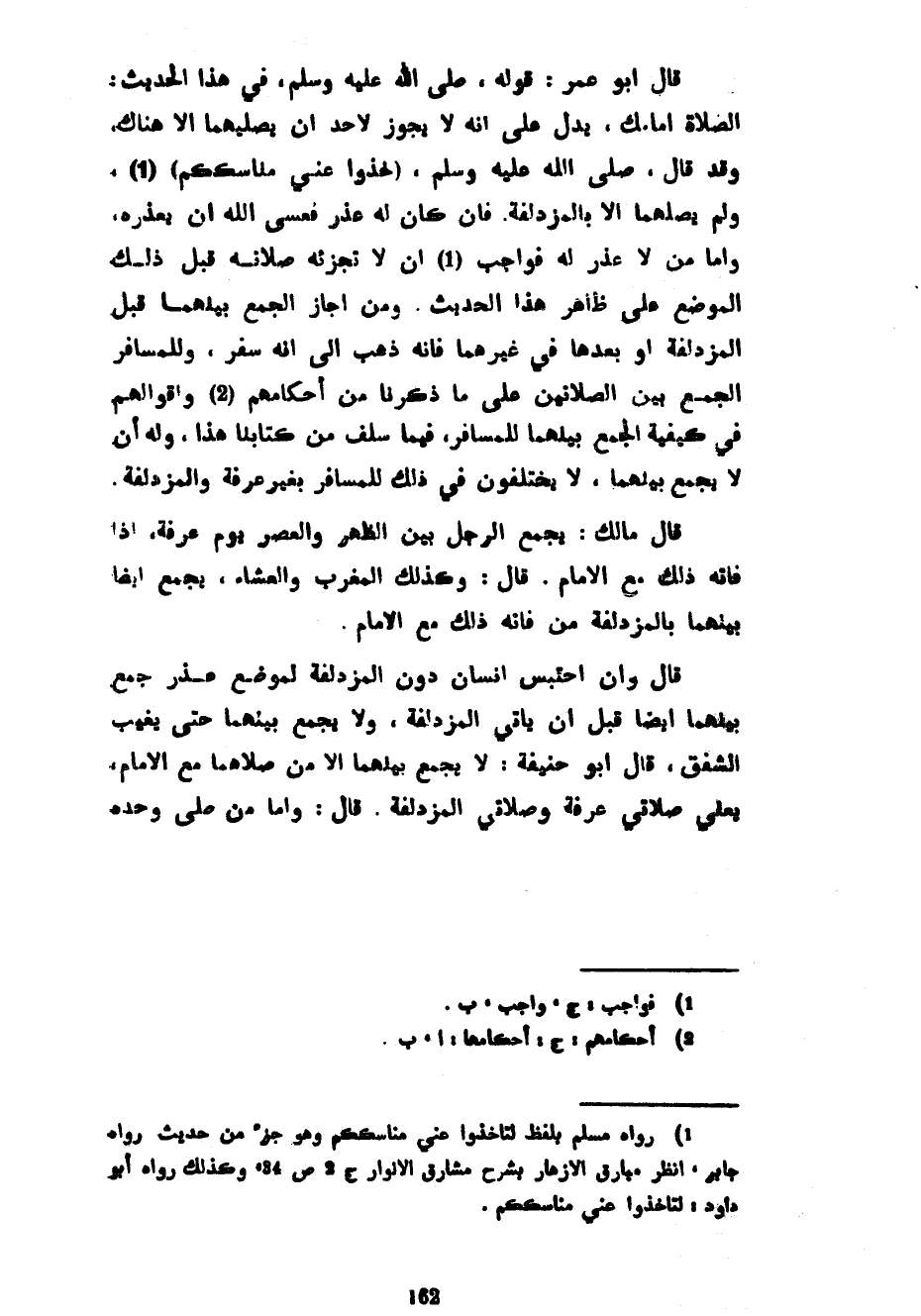 قَالَ أَبُو عُمَرَ قَوْلُهُ صَلَّى اللَّهُ عَلَيْهِ وَسَلَّمَ فِي هَذَا الْحَدِيثِ الصَّلَاةُ أَمَامَكَ يَدُلُّ عَلَى أَنَّهُ لَا يَجُوزُ لِأَحَدٍ أَنْ يُصَلِّيَهُمَا إِلَّا هُنَاكَ وَقَدْ قَالَ صَلَّى اللَّهُ عَلَيْهِ وَسَلَّمَ (خُذُوا عَنِّي مَنَاسِكَكُمْ) وَلَمْ يُصَلِّهِمَا إِلَّا بِالْمُزْدَلِفَةِ فَإِنْ كَانَ لَهُ عُذْرٌ فَعَسَى اللَّهُ أَنْ يَعْذُرَهُ وَأَمَّا مَنْ لَا عُذْرَ لَهُ فَوَاجِبٌ أَنْ لَا تُجْزِئَهُ صِلَاتُهُ قَبْلَ ذَلِكَ الْمَوْضِعِ عَلَى ظَاهِرِ هَذَا الْحَدِيثِ وَمَنْ أَجَازَ الْجَمْعَ بَيْنَهُمَا قَبْلَ الْمُزْدَلِفَةِ أَوْ بَعْدَهَا فِي غَيْرِهِمَا فَإِنَّهُ ذَهَبَ إِلَى أَنَّهُ سَفَرٌ وَلِلْمُسَافِرِ الْجَمْعُ بَيْنَ الصَّلَاتَيْنِ عَلَى مَا ذَكَرْنَا مِنْ أَحْكَامِهِمْ وَأَقْوَالِهِمْ فِي كَيْفِيَّةِ الْجَمْعِ بَيْنَهُمَا لِلْمُسَافِرِ فِيمَا سَلَفَ مِنْ كِتَابِنَا هَذَا وَلَهُ أَنْ لَا يَجْمَعَ بَيْنَهُمَا لَا يَخْتَلِفُونَ فِي ذَلِكَ لِلْمُسَافِرِ بِغَيْرِ عَرَفَةَ وَالْمُزْدَلِفَةِ قَالَ مَالِكٌ يَجْمَعُ الرَّجُلُ بَيْنَ الظُّهْرِ وَالْعَصْرِ يَوْمَ عَرَفَةَ إِذَا فَاتَهُ ذَلِكَ مَعَ الْإِمَامِ قَالَ وَكَذَلِكَ الْمَغْرِبُ وَالْعَشَاءُ يَجْمَعُ أَيْضًا بَيْنَهُمَا بِالْمُزْدَلِفَةِ مَنْ فَاتَهُ ذَلِكَ مَعَ الْإِمَامِ قَالَ وَإِنِ احْتُبِسَ إِنْسَانٌ دُونَ الْمُزْدَلِفَةِ لِمَوْضِعِ عُذْرٍ جَمَعَ بَيْنَهُمَا أَيْضًا قَبْلَ أَنْ يَأْتِيَ الْمُزْدَلِفَةَ وَلَا يَجْمَعُ بَيْنَهُمَا حَتَّى يَغِيبَ الشَّفَقُ قَالَ أَبُو حَنِيفَةَ لَا يَجْمَعُ بَيْنَهُمَا إِلَّا مَنْ صَلَّاهُمَا مَعَ الْإِمَامِ يَعْنِي صَلَاتَيْ عَرَفَةَ وَصَلَاتَيِ الْمُزْدَلِفَةِ قَالَ وَأَمَّا مَنْ صَلَّى وَحْدَهُ