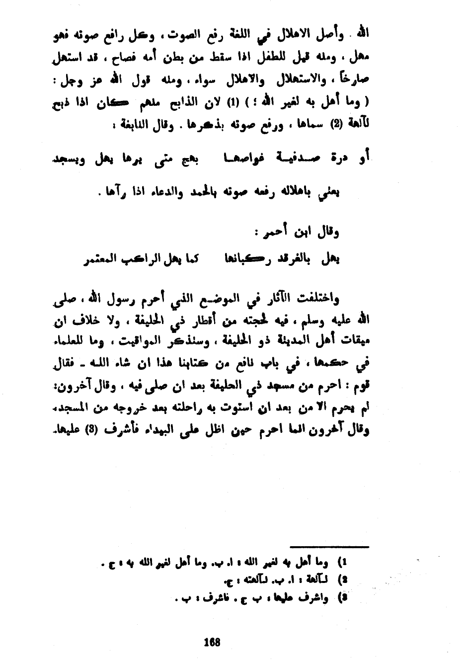 اللَّهُ وَأَصْلُ الْإِهْلَالِ فِي اللُّغَةِ رَفْعُ الصَّوْتِ وَكُلُّ رَافِعٍ صَوْتَهُ فَهُوَ مُهِلٌّ وَمِنْهُ قِيلَ لِلطِّفْلِ إِذَا سَقَطَ مِنْ بَطْنِ أُمِّهِ فَصَاحَ قَدِ اسْتَهَلَّ صَارِخًا وَالِاسْتِهْلَالُ وَالْإِهْلَالُ سَوَاءٌ وَمِنْهُ قَوْلُ اللَّهِ عَزَّ وَجَلَّ وَمَا أُهِلَّ بِهِ لِغَيْرِ اللَّهِ لِأَنَّ الذَّابِحَ مِنْهُمْ كَانَ إِذَا ذَبَحَ لِآلِهَةٍ سَمَّاهَا وَرَفَعَ صَوْتَهُ بِذِكْرِهَا وَقَالَ النَّابِغَةُ ... أَوْ دُرَّةٍ صَدَفِيَّةٍ غَوَّاصُهَا ... بَهِجٌ مَتَى يَرَهَا يُهِلَّ وَيَسْجُدِ ... يَعْنِي بِإِهْلَالِهِ رَفْعَهُ صَوْتَهُ بِالْحَمْدِ وَالدُّعَاءِ إِذَا رَآهَا وَقَالَ ابْنُ أَحْمَرَ ... يُهِلُّ بِالْغَرْقَدِ رُكْبَانُهَا ... كَمَا يُهِلُّ الرَّاكِبُ الْمُعْتَمِرُ ... وَاخْتَلَفَتِ الْآثَارُ فِي الْمَوْضِعِ الَّذِي أَحْرَمَ رَسُولِ اللَّهِ صَلَّى اللَّهُ عَلَيْهِ وَسَلَّمَ فِيهِ لِحَجَّتِهِ مِنْ أَقْطَارِ ذِي الْحُلَيْفَةِ وَلَا خِلَافَ أَنَّ مِيقَاتَ أَهْلِ الْمَدِينَةِ ذُو الْحُلَيْفَةِ وَسَنَذْكُرُ الْمَوَاقِيتَ وَمَا لِلْعُلَمَاءِ فِي حُكْمِهَا فِي بَابِ نَافِعٍ مِنْ كِتَابِنَا هَذَا إِنْ شَاءَ اللَّهُ فَقَالَ قَوْمٌ أَحْرَمَ مِنْ مَسْجِدِ ذِي الْحُلَيْفَةِ بَعْدَ أَنْ صَلَّى فِيهِ وَقَالَ آخَرُونَ لَمْ يُحْرِمْ إِلَّا مِنْ بَعْدِ أَنِ اسْتَوَتْ بِهِ رَاحِلَتُهُ بَعْدَ خُرُوجِهِ مِنَ الْمَسْجِدِ وَقَالَ آخَرُونَ إِنَّمَا أَحْرَمَ حِينَ أَظَلَّ عَلَى الْبَيْدَاءِ فَأَشْرَفَ عَلَيْهَا