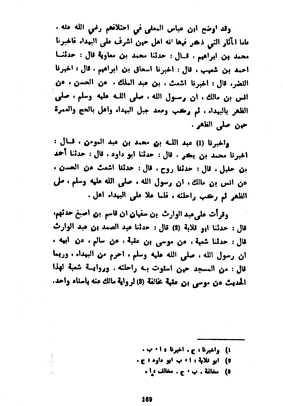 وَقَدْ أَوْضَحَ ابْنُ عَبَّاسٍ الْمَعْنَى فِي اخْتِلَافِهِمْ رَضِيَ اللَّهُ عَنْهُ فَأَمَّا الْآثَارُ الَّتِي ذُكِرَ فِيهَا أَنَّهُ أَهَلَّ حِينَ أَشْرَفَ عَلَى الْبَيْدَاءِ فَأَخْبَرَنَا مُحَمَّدُ بْنُ إِبْرَاهِيمَ قَالَ حَدَّثَنَا مُحَمَّدُ بْنُ مُعَاوِيَةَ قَالَ حَدَّثَنَا أَحْمَدُ بْنُ شُعَيْبٍ قَالَ أَخْبَرَنَا إِسْحَاقُ بْنُ إِبْرَاهِيمَ قَالَ أَخْبَرَنَا النَّضْرُ قَالَ أَخْبَرَنَا أَشْعَثُ بْنُ عَبْدِ الْمَلِكِ عَنِ الْحَسَنِ عَنْ أَنَسِ بْنِ مَالِكٍ أَنَّ رَسُولَ اللَّهِ صَلَّى اللَّهُ عَلَيْهِ وَسَلَّمَ صَلَّى الظُّهْرَ بِالْبَيْدَاءِ ثُمَّ رَكِبَ وَصَعِدَ جَبَلَ الْبَيْدَاءِ وَأَهَلَّ بِالْحَجِّ وَالْعُمْرَةِ حِينَ صَلَّى الظُّهْرَ وَأَخْبَرَنَا عَبْدُ اللَّهِ بْنُ مُحَمَّدِ بْنِ عَبْدِ الْمُؤْمِنِ قَالَ أَخْبَرَنَا مُحَمَّدُ بْنُ بَكْرٍ قَالَ حَدَّثَنَا أَبُو دَاوُدَ قَالَ حَدَّثَنَا أَحْمَدُ بْنُ حَنْبَلٍ قَالَ حَدَّثَنَا رَوْحٌ قَالَ حَدَّثَنَا أَشْعَثُ عَنِ الْحَسَنِ عَنْ أَنَسِ بْنِ مَالِكٍ أَنَّ رَسُولَ اللَّهِ صَلَّى اللَّهُ عَلَيْهِ وَسَلَّمَ صَلَّى الظُّهْرَ ثُمَّ رَكِبَ رَاحِلَتَهُ فَلَمَّا عَلَا عَلَى الْبَيْدَاءِ أَهَلَّ وَقَرَأْتُ عَلَى عَبْدِ الْوَارِثِ بْنِ سُفْيَانَ أَنَّ قَاسِمَ بْنَ أَصْبَغَ حَدَّثَهُمْ قَالَ حَدَّثَنَا أَبُو قِلَابَةَ قَالَ حَدَّثَنَا عَبْدُ الصَّمَدِ بْنُ عَبْدِ الْوَارِثِ قَالَ حَدَّثَنَا شُعْبَةُ عَنْ مُوسَى بْنِ عُقْبَةَ عَنْ سَالِمٍ عَنْ أَبِيهِ أَنَّ رَسُولَ اللَّهِ صَلَّى اللَّهُ عَلَيْهِ وَسَلَّمَ أَحْرَمَ مِنَ الْبَيْدَاءِ وَرُبَّمَا قَالَ مِنَ الْمَسْجِدِ حِينَ اسْتَوَتْ بِهِ رَاحِلَتُهُ وَرِوَايَةُ شُعْبَةَ لِهَذَا الْحَدِيثِ عَنْ مُوسَى بْنِ عُقْبَةَ مُخَالِفَةٌ لِرِوَايَةِ مَالِكٍ عَنْهُ بِإِسْنَادٍ وَاحِدٍ