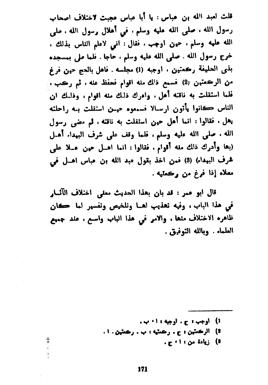 قُلْتُ لِعَبْدِ اللَّهِ بْنِ عَبَّاسٍ يَا أَبَا عَبَّاسٍ عَجِبْتُ لِاخْتِلَافِ أَصْحَابِ رَسُولِ اللَّهِ صَلَّى اللَّهُ عَلَيْهِ وَسَلَّمَ فِي إِهْلَالِ رَسُولِ اللَّهِ صَلَّى اللَّهُ عَلَيْهِ وَسَلَّمَ حِينَ أَوْجَبَ فَقَالَ إِنِّي لَأَعْلَمُ النَّاسِ بِذَلِكَ خَرَجَ رَسُولُ اللَّهِ صَلَّى اللَّهُ عَلَيْهِ وَسَلَّمَ حَاجًّا فَلَمَّا صَلَّى بِمَسْجِدِهِ بِذِي الْحُلَيْفَةِ رَكْعَتَيْنِ أَوْجَبَهُ مَجْلِسُهُ فَأَهَلَّ بِالْحَجِّ حِينَ فَرَغَ مِنَ الرَّكْعَتَيْنِ فَسَمِعَ مِنْهُ أَقْوَامٌ فَحَفِظَ عَنْهُ ثُمَّ رَكِبَ فَلَمَّا اسْتَقَلَّتْ بِهِ نَاقَتُهُ أَهَلَّ وَأَدْرَكَ ذَلِكَ مِنْهُ أَقْوَامٌ وَذَلِكَ أَنَّ النَّاسَ كَانُوا يَأْتُونَ أَرْسَالًا فَسَمِعُوهُ حِينَ اسْتَقَلَّتْ بِهِ رَاحِلَتُهُ يُهِلُّ فَقَالُوا إِنَّمَا أَهَلَّ حِينَ اسْتَقَلَّتْ بِهِ نَاقَتُهُ ثُمَّ مَضَى رَسُولُ اللَّهِ صَلَّى اللَّهُ عَلَيْهِ وَسَلَّمَ فَلَمَّا وَقَفَ عَلَى شَرَفِ الْبَيْدَاءِ أَهَلَّ (بِهَا وَأَدْرَكَ ذَلِكَ مِنْهُ أَقْوَامٌ فَقَالُوا إِنَّمَا أَهَلَّ حِينَ عَلَا عَلَى شَرَفِ الْبَيْدَاءِ) فَمَنْ أَخَذَ بِقَوْلِ عَبْدِ اللَّهِ بْنِ عَبَّاسٍ أَهَلَّ فِي مُصَلَّاهُ إِذَا فَرَغَ مِنْ رَكْعَتَيْهِ قَالَ أَبُو عُمَرَ قَدْ بَانَ بِهَذَا الْحَدِيثِ مَعْنَى اخْتِلَافِ الْآثَارِ فِي هَذَا الْبَابِ وَفِيهِ تَهْذِيبٌ لَهَا وَتَلْخِيصٌ وَتَفْسِيرٌ لِمَا كَانَ ظَاهِرُهُ الِاخْتِلَافُ مِنْهَا وَالْأَمْرُ في هذا الباب واسع عِنْدَ جَمِيعِ الْعُلَمَاءِ وَبِاللَّهِ التَّوْفِيقُ