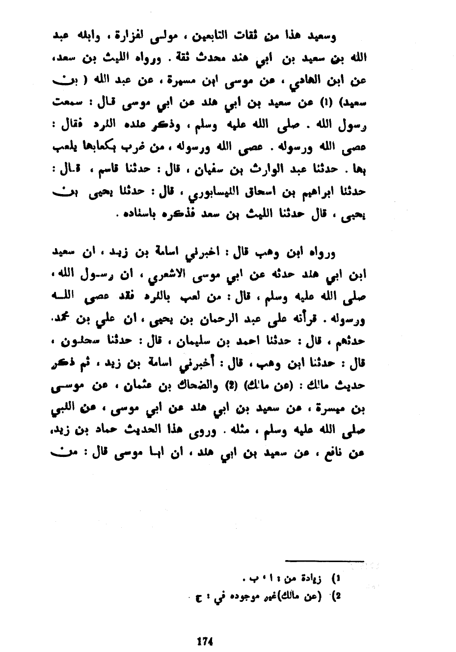 وَسَعِيدٌ هَذَا مِنْ ثِقَاتِ التَّابِعِينَ مَوْلًى لِفَزَارَةَ وَابْنُهُ عَبْدِ اللَّهِ بْنِ سَعِيدِ بْنِ أَبِي هِنْدٍ مُحَدِّثٌ ثِقَةٌ وَرَوَاهُ اللَّيْثُ بْنُ سَعْدٍ عَنِ ابْنِ الْهَادِي عَنْ مُوسَى بْنِ مَيْسَرَةَ عَنْ عَبْدِ اللَّهِ (بْنِ سَعِيدٍ) عَنْ سَعِيدِ بْنِ أَبِي هِنْدٍ عَنْ أَبِي موسى قَالَ سَمِعْتُ رَسُولَ اللَّهِ صَلَّى اللَّهُ عَلَيْهِ وسلم وَذُكِرَ عِنْدَهُ النَّرْدُ فَقَالَ عَصَى اللَّهَ وَرَسُولَهُ عَصَى اللَّهَ وَرَسُولَهُ مَنْ ضَرَبَ بِكِعَابِهَا يَلْعَبُ بِهَا حَدَّثَنَا عَبْدُ الْوَارِثِ بْنُ سُفْيَانَ قَالَ حَدَّثَنَا قَاسِمٌ قَالَ حَدَّثَنَا إِبْرَاهِيمُ بْنُ إِسْحَاقَ النَّيْسَابُورِيُّ قَالَ حَدَّثَنَا يَحْيَى بْنُ يَحْيَى قَالَ حَدَّثَنَا اللَّيْثُ بْنُ سَعْدٍ فَذَكَرَهُ بِإِسْنَادِهِ وَرَوَاهُ ابْنُ وَهَبٍ قَالَ أَخْبَرَنِي أُسَامَةُ بْنُ زَيْدِ أَنَّ سَعِيدَ بْنَ أَبِي هِنْدٍ حَدَّثَهُ عَنْ أَبِي مُوسَى الْأَشْعَرِيِّ أَنَّ رَسُولَ اللَّهِ صَلَّى اللَّهُ عَلَيْهِ وَسَلَّمَ قَالَ مَنْ لَعِبَ بِالنَّرْدِ فَقَدْ عَصَى اللَّهَ وَرَسُولَهُ قَرَأْتُهُ عَلَى عَبْدِ الرحمان بْنِ يَحْيَى أَنَّ عَلِيَّ بْنَ مُحَمَّدٍ حَدَّثَهُمْ قَالَ حَدَّثَنَا أَحْمَدُ بْنُ سُلَيْمَانَ قَالَ حَدَّثَنَا سَحْنُونٌ قَالَ حَدَّثَنَا ابْنُ وَهْبٍ قَالَ أَخْبَرَنِي أُسَامَةُ بْنُ زَيْدٍ ثُمَّ ذَكَرَ حَدِيثَ مَالِكٍ (عَنْ مَالِكٍ) وَالضَّحَّاكِ بْنِ عُثْمَانَ عَنْ مُوسَى بْنِ مَيْسَرَةَ عَنْ سَعِيدِ بْنِ أَبِي هِنْدٍ عَنْ أَبِي مُوسَى عَنِ النَّبِيِّ صَلَّى اللَّهُ عَلَيْهِ وَسَلَّمَ مِثْلَهُ وَرَوَى هَذَا الْحَدِيثَ حَمَّادُ بْنُ زَيْدٍ عَنْ نَافِعٍ عَنْ سَعِيدِ بْنِ أَبِي هِنْدٍ أَنَّ أَبَا مُوسَى قَالَ مَنْ