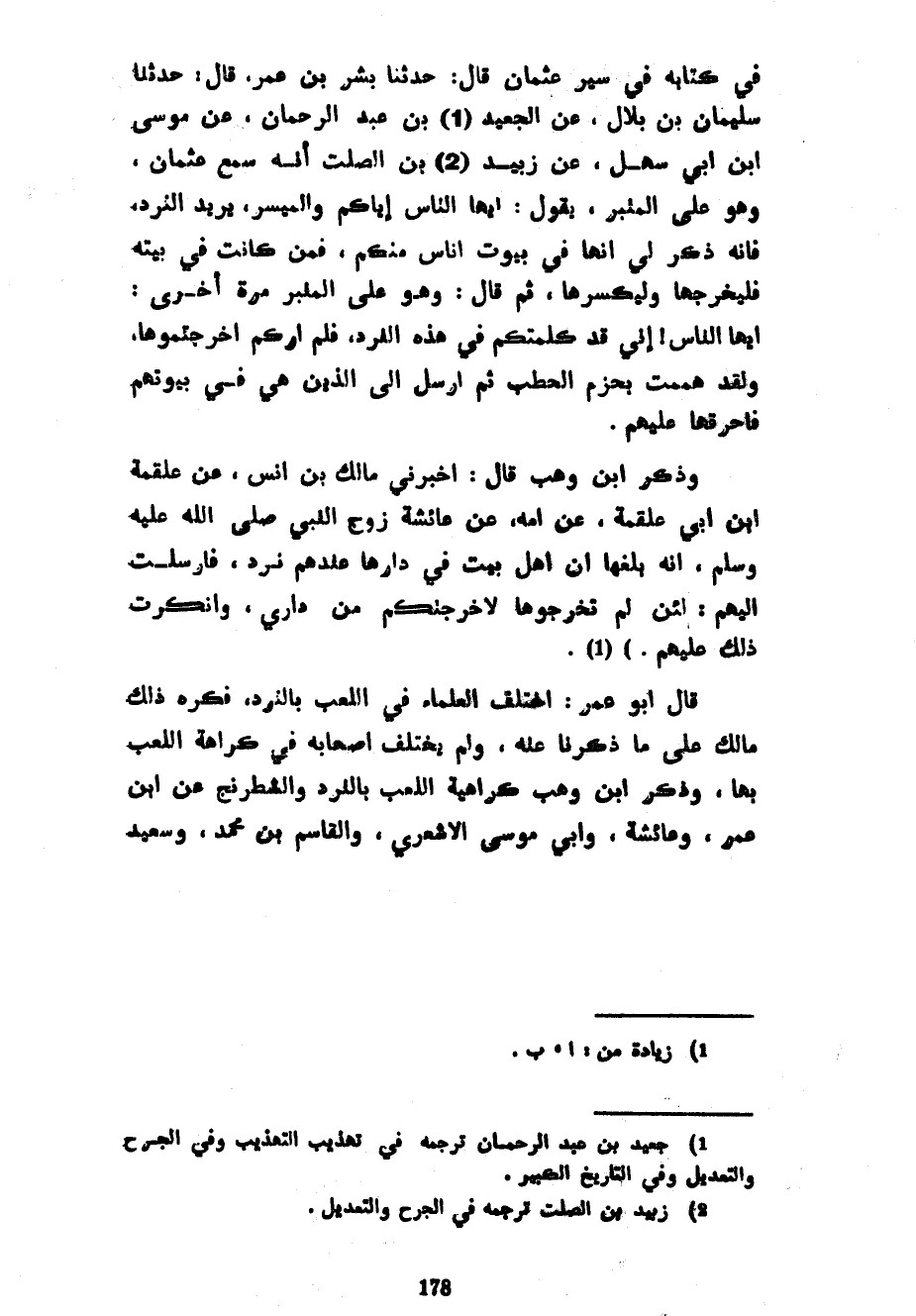 فِي كِتَابِهِ فِي سِيَرِ عُثْمَانَ قَالَ حَدَّثَنَا بِشْرُ بْنُ عُمَرَ قَالَ حَدَّثَنَا سُلَيْمَانُ بْنُ بلال عن الجعيد بن عبد الرحمان عَنْ مُوسَى بْنِ أَبِي سَهْلٍ عَنْ زُبَيْدِ بْنِ الصَّلْتِ أَنَّهُ سَمِعَ عُثْمَانَ وَهُوَ عَلَى الْمِنْبَرِ يَقُولُ أَيُّهَا النَّاسُ إِيَّاكُمْ وَالْمَيْسِرَ يُرِيدُ النَّرْدَ فَإِنَّهُ ذُكِرَ لِي أَنَّهَا فِي بُيُوتِ أُنَاسٍ مِنْكُمْ فَمَنْ كَانَتْ فِي بَيْتِهِ فَلْيُخْرِجْهَا وَلْيَكْسِرْهَا ثُمَّ قَالَ وَهُوَ عَلَى الْمِنْبَرِ مَرَّةً أُخْرَى أَيُّهَا النَّاسُ إِنِّي قَدْ كَلَّمْتُكُمْ فِي هَذِهِ النَّرْدِ فَلَمْ أَرَكَمَ أَخْرَجْتُمُوهَا وَلَقَدْ هَمَمْتُ بِحُزَمِ الْحَطَبِ ثُمَّ أُرْسِلُ إِلَى الَّذِينَ هِيَ فِي بُيُوتِهِمْ فَأُحْرِقُهَا عَلَيْهِمْ وَذَكَرَ ابْنُ وَهْبٍ قَالَ أَخْبَرَنِي مَالِكُ بْنُ أَنَسٍ عَنْ عَلْقَمَةَ بْنِ أَبِي عَلْقَمَةَ عَنْ أُمِّهِ عَنْ عَائِشَةَ زَوْجَ النَّبِيِّ صَلَّى اللَّهُ عَلَيْهِ وَسَلَّمَ أَنَّهُ بَلَغَهَا أَنَّ أَهْلَ بَيْتٍ فِي دَارِهَا عِنْدَهُمْ نَرْدٌ فَأَرْسَلَتْ إِلَيْهِمْ لَئِنْ لَمْ تُخْرِجُوهَا لَأُخْرِجَنَّكُمْ مِنْ دَارِي وَأَنْكَرَتْ ذَلِكَ عَلَيْهِمْ) قَالَ أَبُو عُمَرَ اخْتَلَفَ الْعُلَمَاءُ فِي اللَّعِبِ بِالنَّرْدِ فَكَرِهَ ذَلِكَ مَالِكٌ عَلَى مَا ذَكَرْنَا عَنْهُ وَلَمْ يَخْتَلِفْ أَصْحَابُهُ فِي كَرَاهَةِ اللَّعِبِ بِهَا وَذَكَرَ ابْنُ وَهْبٍ كَرَاهِيَةَ اللَّعِبِ بِالنَّرْدِ وَالشَّطْرَنْجِ عَنِ ابْنِ عُمَرَ وَعَائِشَةَ وَأَبِي مُوسَى الْأَشْعَرِيِّ وَالْقَاسِمِ بن محمد وسعيد