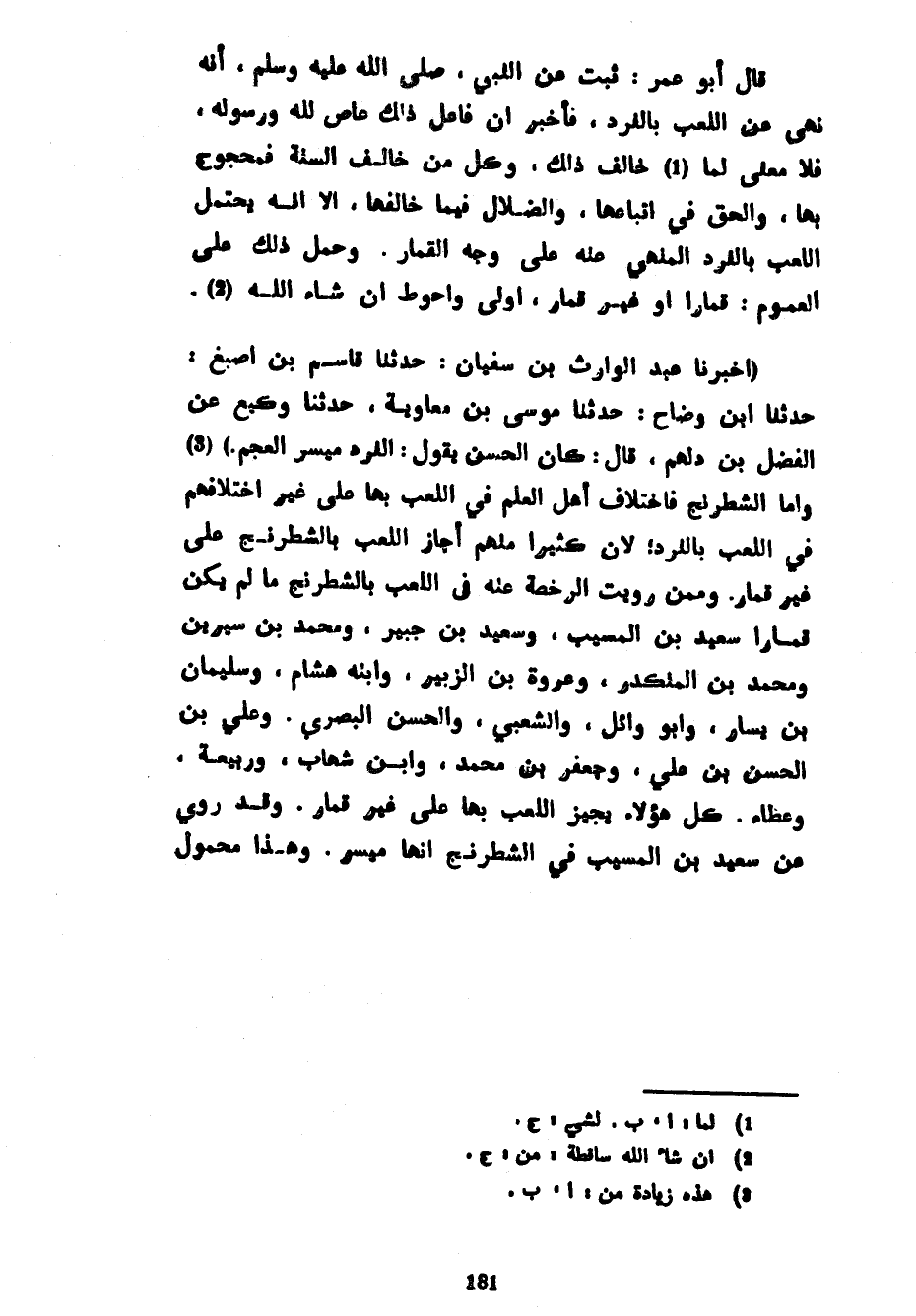 قَالَ أَبُو عُمَرَ ثَبَتَ عَنِ النَّبِيِّ صَلَّى اللَّهُ عَلَيْهِ وَسَلَّمَ أَنَّهُ نَهَى عَنِ اللَّعِبِ بِالنَّرْدِ فَأَخْبَرَ أَنَّ فَاعِلَ ذَلِكَ عَاصٍ لِلَّهِ وَرَسُولِهِ فَلَا مَعْنَى لِمَا خَالَفَ ذَلِكَ وَكُلُّ مَنْ خَالَفَ السُّنَّةَ فَمَحْجُوجٌ بِهَا وَالْحَقُّ فِي اتِّبَاعِهَا وَالضَّلَالُ فِيمَا خَالَفَهَا إِلَّا أَنَّهُ يُحْتَمَلُ اللَّعِبُ بِالنَّرْدِ الْمَنْهِيِّ عَنْهُ عَلَى وَجْهِ الْقِمَارِ وَحَمْلُ ذَلِكَ عَلَى الْعُمُومِ قِمَارًا أَوْ غَيْرَ قِمَارٍ أَوْلَى وَأَحْوَطُ إِنْ شَاءَ اللَّهُ (أَخْبَرَنَا عَبْدُ الْوَارِثِ بْنُ سُفْيَانَ حَدَّثَنَا قَاسِمُ بْنُ أَصْبَغَ حَدَّثَنَا ابْنُ وَضَّاحٍ حَدَّثَنَا مُوسَى بْنُ مُعَاوِيَةَ حَدَّثَنَا وَكِيعٌ عَنِ الْفَضْلِ بْنِ دَلْهَمٍ قَالَ كَانَ الْحَسَنُ يَقُولُ النَّرْدُ مَيْسِرُ الْعَجَمِ) وَأَمَّا الشَّطْرَنْجُ فَاخْتِلَافُ أَهْلِ الْعِلْمِ فِي اللَّعِبِ بِهَا عَلَى غَيْرِ اخْتِلَافِهِمْ فِي اللَّعِبِ بِالنَّرْدِ لأن كثيرا منهم أجاز اللَّعِبِ بِالشَّطْرَنْجِ مَا لَمْ يَكُنْ قِمَارًا سَعِيدُ بْنُ الْمُسَيَّبِ وَسَعِيدُ بْنُ جُبَيْرٍ وَمُحَمَّدُ بْنُ سِيرِينَ وَمُحَمَّدُ بْنُ الْمُنْكَدِرِ وَعُرْوَةُ بْنُ الزُّبَيْرِ وَابْنُهُ هِشَامٌ وَسُلَيْمَانُ بْنُ يَسَارٍ وَأَبُو وَائِلٍ وَالشَّعْبِيُّ وَالْحَسَنُ الْبَصْرِيُّ وَعَلِيُّ بْنُ الْحَسَنِ بْنِ عَلِيٍّ وَجَعْفَرُ بْنُ مُحَمَّدٍ وَابْنُ شِهَابٍ وَرَبِيعَةُ وَعَطَاءٌ كُلُّ هَؤُلَاءِ يُجِيزُ اللَّعِبَ بِهَا عَلَى غَيْرِ قِمَارٍ وَقَدْ رُوِيَ عَنْ سَعِيدِ بْنِ الْمُسَيَّبِ فِي الشَّطْرَنْجِ أَنَّهَا مَيْسِرٌ وَهَذَا مَحْمُولٌ