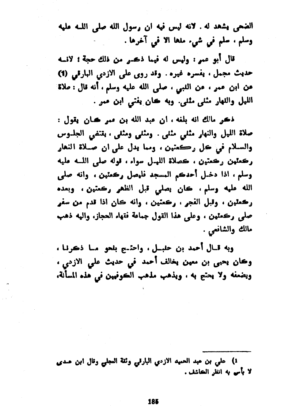 الضُّحَى يَشْهَدُ لَهُ لِأَنَّهُ لَيْسَ فِيهِ أَنَّ رَسُولَ اللَّهِ صَلَّى اللَّهُ عَلَيْهِ وَسَلَّمَ سَلَّمَ فِي شَيْءٍ مِنْهَا إِلَّا فِي آخِرِهَا قَالَ أَبُو عُمَرَ وَلَيْسَ لَهُ فِيمَا ذَكَرَ مِنْ ذَلِكَ حُجَّةٌ لِأَنَّهُ حَدِيثٌ مُجْمَلٌ يُفَسِّرُهُ غَيْرُهُ وَقَدْ رَوَى عَلِيٌّ الْأَزْدِيُّ الْبَارِقِيُّ عَنِ ابْنِ عُمَرَ عَنِ النَّبِيِّ صَلَّى اللَّهُ عَلَيْهِ وَسَلَّمَ أَنَّهُ قَالَ صَلَاةُ اللَّيْلِ وَالنَّهَارِ مَثْنَى مَثْنَى وَبِهِ كَانَ يُفْتِي ابْنُ عُمَرَ ذَكَرَ مَالِكٌ أَنَّهُ بَلَغَهُ أَنَّ عَبْدَ اللَّهِ بْنَ عُمَرَ كَانَ يَقُولُ صَلَاةُ اللَّيْلِ وَالنَّهَارِ مَثْنَى مَثْنَى وَمَثْنَى وَمَثْنَى يَقْتَضِي الْجُلُوسَ وَالسَّلَامَ فِي كُلِّ رَكْعَتَيْنِ وَمِمَّا يَدُلُّ عَلَى أَنَّ صَلَاةَ النَّهَارِ رَكْعَتَيْنِ رَكْعَتَيْنِ كَصَلَاةِ اللَّيْلِ سَوَاءٌ قَوْلُهُ صَلَّى اللَّهُ عَلَيْهِ وَسَلَّمَ إِذَا دَخَلَ أَحَدُكُمُ الْمَسْجِدَ فَلْيُصَلِّ رَكْعَتَيْنِ وَأَنَّهُ صَلَّى اللَّهُ عَلَيْهِ وَسَلَّمَ كَانَ يُصَلِّي قَبْلَ الظُّهْرِ رَكْعَتَيْنِ وَبَعْدَهُ رَكْعَتَيْنِ وَقَبْلَ الْفَجْرِ رَكْعَتَيْنِ وَأَنَّهُ كَانَ إِذَا قَدِمَ مِنْ سَفَرٍ صَلَّى رَكْعَتَيْنِ وَعَلَى هَذَا الْقَوْلِ جَمَاعَةُ فُقَهَاءِ الْحِجَازِ وَإِلَيْهِ ذَهَبَ مَالِكٌ وَالشَّافِعِيُّ وَبِهِ قَالَ أَحْمَدُ بْنُ حَنْبَلٍ وَاحْتَجَّ بِنَحْوِ مَا ذَكَرْنَا وَكَانَ يَحْيَى بْنُ مَعِينٍ يُخَالِفُ أَحْمَدَ فِي حَدِيثِ عَلِيٍّ الْأَزْدِيِّ وَيُضَعِّفُهُ وَلَا يَحْتَجُّ بِهِ وَيَذْهَبُ مَذْهَبَ الْكُوفِيِّينَ فِي هَذِهِ المسألة