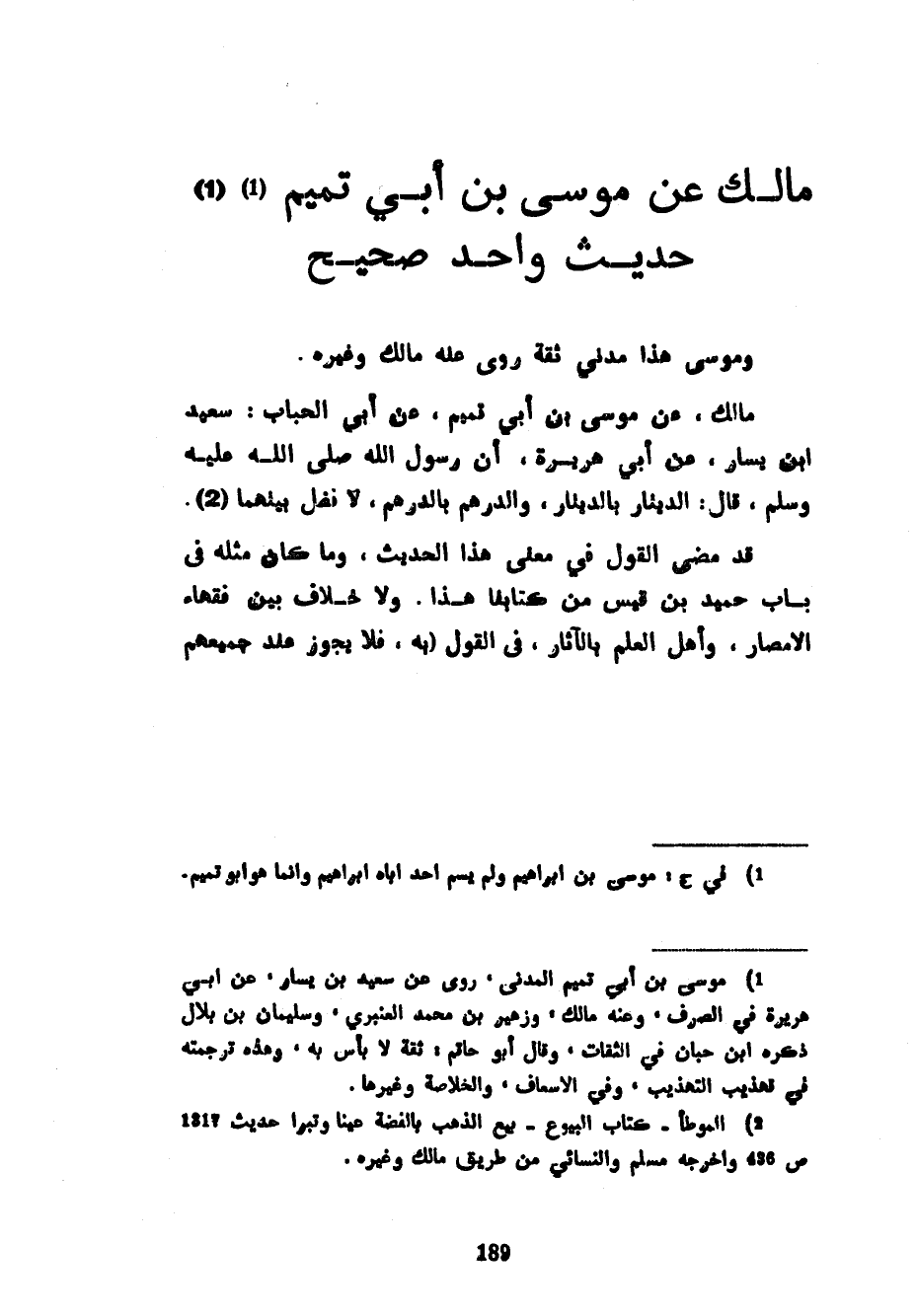 حَدِيثٌ وَاحِدٌ صَحِيحٌ وَمُوسَى هَذَا مَدَنِيٌّ ثِقَةٌ رَوَى عَنْهُ مَالِكٌ وَغَيْرُهُ مَالِكٌ عَنْ أَبِي مُوسَى بْنِ أَبِي تَمِيمٍ عَنْ أَبِي الْحُبَابِ سَعِيدِ بْنِ يَسَارٍ عَنْ أَبِي هُرَيْرَةَ أَنَّ رَسُولَ اللَّهِ صَلَّى اللَّهُ عَلَيْهِ وَسَلَّمَ قَالَ الدِّينَارُ بِالدِّينَارِ وَالدِّرْهَمُ بِالدِّرْهَمِ لَا فَضْلَ بَيْنِهِمَا قَدْ مَضَى الْقَوْلُ فِي مَعْنَى هَذَا الْحَدِيثِ وَمَا كَانَ مِثْلَهُ فِي بَابِ حُمَيْدِ بْنِ قَيْسٍ مِنْ كِتَابِنَا هَذَا وَلَا خِلَافَ بَيْنَ فُقَهَاءِ الْأَمْصَارِ وَأَهْلِ الْعِلْمِ بِالْآثَارِ فِي الْقَوْلِ (بِهِ فَلَا يَجُوزُ عِنْدَ جَمِيعِهِمْ
