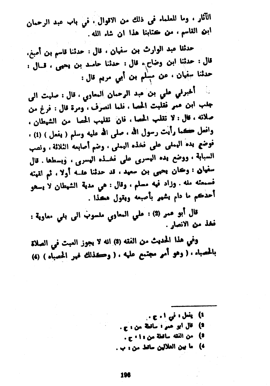 الْآثَارَ وَمَا لِلْعُلَمَاءِ فِي ذَلِكَ مِنَ الْأَقْوَالِ فِي باب عبد الرحمان ابن الْقَاسِمِ مِنْ كِتَابِنَا هَذَا إِنْ شَاءَ اللَّهُ حَدَّثَنَا عَبْدُ الْوَارِثِ بْنُ سُفْيَانَ قَالَ حَدَّثَنَا قَاسِمُ بْنُ أَصْبَغَ قَالَ حَدَّثَنَا ابْنُ وَضَّاحٍ قَالَ حَدَّثَنَا حَامِدُ بْنُ يَحْيَى قَالَ حَدَّثَنَا سُفْيَانُ عَنْ مُسْلِمِ بْنِ أَبِي مَرْيَمَ قَالَ أخبرني علي بن عبد الرحمان الْمُعَاوِيُّ قَالَ صَلَّيْتُ إِلَى جَنْبِ ابْنِ عُمَرَ فقلبت الحصا فَلَمَّا انْصَرَفَ وَمَرَّةً قَالَ فَرَغَ مِنْ صَلَاتِهِ قال لا تقلب الحصا فَإِنَّ تَقْلِيبَ الْحَصَا مِنَ الشَّيْطَانِ وَافْعَلْ كَمَا رَأَيْتُ رَسُولَ اللَّهِ صَلَّى اللَّهُ عَلَيْهِ وَسَلَّمَ (يَفْعَلُ) فَوَضَعَ يَدَهُ الْيُمْنَى عَلَى فَخِذِهِ الْيُمْنَى وَضَمَّ أَصَابِعَهُ الثَّلَاثَةَ وَنَصَبَ السَّبَّابَةَ وَوَضَعَ يَدَهُ الْيُسْرَى عَلَى فَخِذِهِ الْيُسْرَى وَبَسَطَهَا قَالَ سُفْيَانُ وَكَانَ يَحْيَى بْنُ سَعِيدٍ قَدْ حَدَّثَنَا عَنْهُ أَوَّلًا ثُمَّ لَقِيتُهُ فَسَمِعْتُهُ مِنْهُ وَزَادَ فِيهِ مُسْلِمٌ وَقَالَ هِيَ مُدْيَةُ الشَّيْطَانِ لَا يَسْهُو أَحَدُكُمْ مَا دَامَ يُشِيرُ بِإِصْبَعِهِ وَيَقُولُ هَكَذَا قَالَ أَبُو عُمَرَ عَلِيٌّ الْمُعَاوِيُّ مَنْسُوبٌ إِلَى بَنِي مُعَاوِيَةَ فَخِذٍ مِنَ الْأَنْصَارِ وَفِي هَذَا الْحَدِيثِ مِنَ الْفِقْهِ أَنَّهُ لَا يَجُوزُ الْعَبَثُ فِي الصَّلَاةِ بِالْحَصْبَاءِ (وَهُوَ أَمْرٌ مُجْتَمَعٌ عَلَيْهِ (وَكَذَلِكَ غَيْرُ الْحَصْبَاءِ)