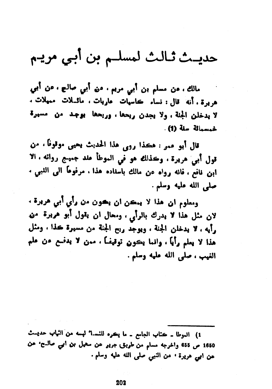 حَدِيثٌ ثَالِثٌ لِمُسْلِمِ بْنِ أَبِي مَرْيَمَ مَالِكٌ عَنْ مُسْلِمِ بْنِ أَبِي مَرْيَمَ عَنْ أَبِي صَالِحٍ عَنْ أَبِي هُرَيْرَةَ أَنَّهُ قَالَ نِسَاءٌ كَاسِيَاتٌ عَارِيَاتٌ مَائِلَاتٌ مُمِيلَاتٌ لَا يَدْخُلْنَ الْجَنَّةَ وَلَا يَجِدْنَ رِيحَهَا وَرِيحُهَا يُوجَدُ مِنْ مَسِيرَةِ خَمْسِمِائَةِ سَنَةٍ قَالَ أَبُو عُمَرَ هَكَذَا رَوَى هَذَا الْحَدِيثَ يَحْيَى مَوْقُوفًا مِنْ قَوْلِ أَبِي هُرَيْرَةَ وَكَذَلِكَ هُوَ فِي الْمُوَطَّأِ عِنْدَ جَمِيعِ رُوَاتِهِ إِلَّا ابْنَ نَافِعٍ فَإِنَّهُ رَوَاهُ عَنْ مَالِكٍ بِإِسْنَادِهِ هَذَا مَرْفُوعًا إِلَى النَّبِيِّ صَلَّى اللَّهُ عَلَيْهِ وَسَلَّمَ وَمَعْلُومٌ أَنَّ هَذَا لَا يُمْكِنُ أَنْ يَكُونَ مِنْ رَأْيِ أَبِي هُرَيْرَةَ لِأَنَّ مِثْلَ هَذَا لَا يُدْرَكُ بِالرَّأْيِ وَمُحَالٌ أَنْ يَقُولَ أَبُو هُرَيْرَةَ مِنْ رَأْيِهِ لَا يَدْخُلْنَ الْجَنَّةَ وَيُوجَدُ رِيحُ الْجَنَّةِ مِنْ مَسِيرَةِ كَذَا وَمِثْلُ هَذَا لَا يُعْلَمُ رَأْيًا وَإِنَّمَا يَكُونُ تَوْقِيفًا مِمَّنْ لَا يُدْفَعُ عَنْ عِلْمِ الْغَيْبِ صَلَّى اللَّهُ عَلَيْهِ وَسَلَّمَ