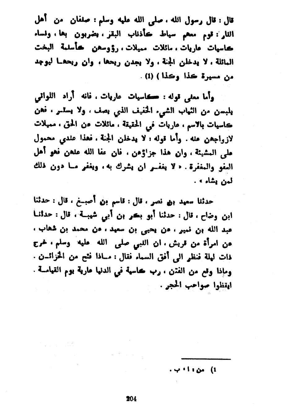 قَالَ قَالَ رَسُولُ اللَّهِ صَلَّى اللَّهُ عَلَيْهِ وَسَلَّمَ صِنْفَانِ مِنْ أَهْلِ النَّارِ قَوْمٌ مَعَهُمْ سِيَاطٌ كَأَذْنَابِ الْبَقَرِ يَضْرِبُونَ بِهَا وَنِسَاءٌ كَاسِيَاتٌ عاريات مائلات مميلات رؤوسهن كأسلمة الْبُخْتِ الْمَائِلَةِ لَا يَدْخُلْنَ الْجَنَّةَ وَلَا يَجِدْنَ رِيحَهَا وَإِنَّ رِيحَهَا لَيُوجَدُ مِنْ مَسِيرَةِ كَذَا وَكَذَا) وَأَمَّا مَعْنَى قَوْلِهِ كَاسِيَاتٌ عَارِيَاتٌ فَإِنَّهُ أَرَادَ اللَّوَاتِي يَلْبَسْنَ مِنَ الثِّيَابِ الشَّيْءَ الْخَفِيفَ الَّذِي يَصِفُ وَلَا يَسْتُرُ فَهُنَّ كَاسِيَاتٌ بِالِاسْمِ عَارِيَاتٌ فِي الْحَقِيقَةِ مَائِلَاتٌ عَنِ الْحَقِّ مُمِيلَاتٌ لِأَزْوَاجِهِنَّ عَنْهُ وَأَمَّا قَوْلُهُ لَا يَدْخُلْنَ الْجَنَّةَ فَهَذَا عِنْدِي مَحْمُولٌ عَلَى الْمَشِيئَةِ وَأَنَّ هَذَا جَزَاؤُهُنَّ فَإِنْ عَفَا اللَّهُ عَنْهُنَّ فَهُوَ أَهْلُ الْعَفْوِ وَالْمَغْفِرَةِ لَا يَغْفِرُ أَنْ يُشْرَكَ بِهِ وَيَغْفِرَ مَا دُونُ ذَلِكَ لِمَنْ يَشَاءُ حَدَّثَنَا سَعِيدُ بْنُ نَصْرٍ قَالَ قَاسِمُ بْنُ أَصْبَغَ قَالَ حَدَّثَنَا ابْنُ وَضَّاحٍ قَالَ حَدَّثَنَا أَبُو بَكْرِ بْنُ أَبِي شَيْبَةَ قَالَ حَدَّثَنَا عَبْدُ اللَّهِ بْنُ نُمَيْرٍ عَنْ يَحْيَى بْنِ سَعِيدٍ عَنْ مُحَمَّدِ بْنِ شِهَابٍ عَنِ امْرَأَةٍ مِنْ قُرَيْشٍ أَنَّ النَّبِيَّ صَلَّى اللَّهُ عَلَيْهِ وَسَلَّمَ خَرَجَ ذَاتَ لَيْلَةٍ فَنَظَرَ إِلَى أُفُقِ السَّمَاءِ فَقَالَ مَاذَا فُتِحَ مِنَ الْخَزَائِنِ وَمَاذَا وَقَعَ مِنَ الْفِتَنِ رُبَّ كَاسِيَةٍ فِي الدُّنْيَا عَارِيَةٌ يَوْمَ الْقِيَامَةِ أَيْقِظُوا صَوَاحِبَ الْحُجَرِ