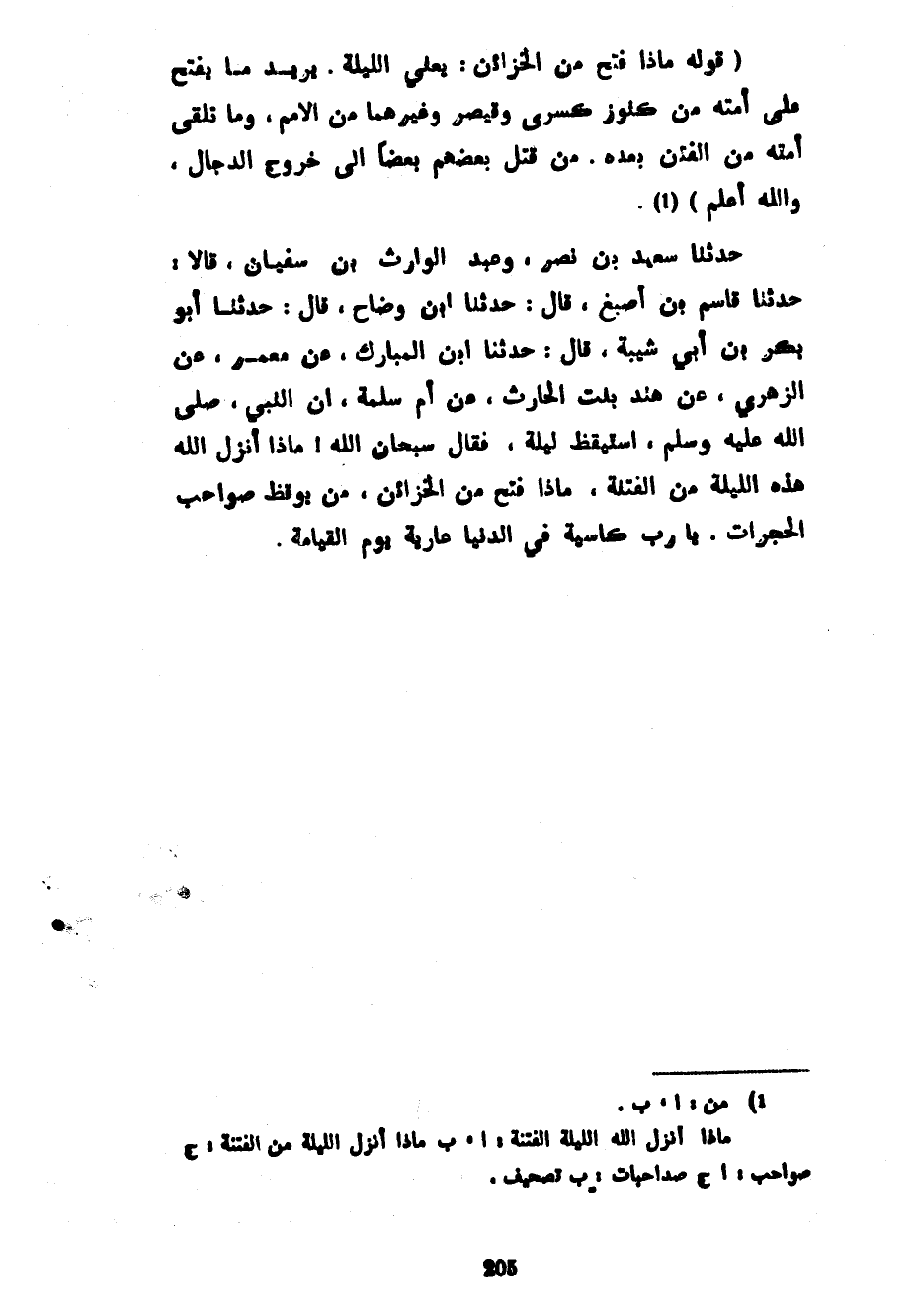 (قَوْلُهُ مَاذَا فُتِحَ مِنَ الْخَزَائِنِ يَعْنِي اللَّيْلَةَ يُرِيدُ مَا يُفْتَحُ عَلَى أُمَّتِهِ مِنْ كُنُوزِ كِسْرَى وَقَيْصَرَ وَغَيْرِهِمَا مِنَ الْأُمَمِ وَمَا تَلْقَى أُمَّتُهُ مِنَ الْفِتَنِ بَعْدَهُ مِنْ قَتْلِ بَعْضِهِمْ بَعْضًا إِلَى خُرُوجِ الدَّجَّالِ وَاللَّهُ أَعْلَمُ) حَدَّثَنَا سَعِيدُ بْنُ نَصْرٍ وَعَبْدُ الْوَارِثِ بْنُ سُفْيَانَ قَالَا حَدَّثَنَا قَاسِمُ بْنُ أَصْبَغَ قَالَ حَدَّثَنَا ابْنُ وَضَّاحٍ قَالَ حَدَّثَنَا أَبُو بَكْرِ بْنُ أَبِي شَيْبَةَ قَالَ حَدَّثَنَا ابْنُ الْمُبَارَكِ عَنْ مَعْمَرٍ عَنِ الزُّهْرِيِّ عَنْ هِنْدَ بِنْتِ الْحَارِثِ عَنْ أُمِّ سَلَمَةَ أَنَّ النَّبِيَّ صَلَّى اللَّهُ عَلَيْهِ وَسَلَّمَ اسْتَيْقَظَ لَيْلَةً فَقَالَ سُبْحَانَ اللَّهِ مَاذَا أَنْزَلَ اللَّهُ هَذِهِ اللَّيْلَةَ مِنَ الْفِتْنَةِ مَاذَا فُتِحَ مِنَ الْخَزَائِنِ مَنْ يُوقِظْ صَوَاحِبَ الْحُجُرَاتِ يَا رُبَّ كَاسِيَةٍ فِي الدُّنْيَا عَارِيَةٍ يَوْمَ الْقِيَامَةِ