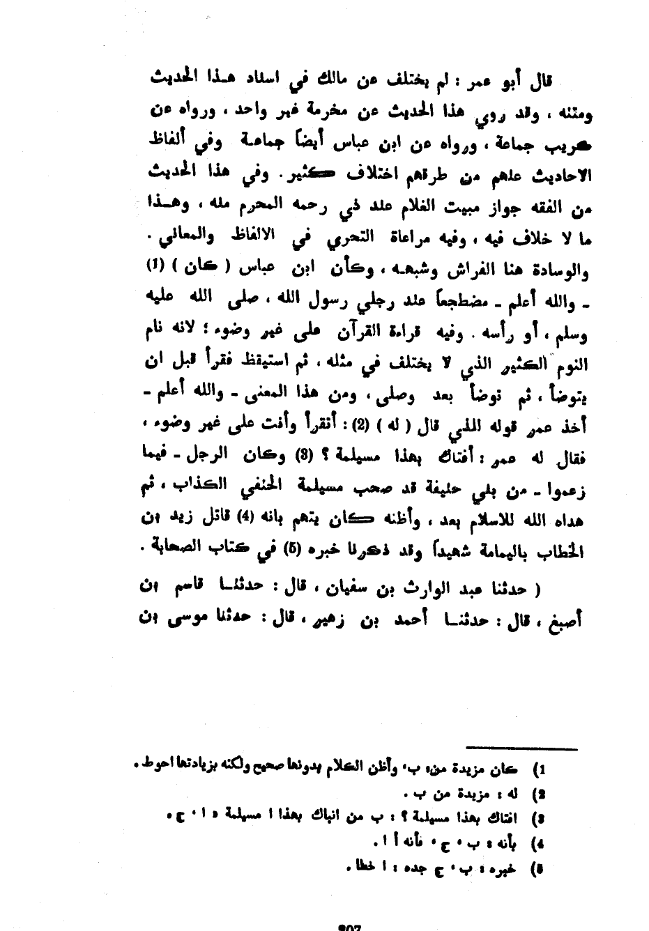 قَالَ أَبُو عُمَرَ لَمْ يُخْتَلَفْ عَنْ مَالِكٍ فِي إِسْنَادِ هَذَا الْحَدِيثِ وَمَتْنِهِ وَقَدْ رَوَى هَذَا الْحَدِيثَ عَنْ مَخْرَمَةَ غَيْرُ وَاحِدٍ وَرَوَاهُ عَنْ كُرَيْبٍ جَمَاعَةٌ وَرَوَاهُ عَنِ ابْنِ عَبَّاسٍ أَيْضًا جَمَاعَةٌ وَفِي أَلْفَاظِ الْأَحَادِيثِ عَنْهُمْ مِنْ طُرُقِهِمِ اخْتِلَافٌ كَثِيرٌ وَفِي هَذَا الْحَدِيثِ مِنَ الْفِقْهِ جَوَازُ مَبِيتِ الْغُلَامِ عِنْدَ ذِي رَحِمِهِ الْمَحْرَمِ مِنْهُ وَهَذَا مَا لَا خِلَافَ فِيهِ وَفِيهِ مُرَاعَاةُ التَّحَرِّي فِي الْأَلْفَاظِ وَالْمَعَانِي وَالْوِسَادَةُ هُنَا الْفِرَاشُ وَشَبَهُهُ وَكَأَنَّ ابْنَ عَبَّاسٍ (كَانَ) وَاللَّهُ أَعْلَمُ مُضْطَجِعًا عِنْدَ رِجْلَيْ رَسُولِ اللَّهِ صَلَّى اللَّهُ عَلَيْهِ وَسَلَّمَ أَوْ رَأَسِهِ وَفِيهِ قِرَاءَةُ الْقُرْآنِ عَلَى غَيْرِ وُضُوءٍ لِأَنَّهُ نَامَ النَّوْمَ الْكَثِيرَ الَّذِي لَا يُخْتَلَفُ فِي مِثْلِهِ ثُمَّ اسْتَيْقَظَ فَقَرَأَ قَبْلَ أَنْ يَتَوَضَّأَ ثُمَّ تَوَضَّأَ بَعْدُ وَصَلَّى وَمِنْ هَذَا الْمَعْنَى وَاللَّهُ أَعْلَمُ أَخَذَ عُمَرُ قَوْلَهُ الَّذِي قَالَ (لَهُ) أَتَقْرَأُ وَأَنْتَ عَلَى غَيْرِ وُضُوءٍ فَقَالَ لَهُ عُمَرُ أَفْتَاكَ بِهَذَا مُسَيْلِمَةُ وَكَانَ الرَّجُلُ فِيمَا زَعَمُوا مِنْ بَنِي حَنِيفَةَ قَدْ صَحِبَ مُسَيْلِمَةَ الْحَنَفِيَّ الْكَذَّابَ ثُمَّ هَدَاهُ اللَّهُ لِلْإِسْلَامِ بَعْدُ وَأَظُنُّهُ كَانَ يُتَّهَمُ بِأَنَّهُ قَاتِلُ زَيْدِ بْنِ الْخَطَّابِ بِالْيَمَامَةِ شَهِيدًا وَقَدْ ذَكَرْنَا خَبَرَهُ فِي كِتَابِ الصَّحَابَةِ (حَدَّثَنَا عَبْدُ الْوَارِثِ بْنُ سُفْيَانَ قَالَ حَدَّثَنَا قَاسِمُ بْنُ أَصْبَغَ قَالَ حَدَّثَنَا أَحْمَدُ بْنُ زُهَيْرٍ قَالَ حَدَّثَنَا مُوسَى بْنُ