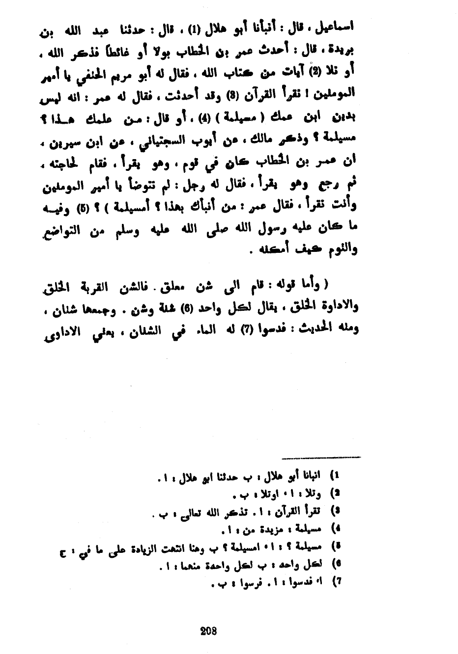 إِسْمَاعِيلَ قَالَ أَنْبَأَنَا أَبُو هِلَالٍ قَالَ حَدَّثَنَا عَبْدُ اللَّهِ بْنُ بُرَيْدَةَ قَالَ أَحْدَثَ عُمَرُ بْنُ الْخَطَّابِ بَوْلًا أَوْ غَائِطًا فَذَكَرَ اللَّهَ أَوْ تَلَا آيَاتٍ مِنْ كِتَابِ اللَّهِ فَقَالَ لَهُ أَبُو مَرْيَمَ الْحَنَفِيُّ يَا أَمِيرَ الْمُؤْمِنِينَ تَقْرَأُ الْقُرْآنَ وَقَدْ أَحْدَثْتَ فَقَالَ لَهُ عُمَرُ إِنَّهُ لَيْسَ بِدِينِ ابْنِ عَمِّكَ (مُسَيْلِمَةَ) أَوْ قَالَ مَنْ عَلَّمَكَ هَذَا مُسَيْلِمَةُ وَذَكَرَ مَالِكٌ عَنْ أَيُّوبَ السَّخْتِيَانِيِّ عَنِ ابْنِ سِيرِينَ أَنَّ عُمَرَ بْنَ الْخَطَّابِ كَانَ فِي قَوْمٍ وَهُوَ يَقْرَأُ فَقَامَ لِحَاجَتِهِ ثُمَّ رَجَعَ وَهُوَ يَقْرَأُ فَقَالَ لَهُ رَجُلٌ لَمْ تَتَوَضَّأْ يَا أَمِيرَ الْمُؤْمِنِينَ وَأَنْتَ تَقْرَأُ فَقَالَ عُمَرُ مَنْ أَنْبَأَكَ بِهَذَا أَمُسَيْلِمَةُ) وَفِيهِ مَا كَانَ عَلَيْهِ رَسُولُ اللَّهِ صَلَّى اللَّهُ عَلَيْهِ وَسَلَّمَ مِنَ التَّوَاضُعِ وَالنَّوْمِ كَيْفَ أَمْكَنَهُ (وَأَمَّا قَوْلُهُ قَامَ إِلَى شَنٍّ مُعَلَّقٍ فَالشَّنُّ الْقِرْبَةُ الْخَلَقُ وَالْإِدَاوَةُ الْخَلَقُ يُقَالُ لِكُلٍّ وَاحِدٍ (6) شَنَّةٌ وَشَنٌّ وَجَمْعُهَا شِنَانٌ وَمِنْهُ الْحَدِيثُ فَدَسُّوا لَهُ الْمَاءُ فِي الشِّنَانِ يعني الأداوى