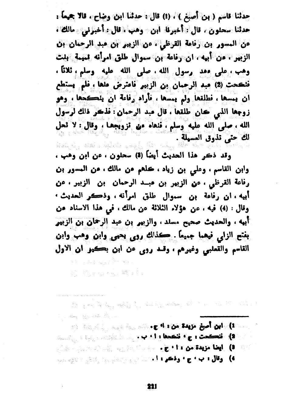 حَدَّثَنَا قَاسِمُ (بْنُ أَصْبَغَ) قَالَ حَدَّثَنَا ابْنُ وَضَّاحٍ قَالَا جَمِيعًا حَدَّثَنَا سَحْنُونٌ قَالَ أَخْبَرَنَا ابْنُ وَهْبٍ قَالَ أَخْبَرَنِي مَالِكٌ عَنِ الْمِسْوَرِ بْنِ رِفَاعَةَ الْقُرَظِيِّ عَنِ الزَّبِيرِ بْنِ عَبْدِ الرحمان بن الزبير عن أبيه أن رفاعة بن سموال طَلَّقَ امْرَأَتَهُ تَمِيمَةَ بِنْتَ وَهْبٍ عَلَى عَهْدِ رَسُولِ اللَّهِ صَلَّى اللَّهُ عَلَيْهِ وَسَلَّمَ ثَلَاثًا فنكحت عبد الرحمان بْنَ الزَّبِيرِ فَاعْتَرَضَ عَنْهَا فَلَمْ يَسْتَطِعْ أَنْ يَمَسَّهَا فَطَلَّقَهَا وَلَمْ يَمَسَّهَا فَأَرَادَ رِفَاعَةُ أَنْ يَنْكِحَهَا وَهُوَ زَوْجُهَا الَّذِي كَانَ طَلَّقَهَا قَالَ عبد الرحمان فَذُكِرَ ذَلِكَ لِرَسُولِ اللَّهِ صَلَّى اللَّهُ عَلَيْهِ وَسَلَّمَ فَنَهَاهُ عَنْ تَزْوِيجِهَا وَقَالَ لَا تَحِلُّ لَكَ حَتَّى تَذُوقَ الْعُسَيْلَةَ وَقَدْ ذَكَرَ هَذَا الْحَدِيثَ أَيْضًا سَحْنُونٌ عَنِ ابْنِ وَهْبٍ وَابْنِ الْقَاسِمِ وَعَلِيِّ بْنِ زِيَادٍ كُلُّهُمْ عَنْ مَالِكٍ عَنِ الْمِسْوَرِ بْنِ رِفَاعَةَ الْقُرَظِيِّ عَنِ الزَّبِيرِ بن عبد الرحمان بن الزبير عن أبيه أن رفاعة بن سموال طَلَّقَ امْرَأَتَهُ وَذَكَرَ الْحَدِيثَ وَقَالَ فِيهِ عَنْ هَؤُلَاءِ الثَّلَاثَةِ عَنْ مَالِكٍ فِي هَذَا الْإِسْنَادِ عَنْ أَبِيهِ وَالْحَدِيثُ صَحِيحٌ مُسْنَدٌ وَالزَّبِيرُ بْنُ عبد الرحمان بْنِ الزَّبِيرِ بِفَتْحِ الزَّايِ فِيهِمَا جَمِيعًا كَذَلِكَ رَوَى يَحْيَى وَابْنُ وَهْبٍ وَابْنُ الْقَاسِمِ وَالْقَعْنَبِيُّ وَغَيْرُهُمْ وَقَدْ رُوِيَ عَنِ ابْنِ بُكَيْرٍ أَنَّ الأول