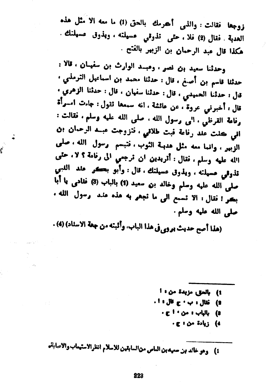 زَوْجَهَا فَقَالَتْ وَالَّذِي أَكْرَمَكَ بِالْحَقِّ مَا مَعَهُ إِلَّا مِثْلَ هَذِهِ الْهُدْبَةِ فَقَالَ فَلَا حَتَّى تَذُوقِي عُسَيْلَتَهُ وَيَذُوقَ عُسَيْلَتَكِ هَكَذَا قَالَ عَبْدُ الرحمان بْنُ الزَّبِيرِ بِالْفَتْحِ وَحَدَّثَنَا سَعِيدُ بْنُ نَصْرٍ وَعَبْدُ الْوَارِثِ بْنُ سُفْيَانَ قَالَا حَدَّثَنَا قَاسِمُ بْنُ أَصْبَغَ قَالَ حَدَّثَنَا مُحَمَّدُ بْنُ إِسْمَاعِيلَ التِّرْمِذِيُّ قَالَ حَدَّثَنَا الْحُمَيْديُّ قَالَ حَدَّثَنَا سُفْيَانُ قَالَ حَدَّثَنَا الزُّهْرِيُّ قَالَ أَخْبَرَنِي عُرْوَةُ عَنْ عَائِشَةَ أَنَّهُ سَمِعَهَا تَقُولُ جَاءَتِ امْرَأَةُ رِفَاعَةَ الْقُرَظِيِّ إِلَى رَسُولِ اللَّهِ صَلَّى اللَّهُ عَلَيْهِ وَسَلَّمَ فَقَالَتْ إِنِّي كُنْتُ عِنْدَ رِفَاعَةَ فَبَتَّ طلاقي فتزوجت عبد الرحمان بْنَ الزَّبِيرِ وَإِنَّمَا مَعَهُ مِثْلُ هُدْبَةِ الثَّوْبِ فَتَبَسَّمَ رَسُولُ اللَّهِ صَلَّى اللَّهُ عَلَيْهِ وَسَلَّمَ فَقَالَ أَتُرِيدِينَ أَنْ تَرْجِعِي إِلَى رِفَاعَةَ لَا حَتَّى تَذُوقِي عُسَيْلَتَهُ وَيَذُوقَ عُسَيْلَتَكِ قَالَ وَأَبُو بَكْرٍ عِنْدَ النَّبِيِّ صَلَّى اللَّهُ عَلَيْهِ وَسَلَّمَ وَخَالِدُ بْنُ سَعِيدٍ بِالْبَابِ فَنَادَى يَا أَبَا بَكْرٍ فَقَالَ أَلَا تَسْمَعْ إِلَى مَا تَجْهَرُ بِهِ هَذِهِ عِنْدَ رَسُولِ اللَّهِ صَلَّى اللَّهُ عَلَيْهِ وَسَلَّمَ (هَذَا أَصَحُّ حَدِيثٍ يُرْوَى فِي هَذَا الْبَابِ وَأَثْبَتُهُ مِنْ جِهَةِ الْإِسْنَادِ)