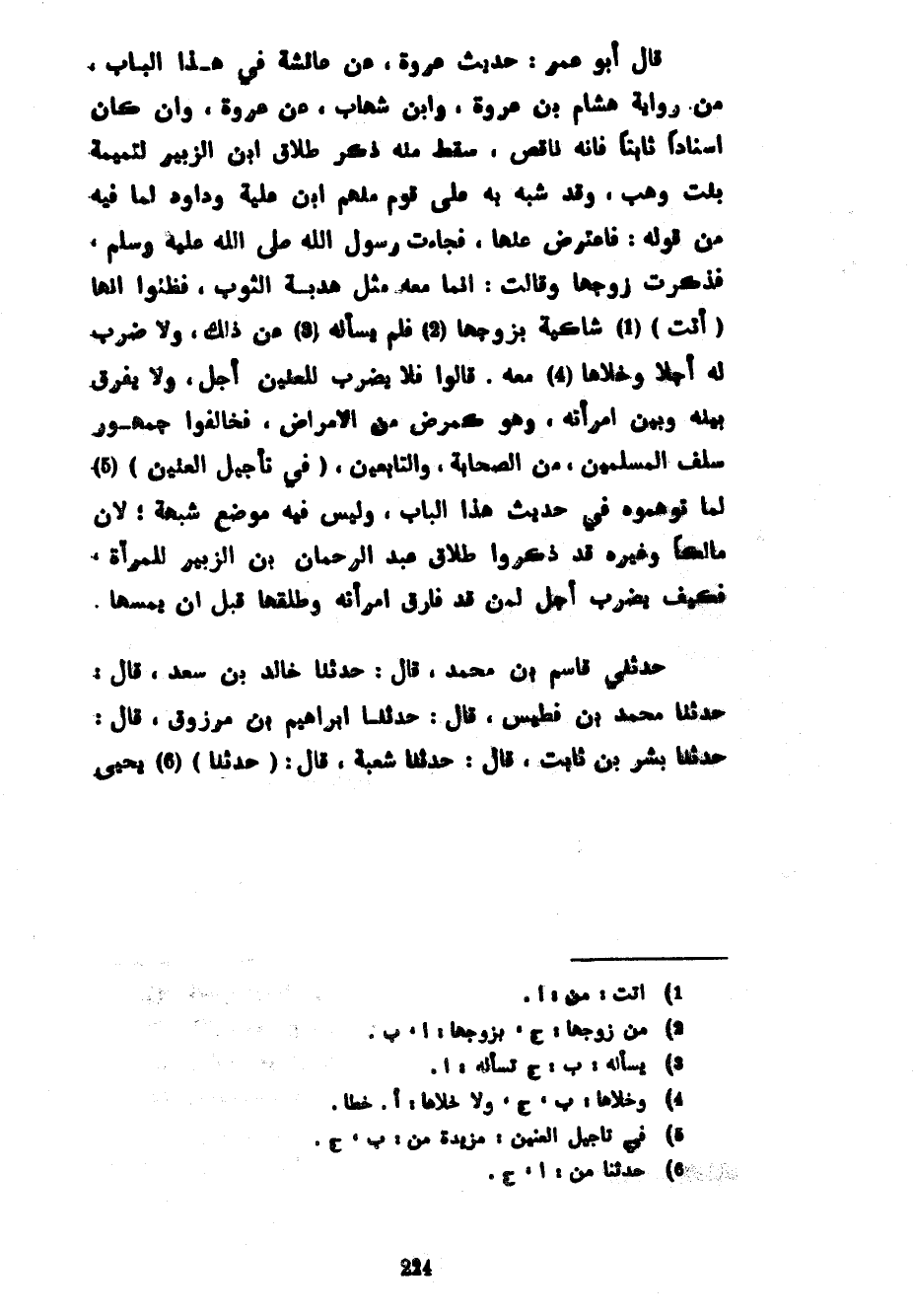 قَالَ أَبُو عُمَرَ حَدِيثُ عُرْوَةَ عَنْ عَائِشَةَ فِي هَذَا الْبَابِ مِنْ رِوَايَةِ هِشَامِ بْنِ عُرْوَةَ وَابْنِ شِهَابٍ عَنْ عُرْوَةَ وَإِنْ كَانَ إسنادا ثابتا فَإِنَّهُ نَاقِصٌ سَقَطَ مِنْهُ ذِكْرُ طَلَاقِ ابْنِ الزَّبِيرِ لِتَمِيمَةَ بِنْتِ وَهْبٍ وَقَدْ شُبِّهَ بِهِ عَلَى قَوْمٍ مِنْهُمُ ابْنُ عُلَيَّةَ وَدَاوُدُ لِمَا فِيهِ مِنْ قَوْلِهِ فَاعْتَرَضَ عَنْهَا فَجَاءَتْ رَسُولَ اللَّهِ صَلَّى اللَّهُ عَلَيْهِ وَسَلَّمَ فَذَكَرَتْ زَوْجَهَا وَقَالَتْ إِنَّمَا مَعَهُ مِثْلُ هُدْبَةِ الثَّوْبِ فَظَنُّوا أَنَّهَا (أَتَتْ) شَاكِيَةً بِزَوْجِهَا فَلَمْ يَسْأَلْهُ عَنْ ذَلِكَ وَلَا ضَرَبَ لَهُ أَجَلًا وَخَلَّاهَا مَعَهُ قَالُوا فَلَا يُضْرَبُ لِلْعِنِّينِ أَجَلٌ وَلَا يُفَرَّقُ بَيْنَهُ وَبَيْنَ امْرَأَتِهِ وَهُوَ كَمَرَضٍ مِنَ الْأَمْرَاضِ فَخَالَفُوا جُمْهُورَ سَلَفِ الْمُسْلِمِينَ مِنَ الصَّحَابَةِ وَالتَّابِعِينَ (فِي تَأْجِيلِ الْعِنِّينِ) لِمَا تَوَهَّمُوهُ فِي حَدِيثِ هَذَا الْبَابِ وَلَيْسَ فِيهِ مَوْضِعُ شُبْهَةٍ لِأَنَّ مالكا وغيره قد ذكروا طلاق عبد الرحمان بْنِ الزَّبِيِرِ لِلْمَرْأَةِ فَكَيْفَ يُضْرَبُ أَجَلٌ لِمَنْ قَدْ فَارَقَ امْرَأَتَهُ وَطَلَّقَهَا قَبْلَ أَنْ يَمَسَّهَا حَدَّثَنِي قَاسِمُ بْنُ مُحَمَّدٍ قَالَ حَدَّثَنَا خَالِدُ بْنُ سَعْدٍ قَالَ حَدَّثَنَا مُحَمَّدُ بْنُ فُطَيْسٍ قَالَ حَدَّثَنَا إِبْرَاهِيمُ بْنُ مَرْزُوقٍ قَالَ حَدَّثَنَا بِشْرُ بْنُ ثَابِتٍ قَالَ حَدَّثَنَا شُعْبَةُ قَالَ (حدثنا) يحيى