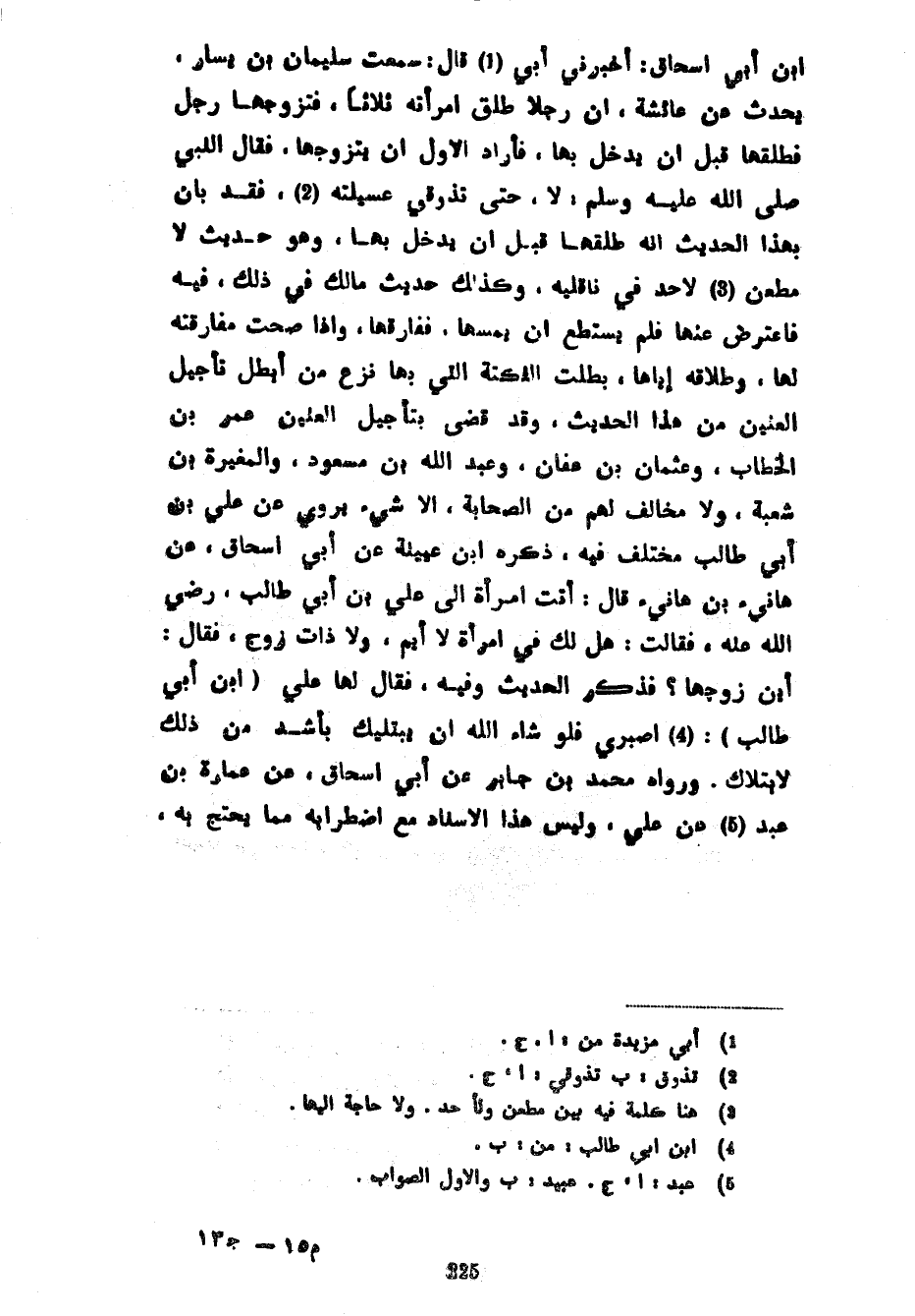 ابن أَبِي إِسْحَاقَ أَخْبَرَنِي أَبِي قَالَ سَمِعْتُ سُلَيْمَانَ بْنَ يَسَارٍ يُحَدِّثُ عَنِ عَائِشَةَ أَنَّ رَجُلًا طَلَّقَ امْرَأَتَهُ ثَلَاثًا فَتَزَوَّجَهَا رَجُلٌ فَطَلَّقَهَا قَبْلَ أَنْ يَدْخُلَ بِهَا فَأَرَادَ الْأَوَّلُ أَنْ يَتَزَوَّجَهَا فَقَالَ النَّبِيُّ صَلَّى اللَّهُ عَلَيْهِ وَسَلَّمَ لَا حَتَّى تَذُوقِي عُسَيْلَتَهُ فَقَدْ بَانَ بِهَذَا الْحَدِيثِ أَنَّهُ طَلَّقَهَا قَبْلَ أَنْ يَدْخُلَ بِهَا وَهُوَ حَدِيثٌ لَا مَطْعَنَ لِأَحَدٍ فِي نَاقِلِيهِ وَكَذَلِكَ حَدِيثُ مَالِكٍ فِي ذَلِكَ فِيهِ فَاعْتَرَضَ عَنْهَا فَلَمْ يَسْتَطِعْ أَنْ يَمَسَّهَا فَفَارَقَهَا وَإِذَا صَحَّتْ مُفَارَقَتُهُ لَهَا وَطَلَاقُهُ إِيَّاهَا بَطَلَتِ النُّكْتَةُ الَّتِي بِهَا نَزَعَ مَنْ أَبْطَلَ تَأْجِيلَ الْعِنِّينِ مِنْ هَذَا الْحَدِيثِ وَقَدْ قَضَى بِتَأْجِيلِ الْعِنِّينِ عُمَرَ بْنَ الْخَطَّابِ وَعُثْمَانَ بْنَ عَفَّانَ وَعَبْدَ اللَّهِ بْنُ مَسْعُودٍ وَالْمُغِيرَةُ بْنُ شُعْبَةَ وَلَا مُخَالِفَ لَهُمْ مِنَ الصَّحَابَةِ إِلَّا شَيْءٌ يُرْوَى عَنْ عَلِيِّ بْنِ أَبِي طَالِبٍ مُخْتَلَفٌ فِيهِ ذَكَرَهُ ابْنُ عُيَيْنَةَ عَنْ أَبِي إِسْحَاقَ عَنْ هَانِئِ بْنِ هَانِئٍ قَالَ أَتَتِ امْرَأَةٌ إِلَى عَلِيِّ بْنِ أَبِي طَالِبٍ رَضِيَ اللَّهُ عَنْهُ فَقَالَتْ هَلْ لَكَ فِي امْرَأَةٍ لَا أَيِّمَ وَلَا ذَاتَ زَوْجٍ فَقَالَ أَيْنَ زَوْجُهَا فَذَكَرَ الْحَدِيثِ وفيه فقال لها علي (ابن أَبِي طَالِبٍ) اصْبِرِي فَلَوْ شَاءَ اللَّهُ أَنْ يَبْتَلِيَكِ بِأَشَدَّ مِنْ ذَلِكَ لَابْتَلَاكِ وَرَوَاهُ مُحَمَّدُ بْنُ جَابِرٍ عَنْ أَبِي إِسْحَاقَ عَنْ عُمَارَةَ بْنِ عَبْدٍ عَنْ عَلِيٍّ وَلَيْسَ هَذَا الْإِسْنَادُ مَعَ اضْطِرَابِهِ مِمَّا يُحْتَجُّ بِهِ