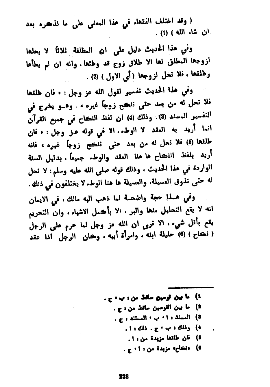 (وَقَدِ اخْتَلَفَ الْفُقَهَاءُ فِي هَذَا الْمَعْنَى عَلَى مَا نَذْكُرُهُ بَعْدُ إِنْ شَاءَ اللَّهُ) وَفِي هَذَا الْحَدِيثِ دَلِيلٌ عَلَى أَنَّ الْمُطَلَّقَةَ ثَلَاثًا لَا يُحِلُّهَا لِزَوْجِهَا الْمُطَلِّقِ لَهَا إِلَّا طَلَاقُ زَوْجٍ قَدْ وَطِئَهَا وَأَنَّهُ إِنْ لَمْ يَطَأْهَا وَطَلَّقَهَا فَلَا تَحِلُّ لِزَوْجِهَا (أَيِ الْأَوَّلِ) وَفِي هَذَا الْحَدِيثِ تَفْسِيرٌ لِقَوْلِ اللَّهِ عَزَّ وَجَلَّ فَإِنْ طَلَّقَهَا فَلَا تَحِلُّ لَهُ مِنْ بَعْدُ حَتَّى تَنْكِحَ زَوْجًا غَيْرَهُ وَهُوَ يَخْرُجُ فِي التَّفْسِيرِ الْمُسْنَدِ وَذَلِكَ أَنَّ لَفْظَ النِّكَاحِ فِي جَمِيعِ الْقُرْآنِ إِنَّمَا أُرِيدَ بِهِ الْعَقْدُ لَا الْوَطْءُ إِلَّا فِي قَوْلِهِ عَزَّ وَجَلَّ فَإِنْ طَلَّقَهَا فَلَا تَحِلُّ لَهُ مِنْ بَعْدُ حَتَّى تَنْكِحَ زَوْجًا غَيْرَهُ فَإِنَّهُ أُرِيدَ بِلَفْظِ النِّكَاحِ هَاهُنَا الْعَقْدُ وَالْوَطْءُ جَمِيعًا بِدَلِيلِ السُّنَّةِ الْوَارِدَةِ فِي هَذَا الْحَدِيثِ وَذَلِكَ قَوْلِهِ صَلَّى اللَّهُ عَلَيْهِ وَسَلَّمَ لَا تَحِلُّ لَهُ حَتَّى تَذُوقَ العسيلة والعسيلة هاهنا الوط لَا يَخْتَلِفُونَ فِي ذَلِكَ وَفِي هَذَا حُجَّةٌ وَاضِحَةٌ لِمَا ذَهَبَ إِلَيْهِ مَالِكٌ فِي الْإِيمَانِ أَنَّهُ لَا يَقَعُ التَّحْلِيلُ مِنْهَا وَالْبِرُّ إِلَّا بِأَكْمَلِ الْأَشْيَاءِ وَأَنَّ التَّحْرِيمَ يَقَعُ بِأَقَلِّ شَيْءٍ أَلَا تَرَى أَنَّ اللَّهَ عَزَّ وَجَلَّ لَمَّا حَرَّمَ عَلَى الرَّجُلِ (نِكَاحَ) حَلِيلَةِ ابْنِهِ وَامْرَأَةِ أَبِيهِ وَكَانَ الرَّجُلُ إِذَا عَقَدَ
